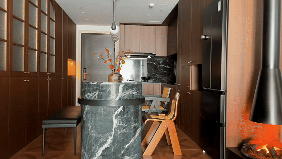 收纳美学的弧形柜门设计有效地提升了空间的氛围感。同时,餐厅的岛台,通过其半奢石圆柱造型的巧妙处理,也使得整体空间变得更加高级,低调里又暗藏了不俗的高级点缀。