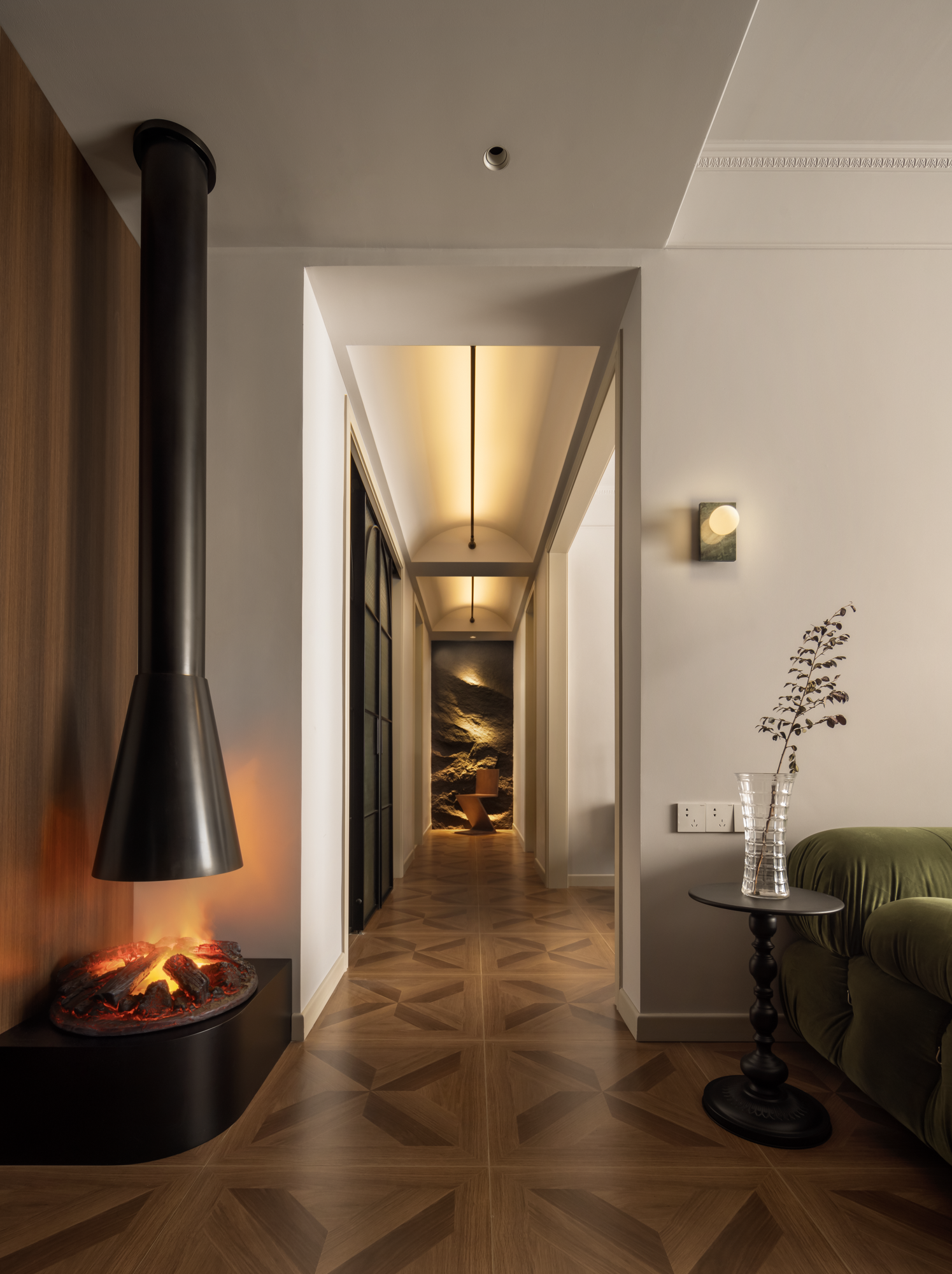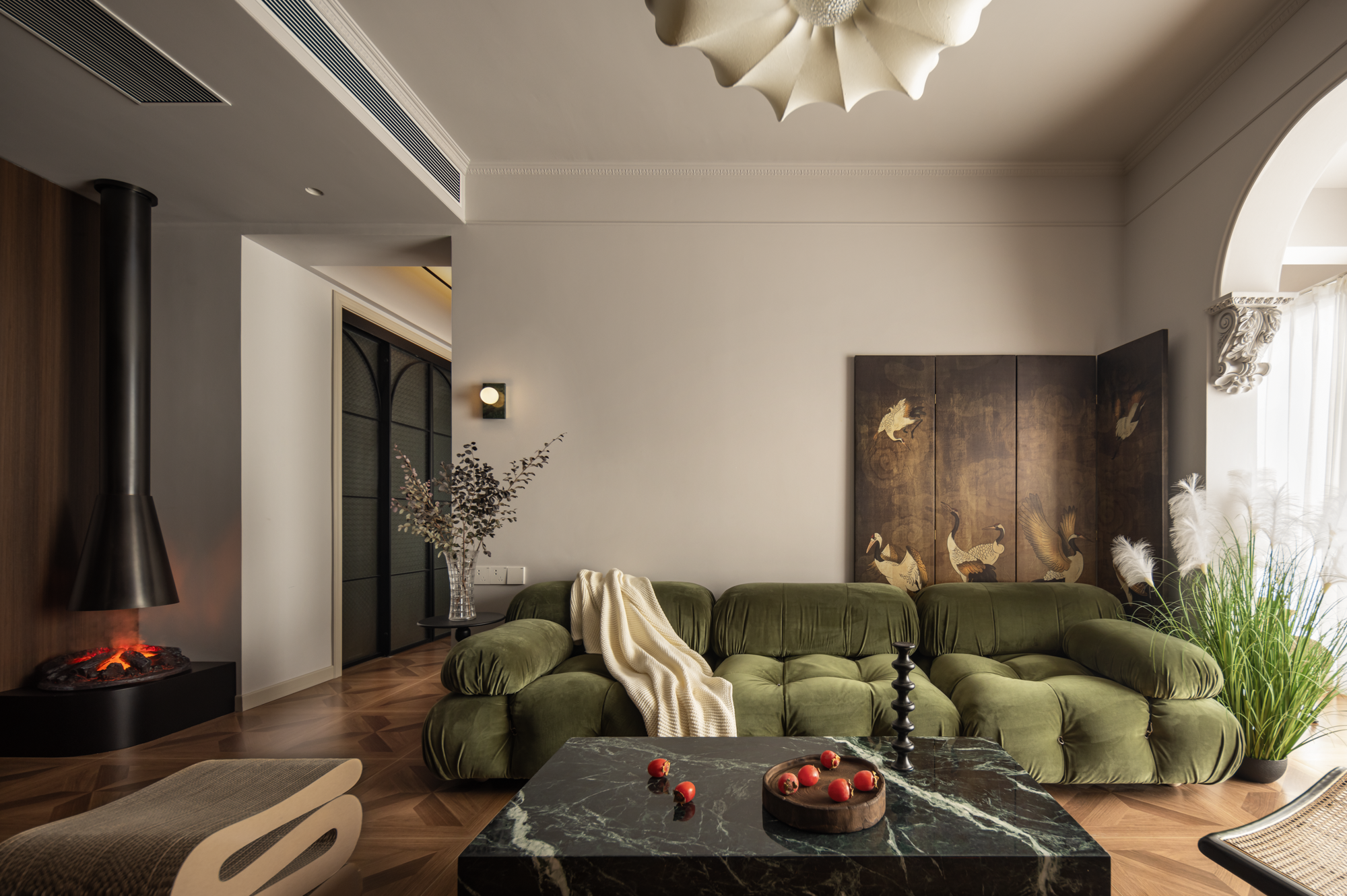 暖炉的氛围感拉,将旧时堂前的温暖,融入了现代的空间景致里