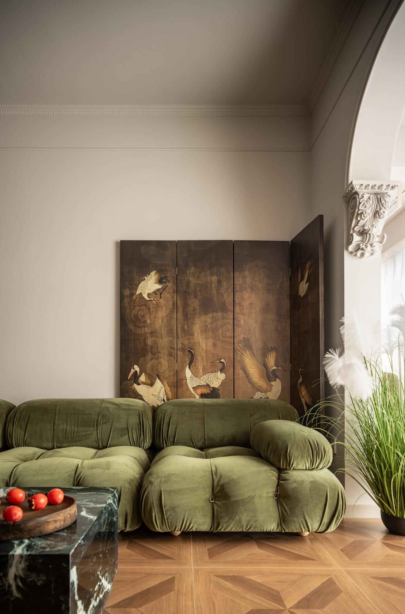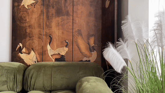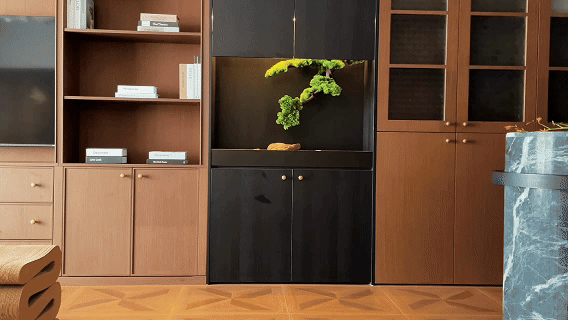 沙发背景,运用宋氏美学的文化审美的高级屏风,既展现出卓越的美学品味,又避免了物品摆放与日常打理的繁琐。