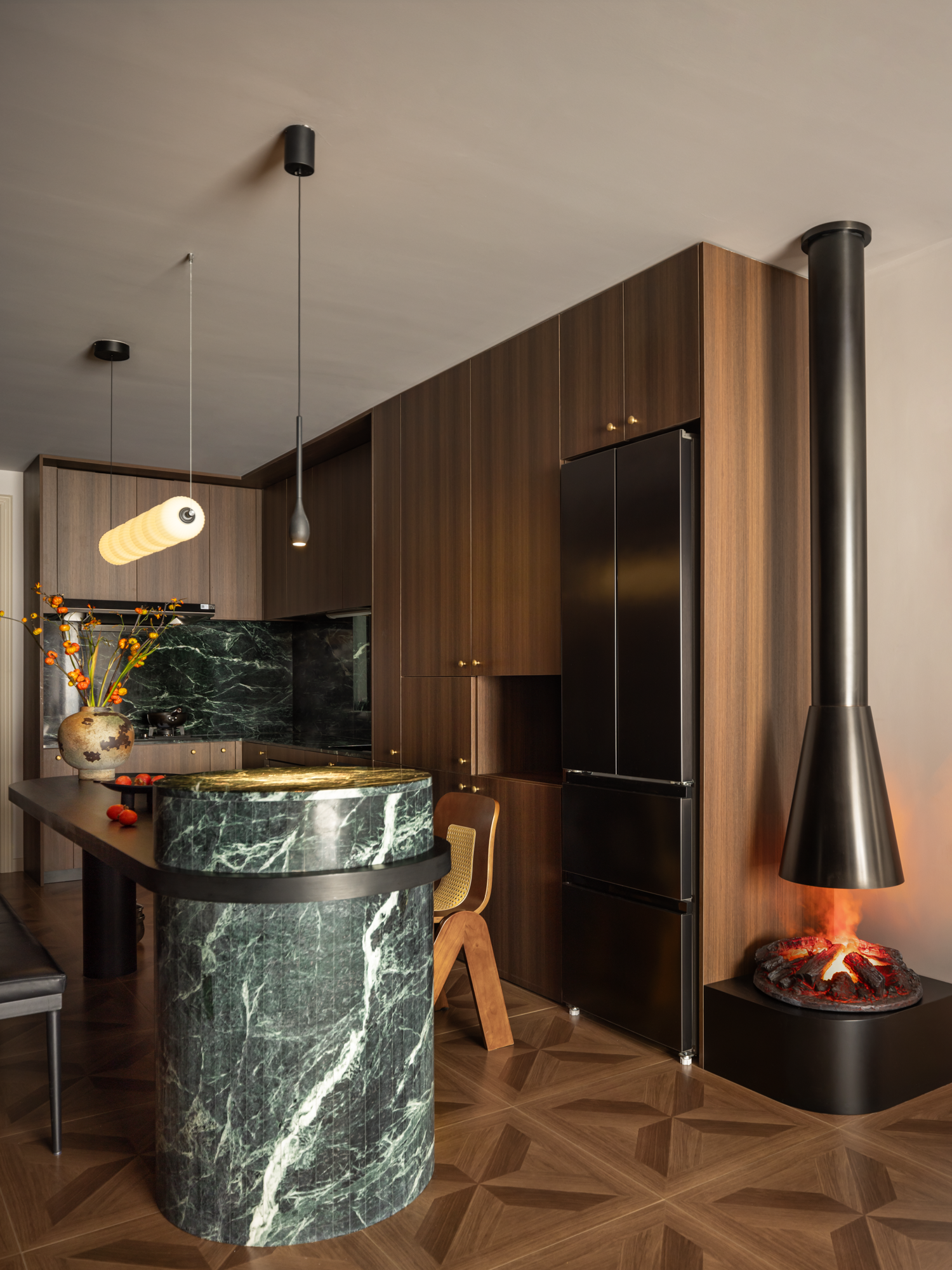 用户体验:之前想储物柜那么多会不会拥挤不堪,同时还要满足小孩的跑动空间,没想到完全出乎预料之外,空间既不显得拥挤,又能完美的储物。实现了开放式厨房和西厨的电器及储物的拓展功能。同时还有炉火,植物端景让呆板的空间瞬间活跃起来,情绪氛围感拉满。