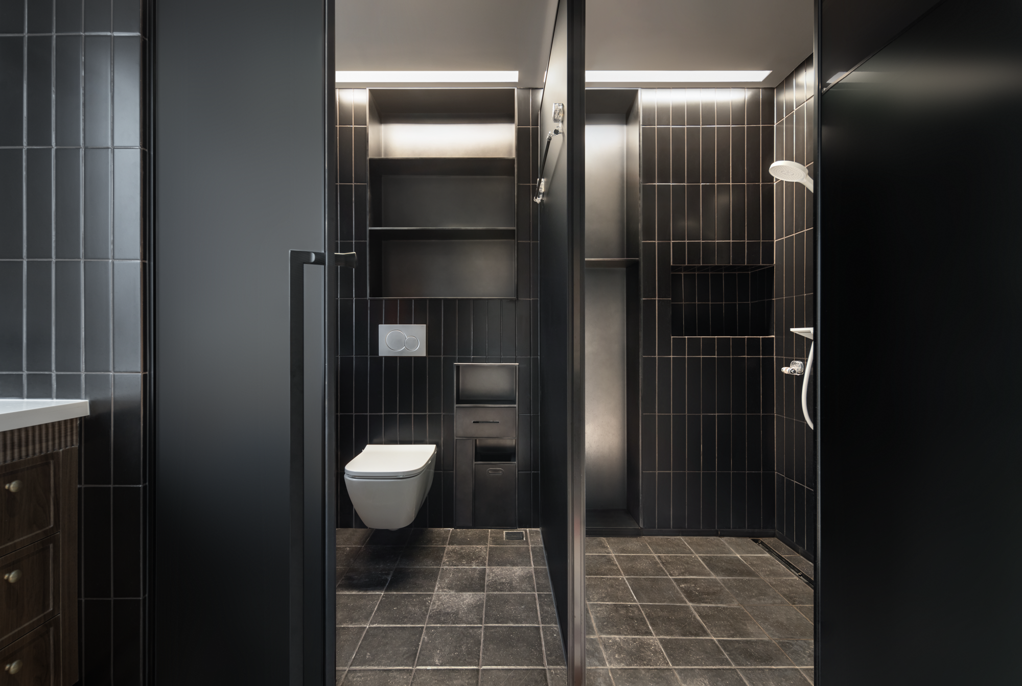 浴室极致黑色基调,既高级清爽又实用,融入了整体风格,既是独立空间又把握了整体效果。