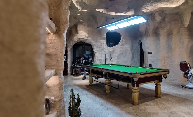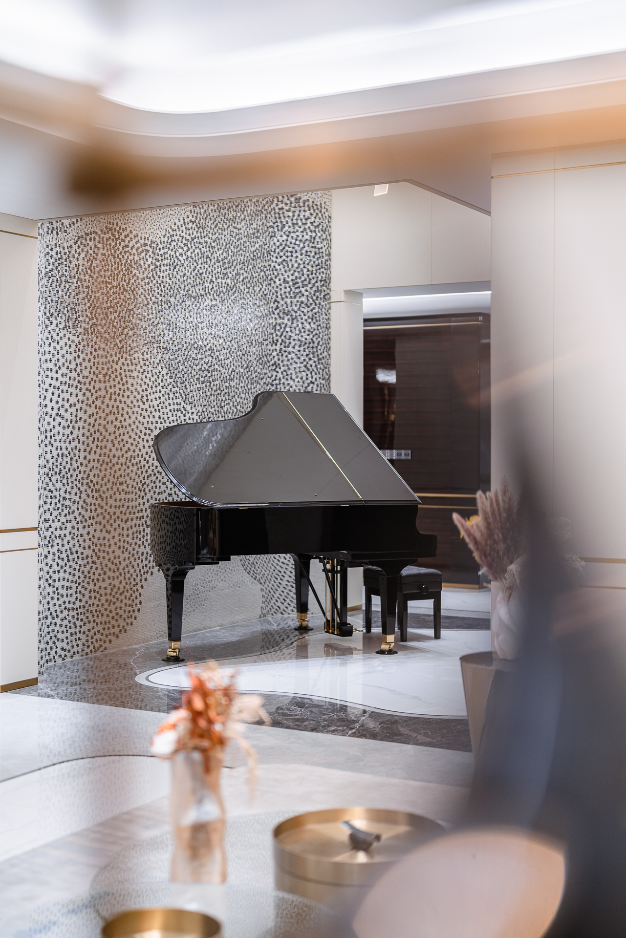 室内空间开阔通透,挑高的客厅引入充足自然光,大型落地窗让美景尽收眼底。客厅中央悬挂着华丽的水晶吊灯,地面铺设高档的大理石瓷砖,散发着奢华气息。