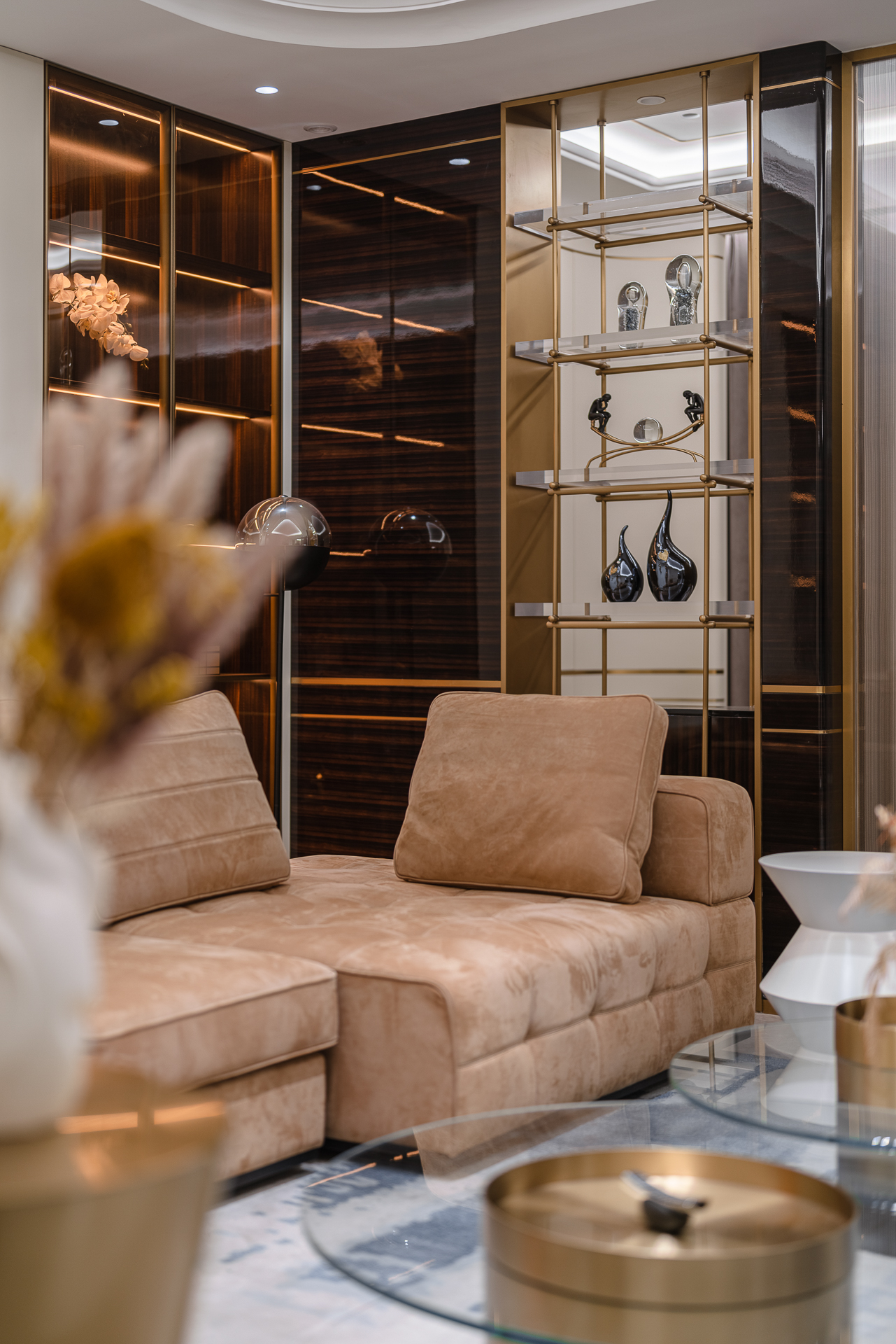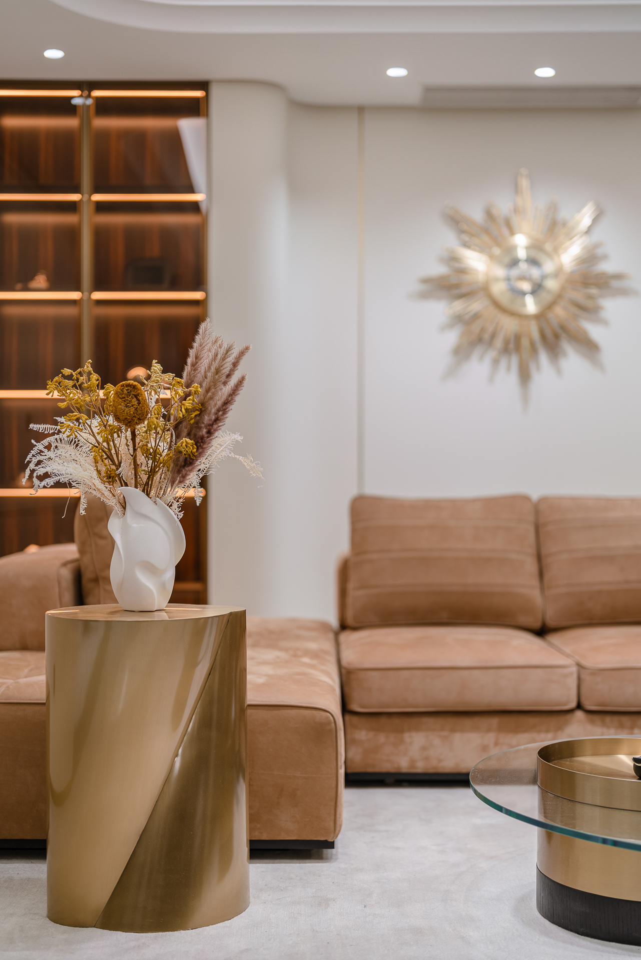 家具选择注重品质与舒适度,采用柔软的皮革和细腻的织物。色彩搭配以中性色为主调,局部点缀金色和宝蓝色,增添活泼与时尚。