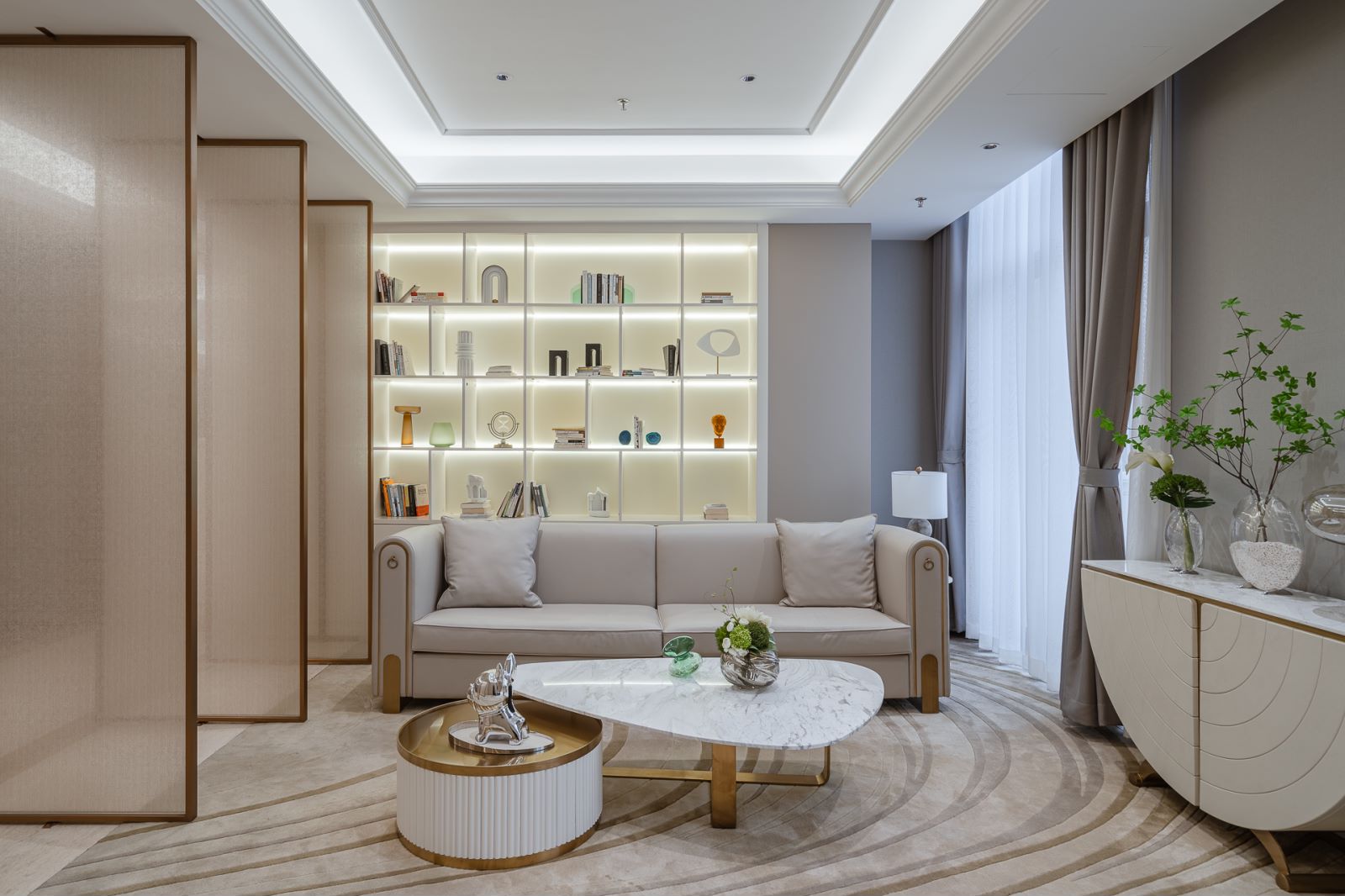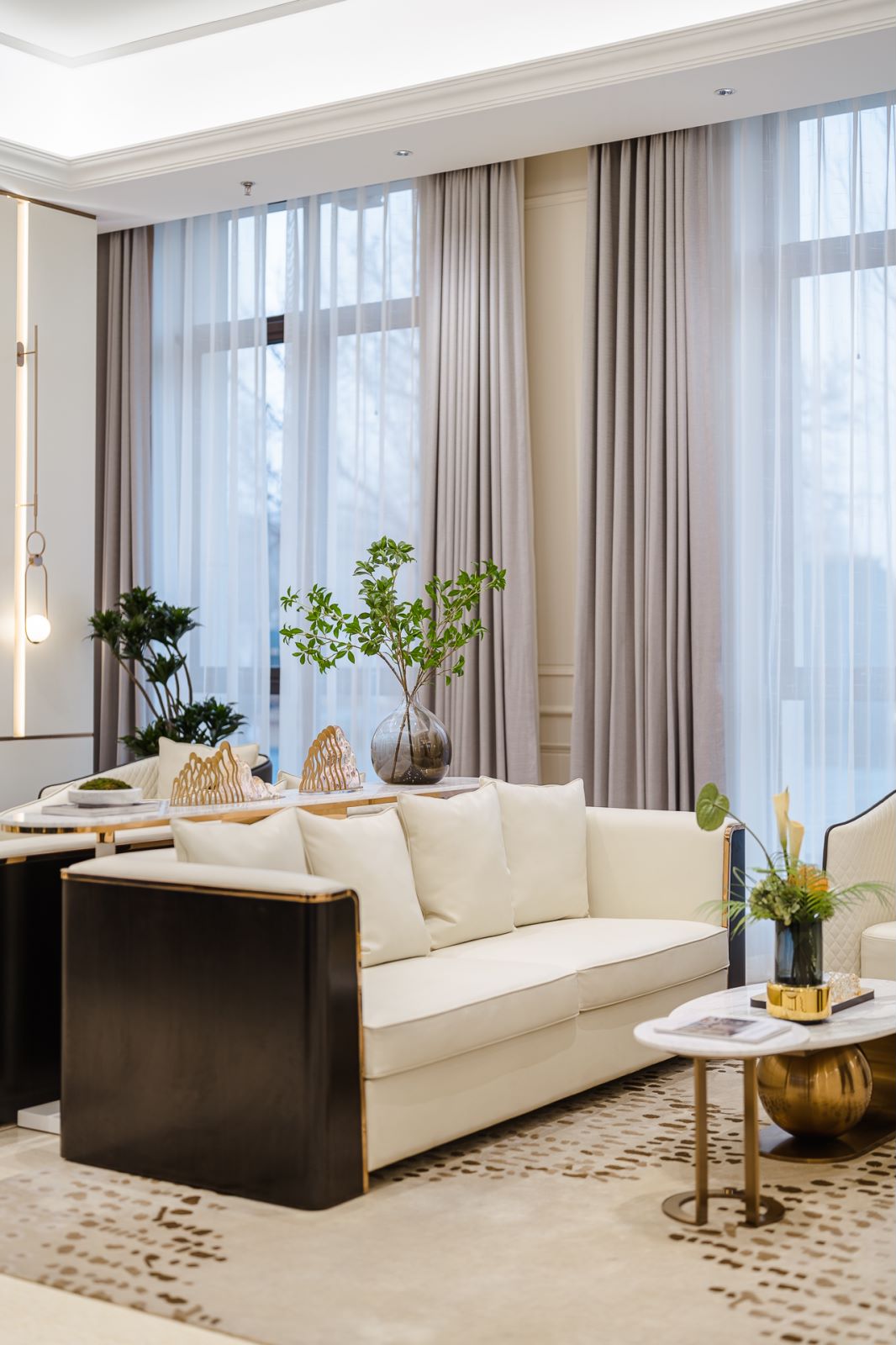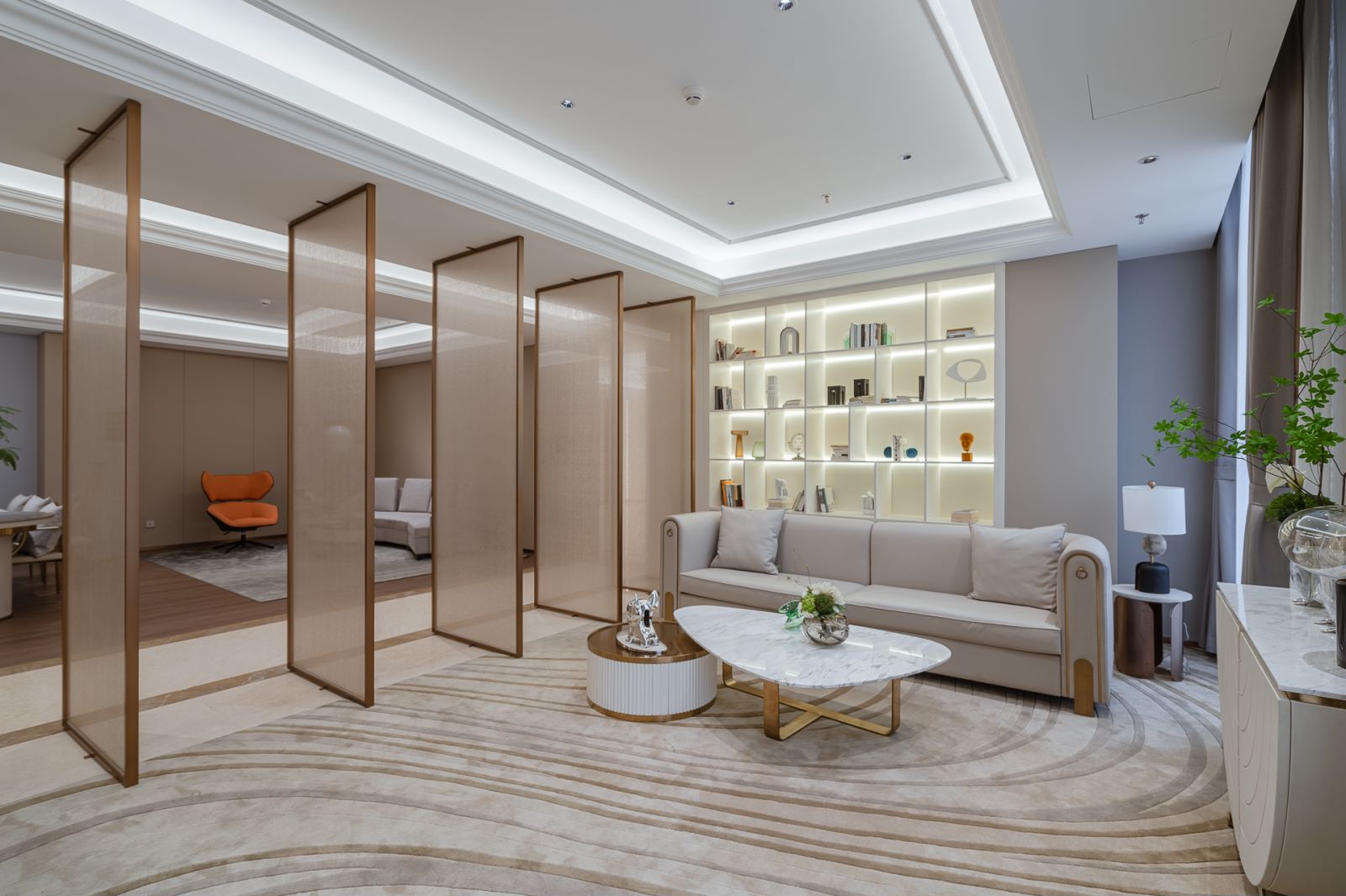 空间布局:遵循“少即是多”的原则,通过合理规划功能分区,使整个空间在形象与功能上更加契合楼盘的法式风格和浪漫情调。法式轻奢风格在这里得到了极致的演绎,既展示了对美好家居生活的向往与追求,也体现了现代精致生活的理念。这种设计不仅满足了访客对高端生活方式的期待,更为他们提供了一种尽情享受美好生活的态度。