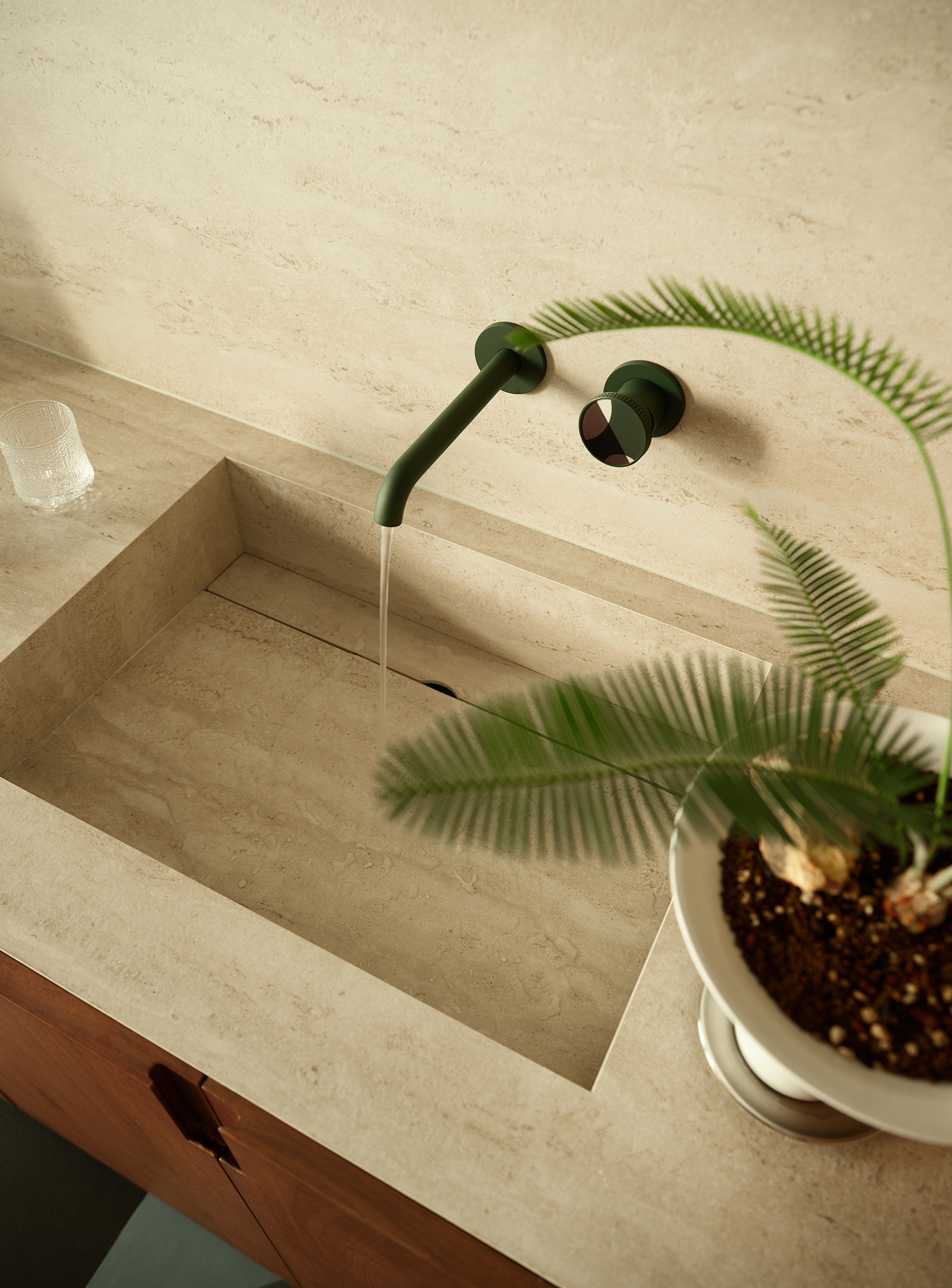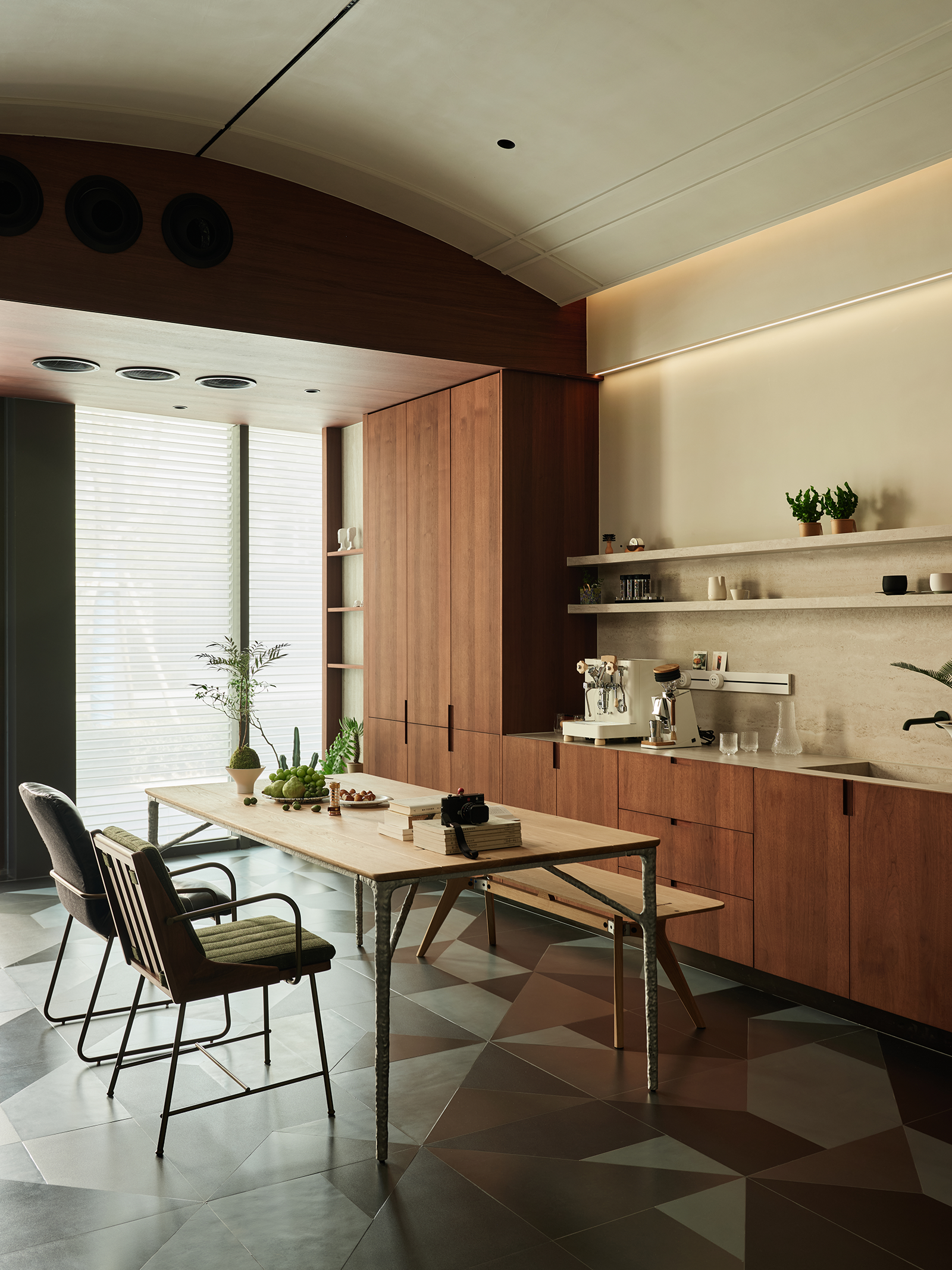 为了将更多的自然光线引入室内,同时也为了保证一定的私密性,设计师用一整面的折叠玻璃门做了隔断,为内部空间带来光影的游走。