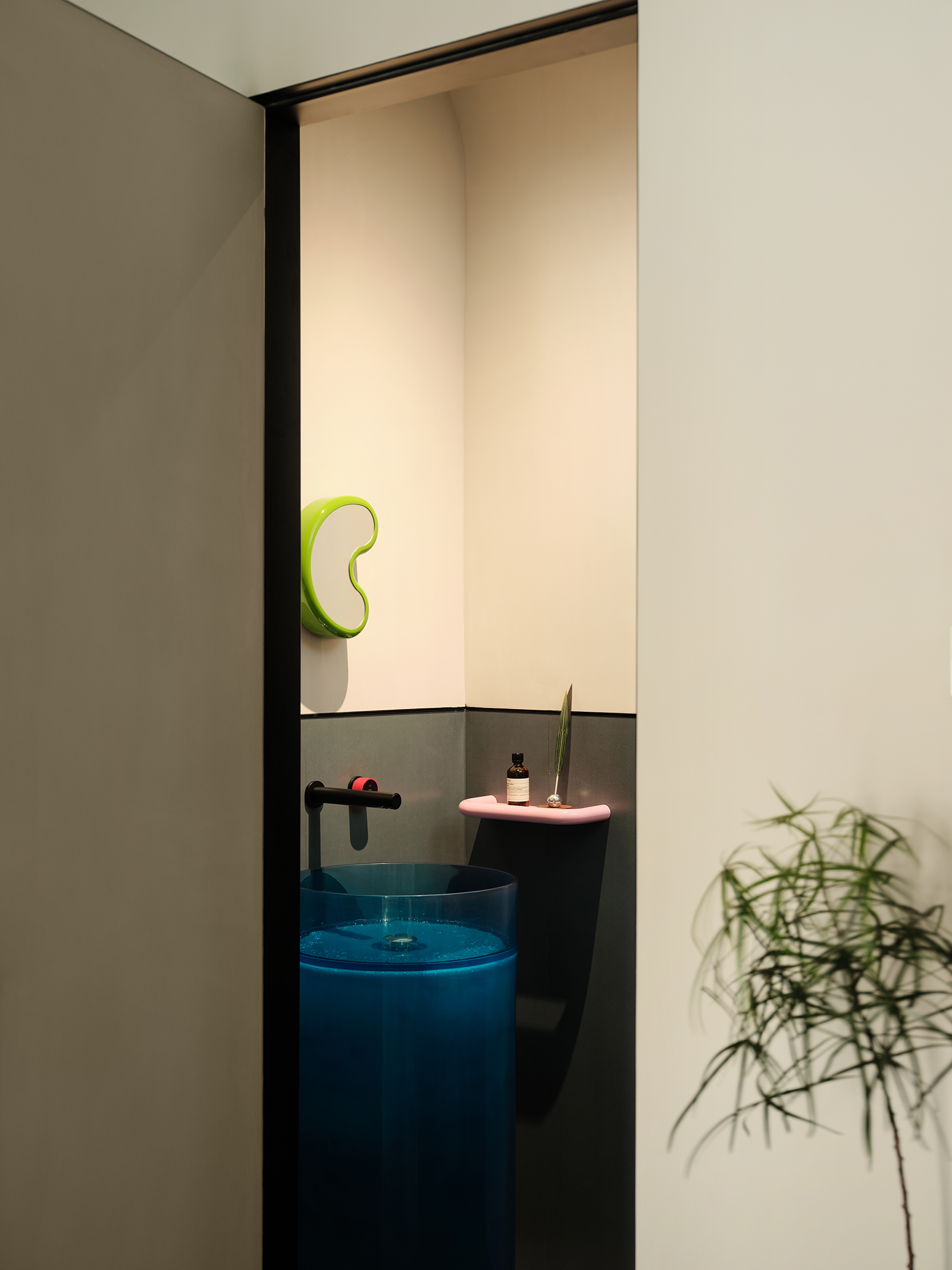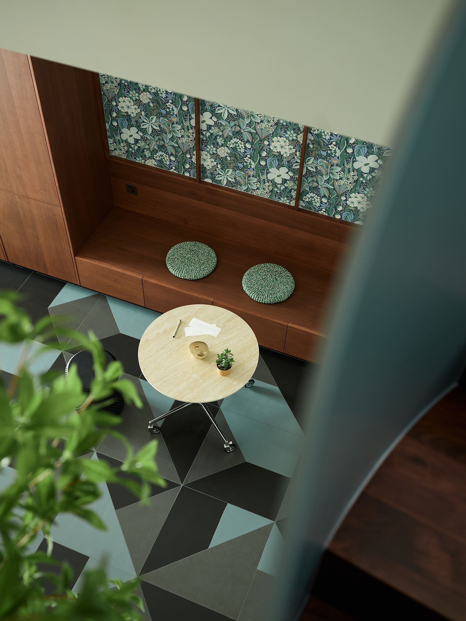 设计师以米灰、米白和木色作为主色调,并精心点缀了草绿、湖蓝等多种色彩元素,让空间呈现温馨又活泼的氛围。尤其是地面的蓝色系复古拼花地砖,洋溢着生机与活力,别有一番韵味。