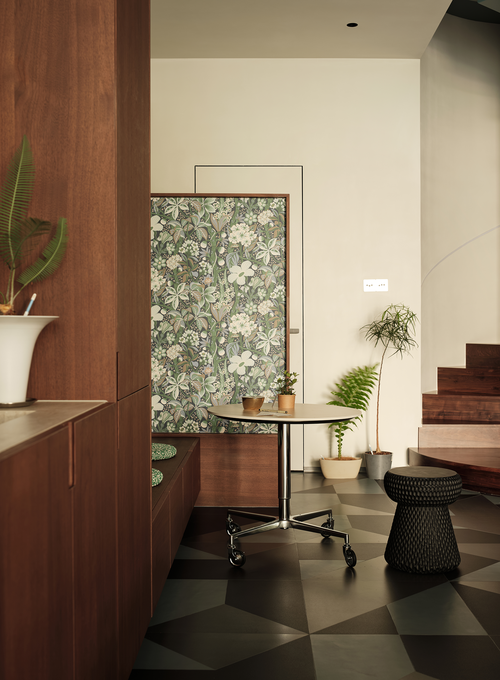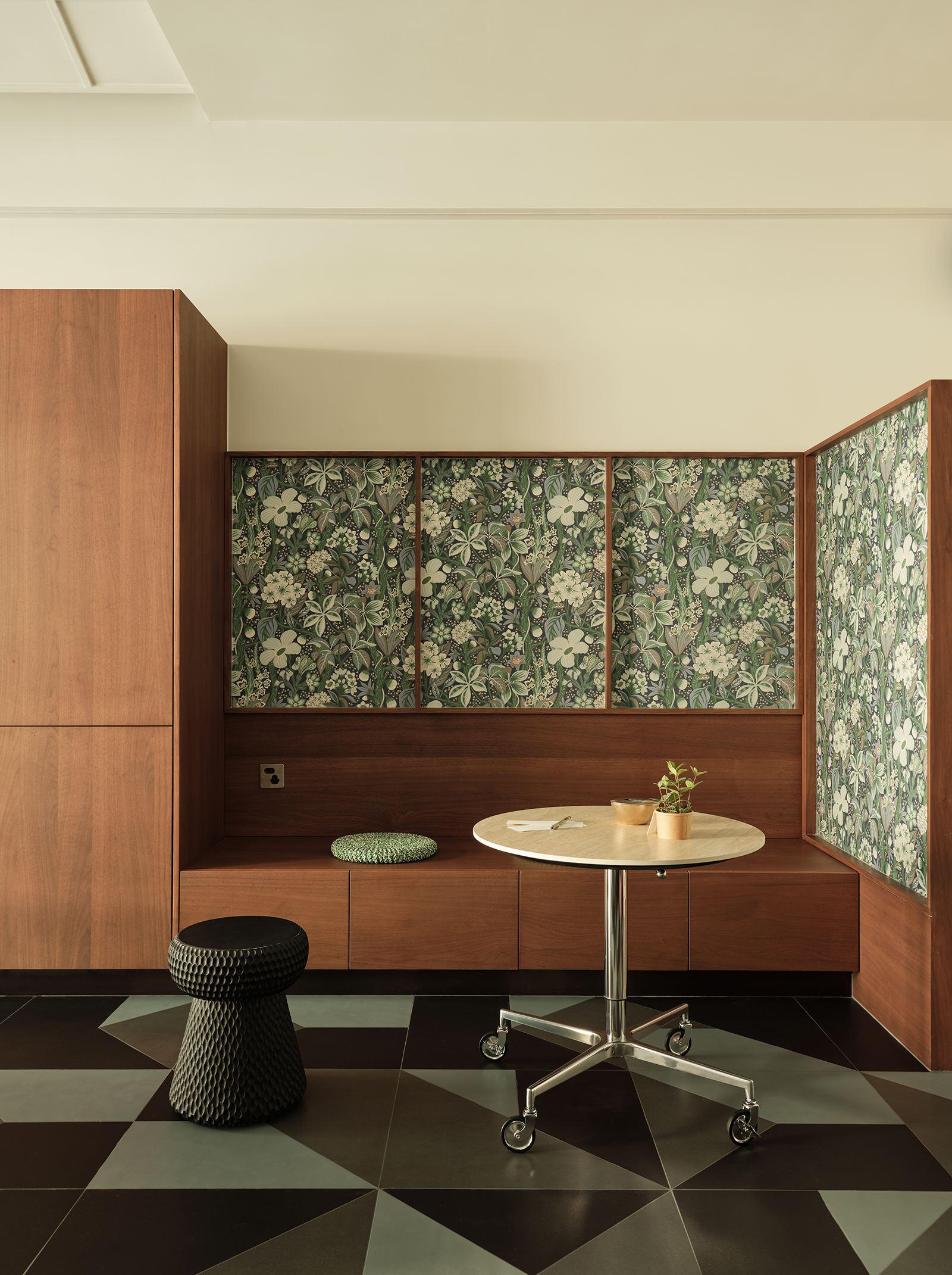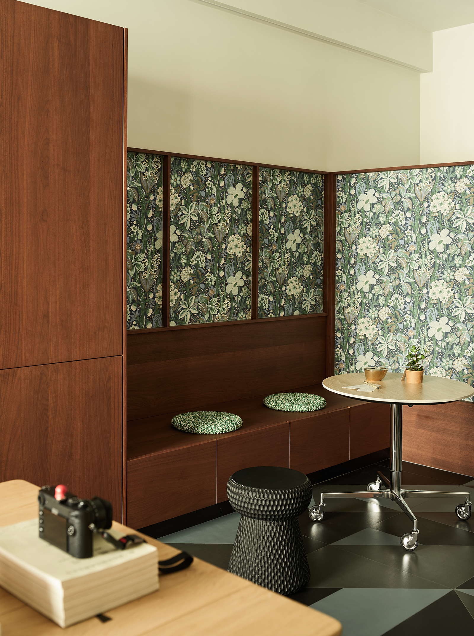 设计选材:用材方面,设计师偏爱胡桃木的温润质感。木质餐桌椅和墙上的展示柜形成呼应,看上去和谐统一。转角处,一组绿色清新的花卉图为背景,搭配一张可移动小餐桌,以及一把黑色藤编椅,随手一拍便是自己所喜爱。平日里,约几位好友一边聊天一边喝咖啡,尽情享受闲暇和惬意。
