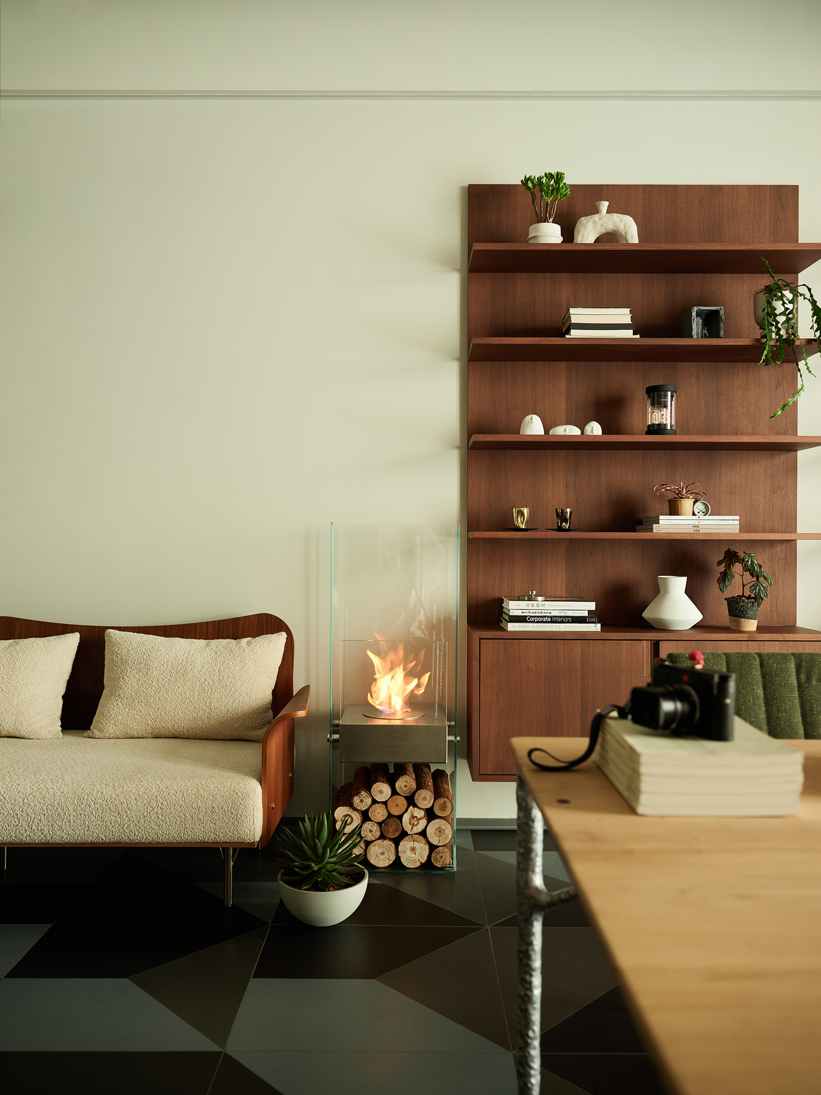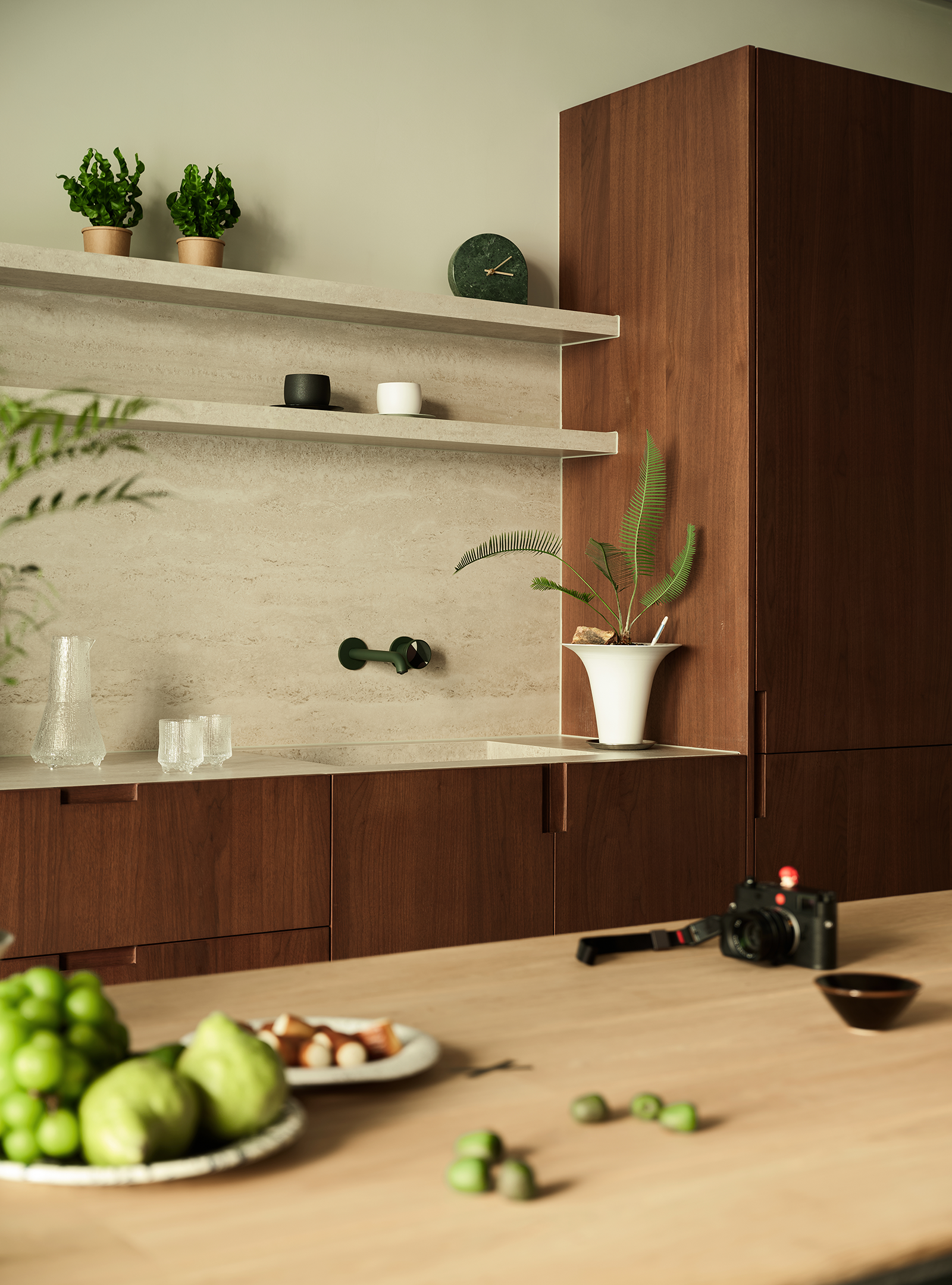 用材方面,设计师偏爱胡桃木的温润质感。木质餐桌椅和墙上的展示柜形成呼应,看上去和谐统一。