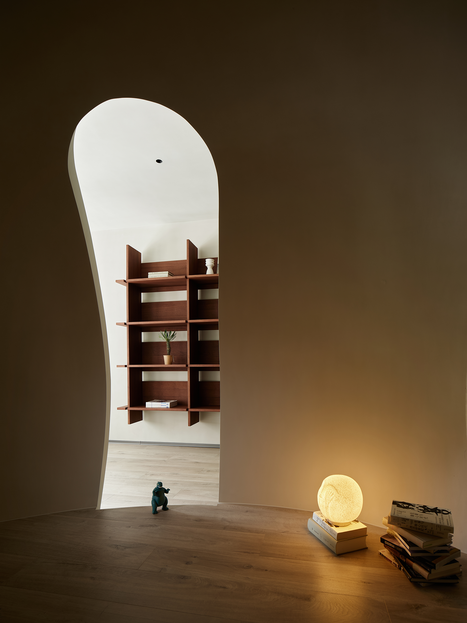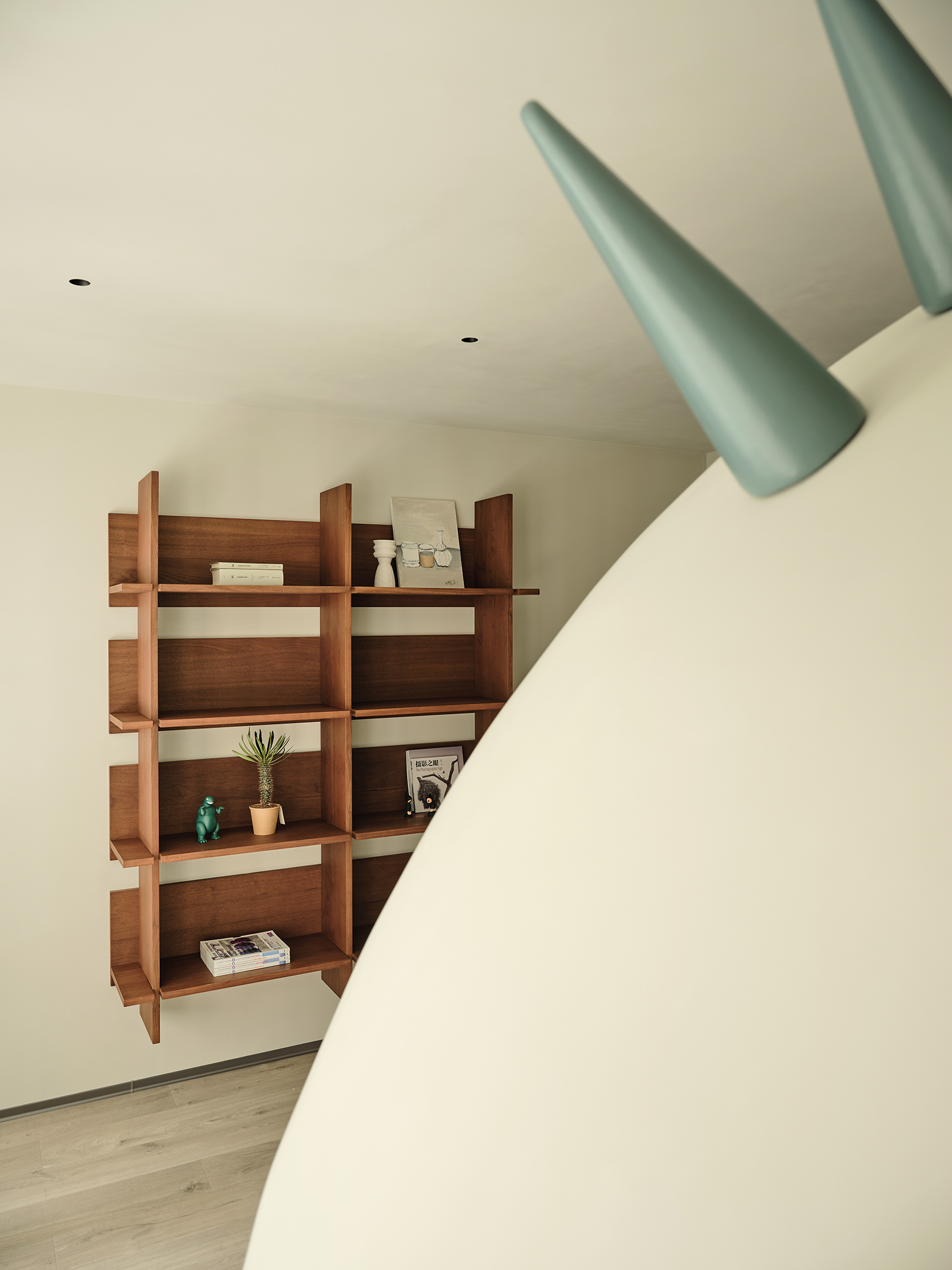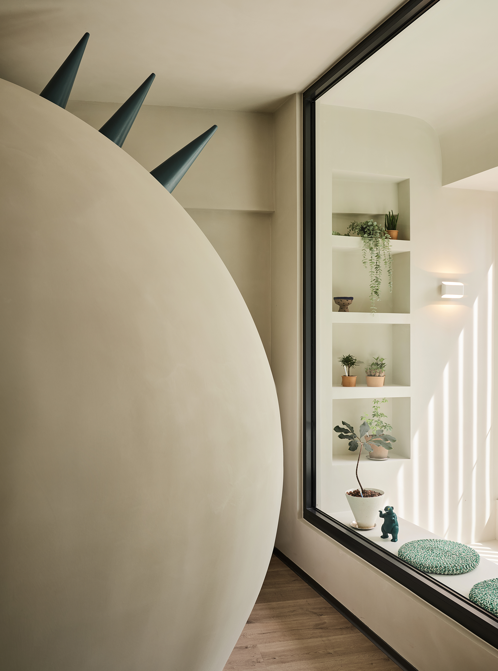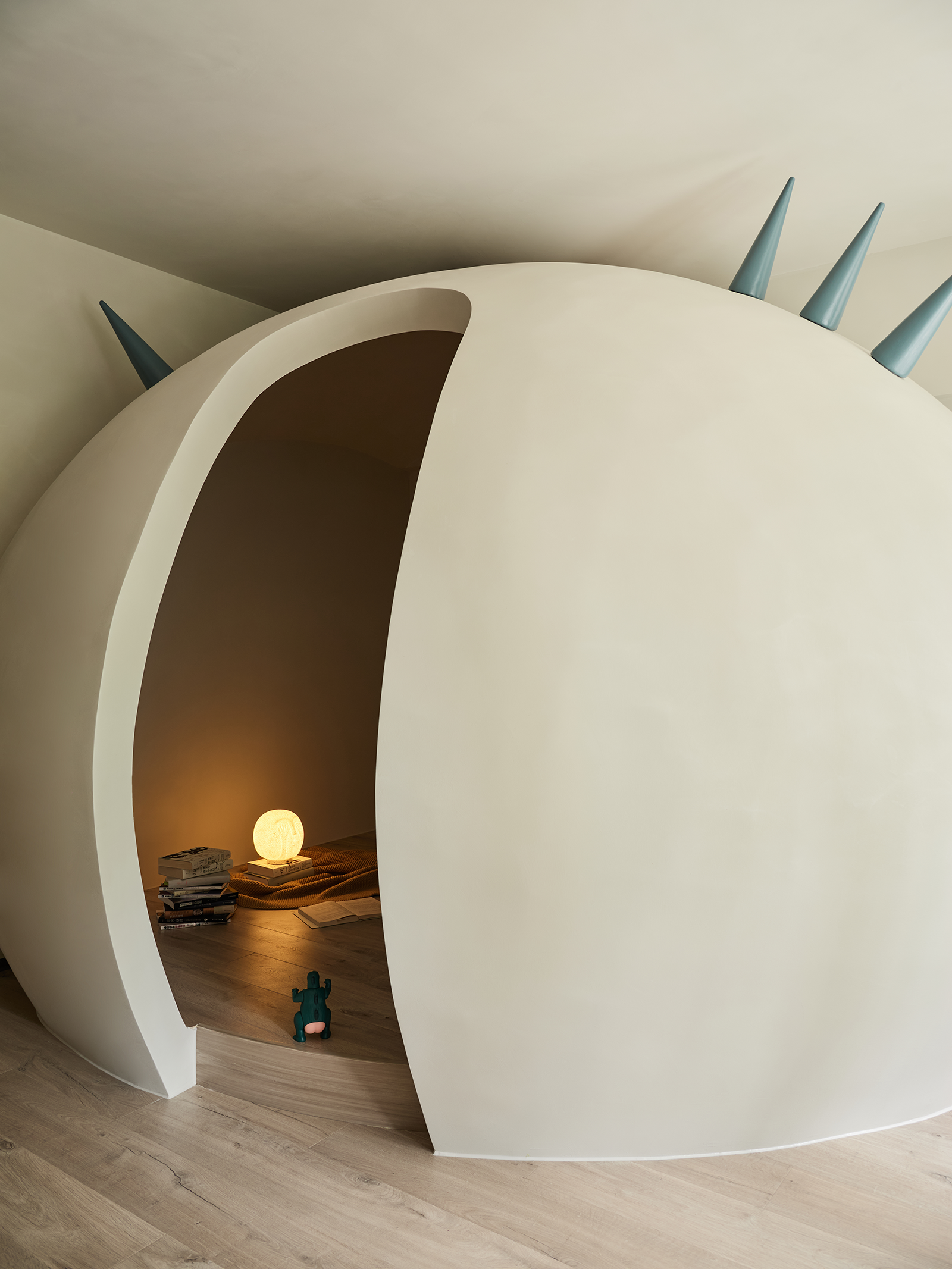 只见一个巨大的恐龙蛋造型几乎占据了全部视野,原本用作卧室的空间,摇身一变成为孩子的游乐场和“秘密基地”。别具特色的小怪兽犄角成了点睛之笔,为这个游乐空间平添了许多俏皮和可爱,令人仿佛身处童话世界。