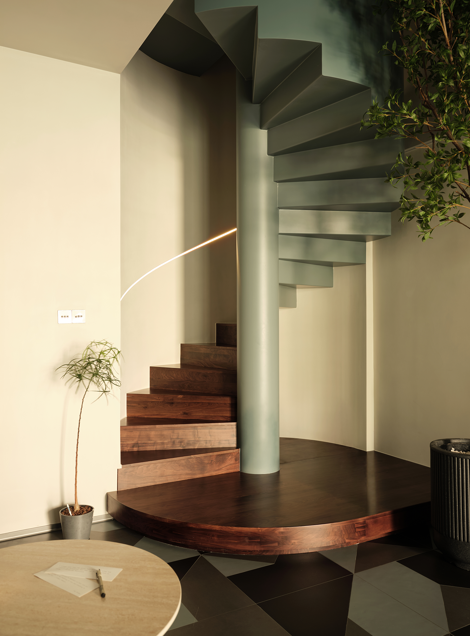 空间布局:步入室内,独特的圆弧形吊顶,圆润收边与其他弧形线条相呼应,赋予了整个空间婉约优雅的基调,丰富了视觉感受的同时,也让空间更显宽敞明亮。设计师以米灰、米白和木色作为主色调,并精心点缀了草绿、湖蓝等多种色彩元素,让空间呈现温馨又活泼的氛围。尤其是地面的蓝色系复古拼花地砖,洋溢着生机与活力,别有一番韵味。