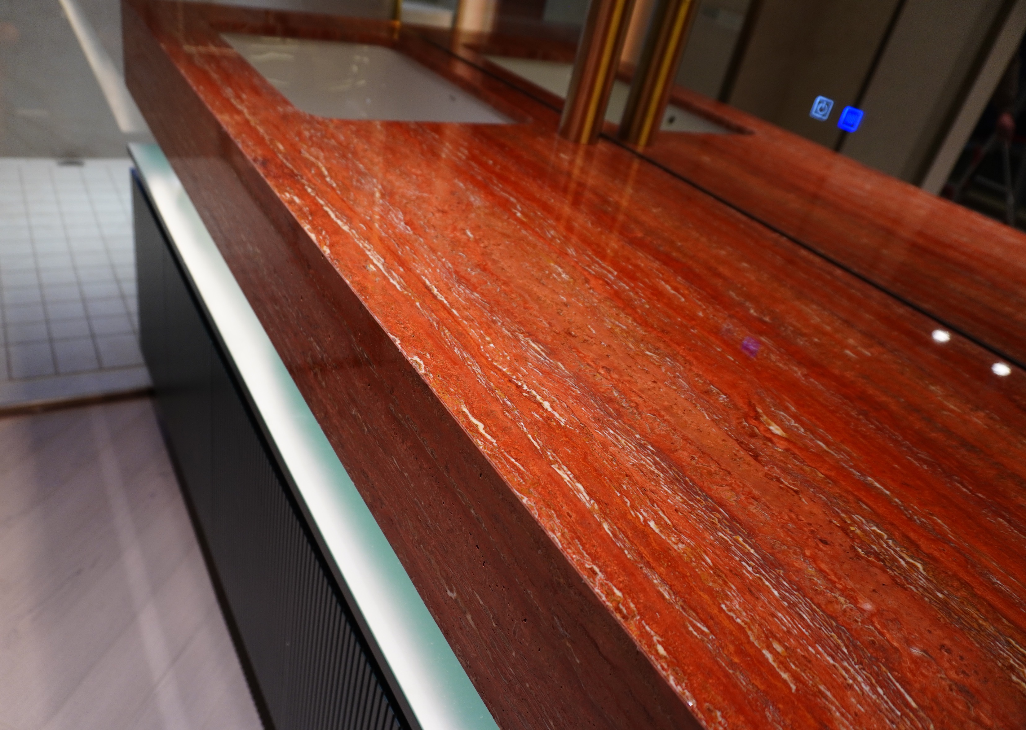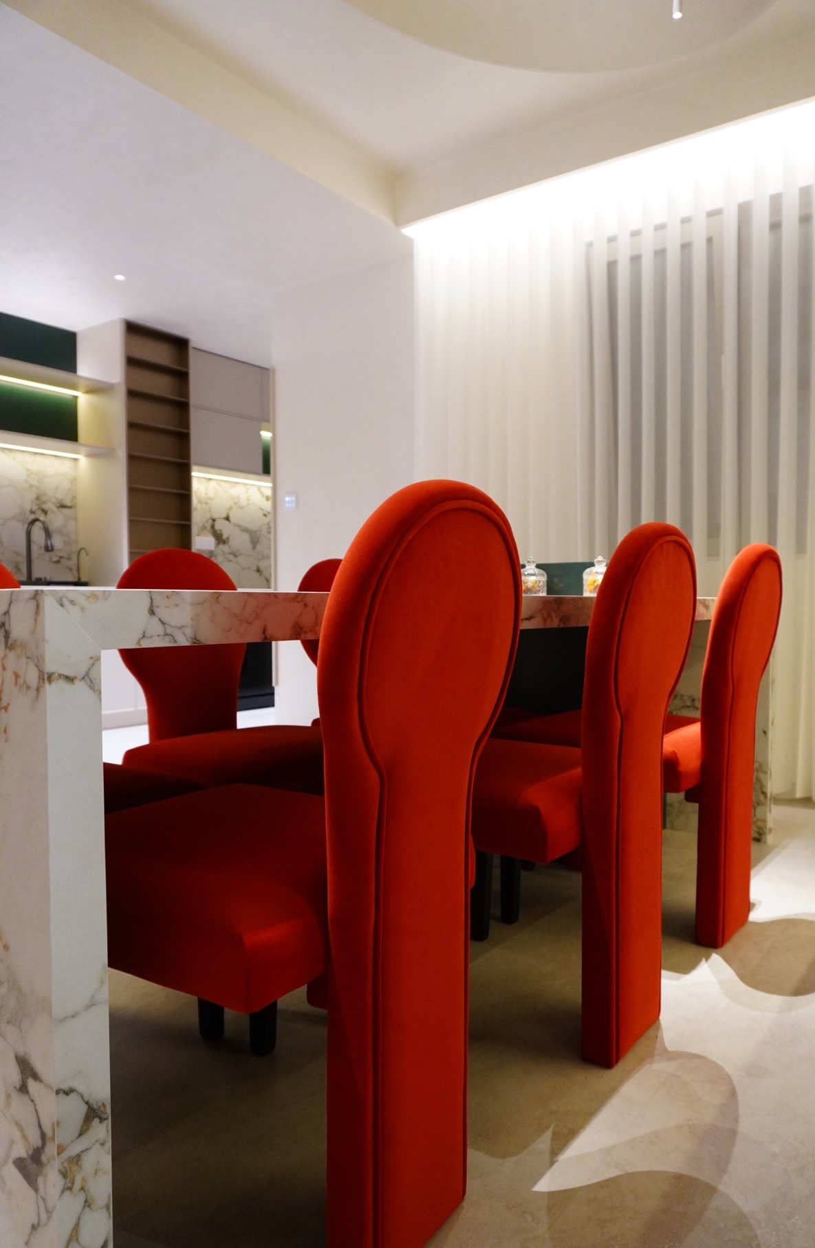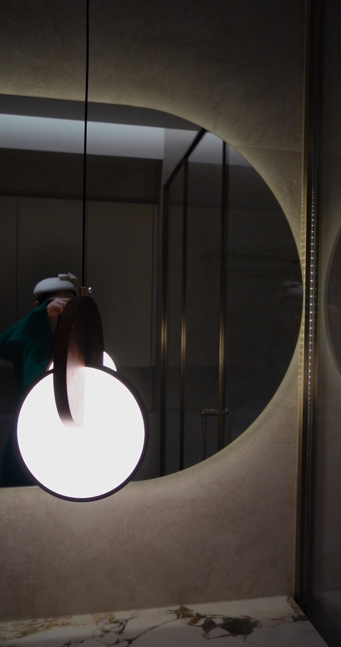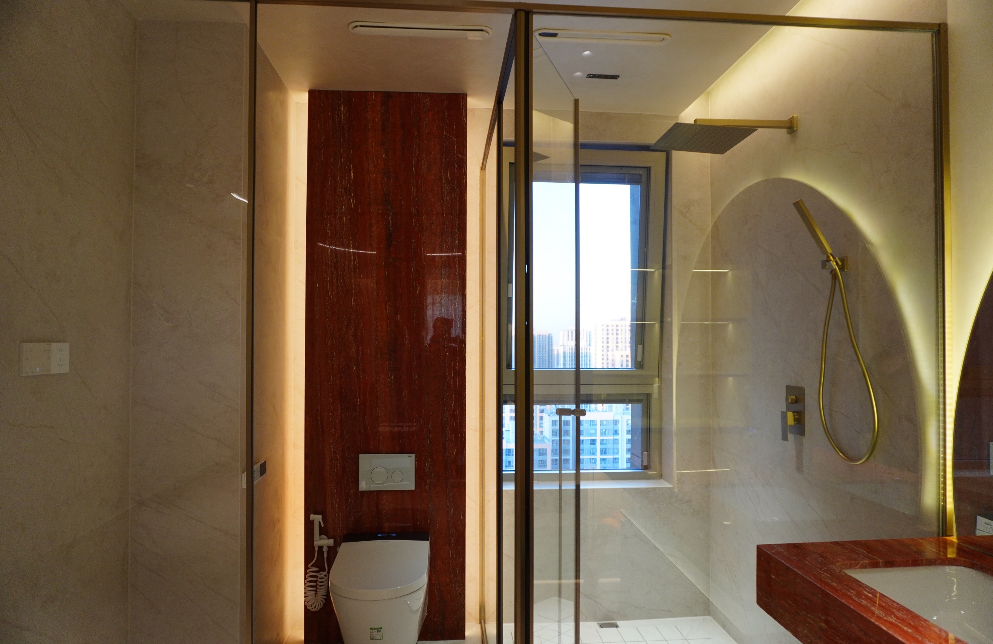 设计选材:设计选材大理石瓷砖,为空间增添了高档、优雅气质。跳色选用天然红洞石,为空间注入大自然的真谛真实景象。墙面:顶面全部统一色调,采用艺术涂料设计,营造出图特的整体质感跟视觉效果。