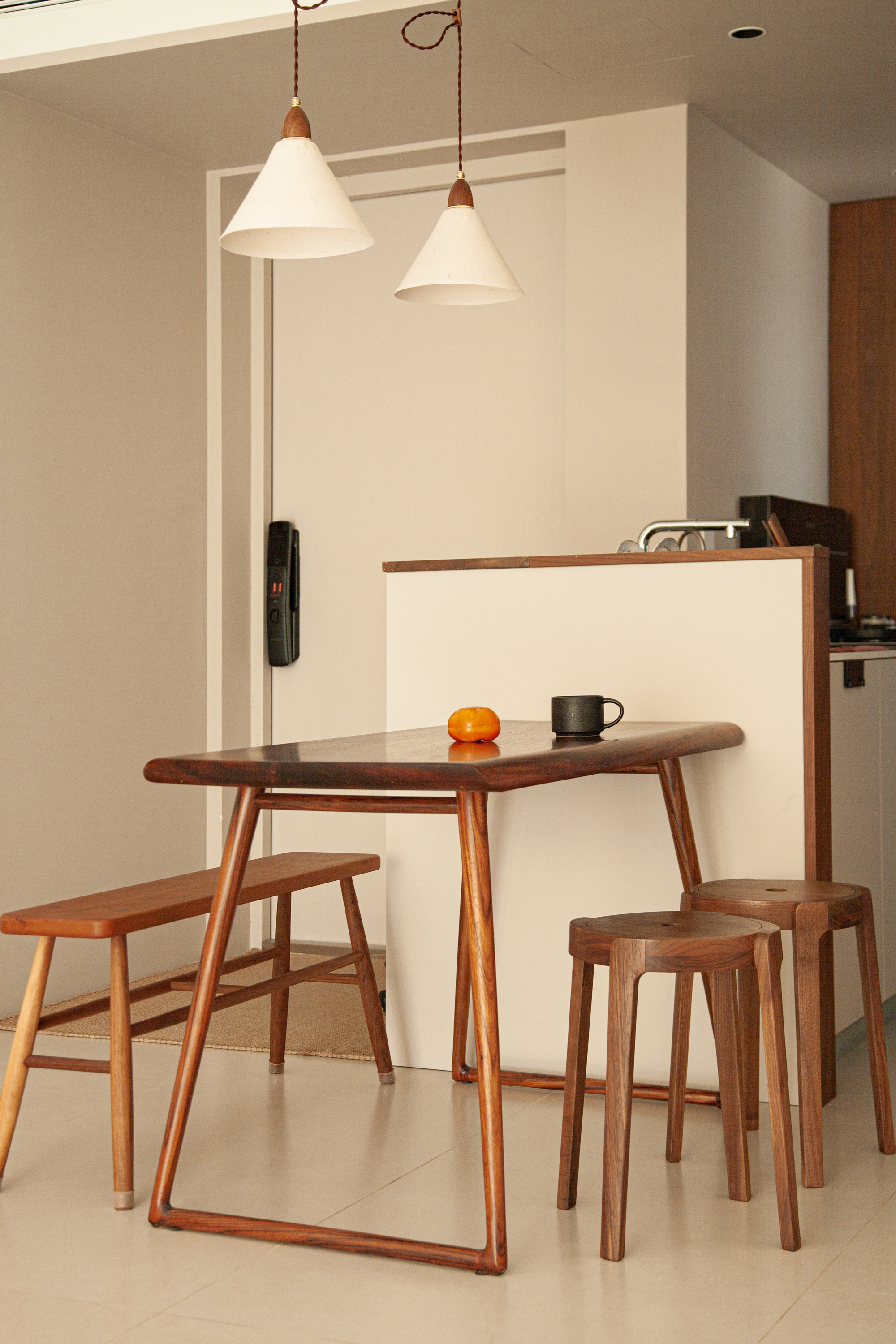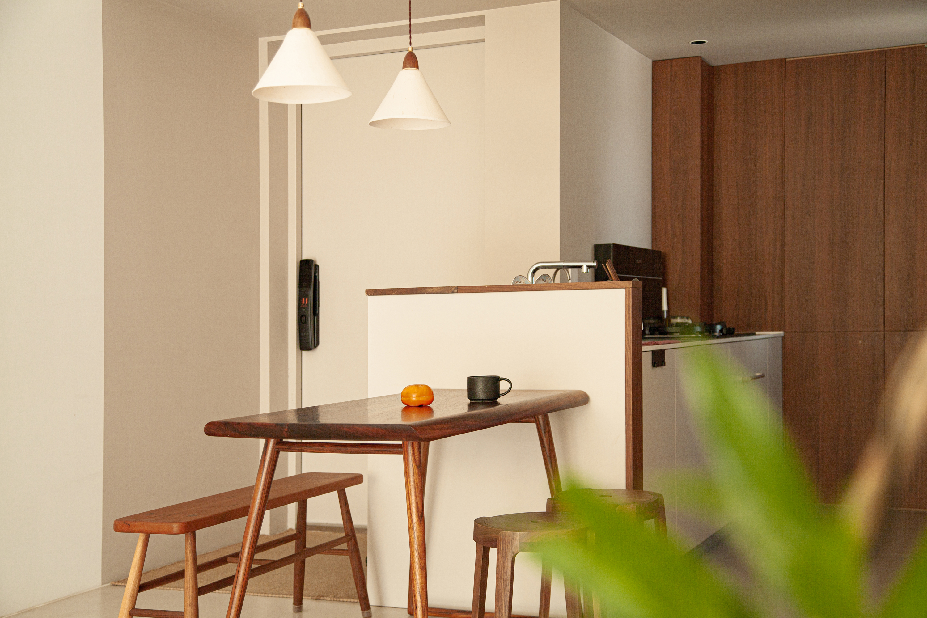 木质餐桌与矮凳搭配,吊灯以柔和线条点缀空间,与厨房木纹橱柜相呼应。