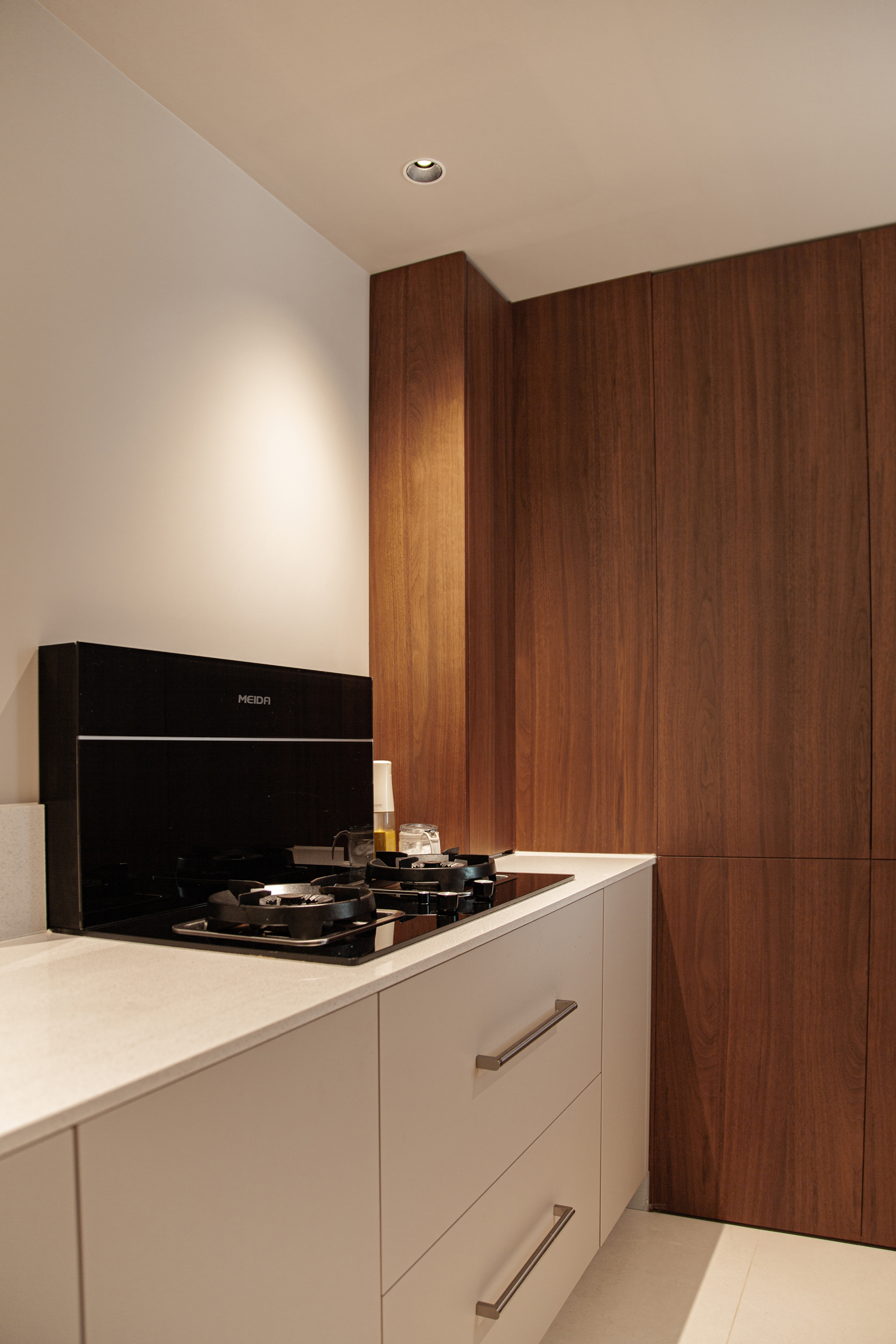 现代化厨具与木纹柜体结合,实用性与质感兼具。