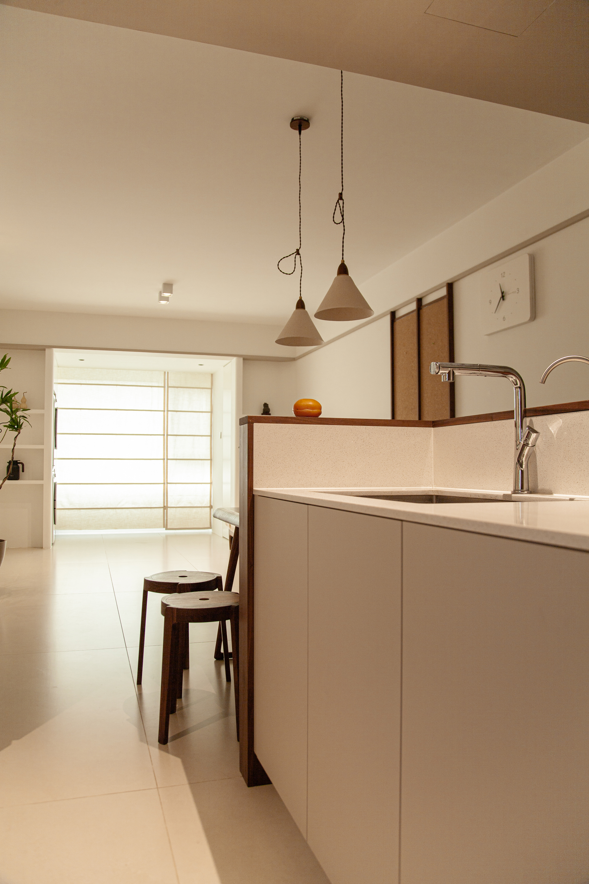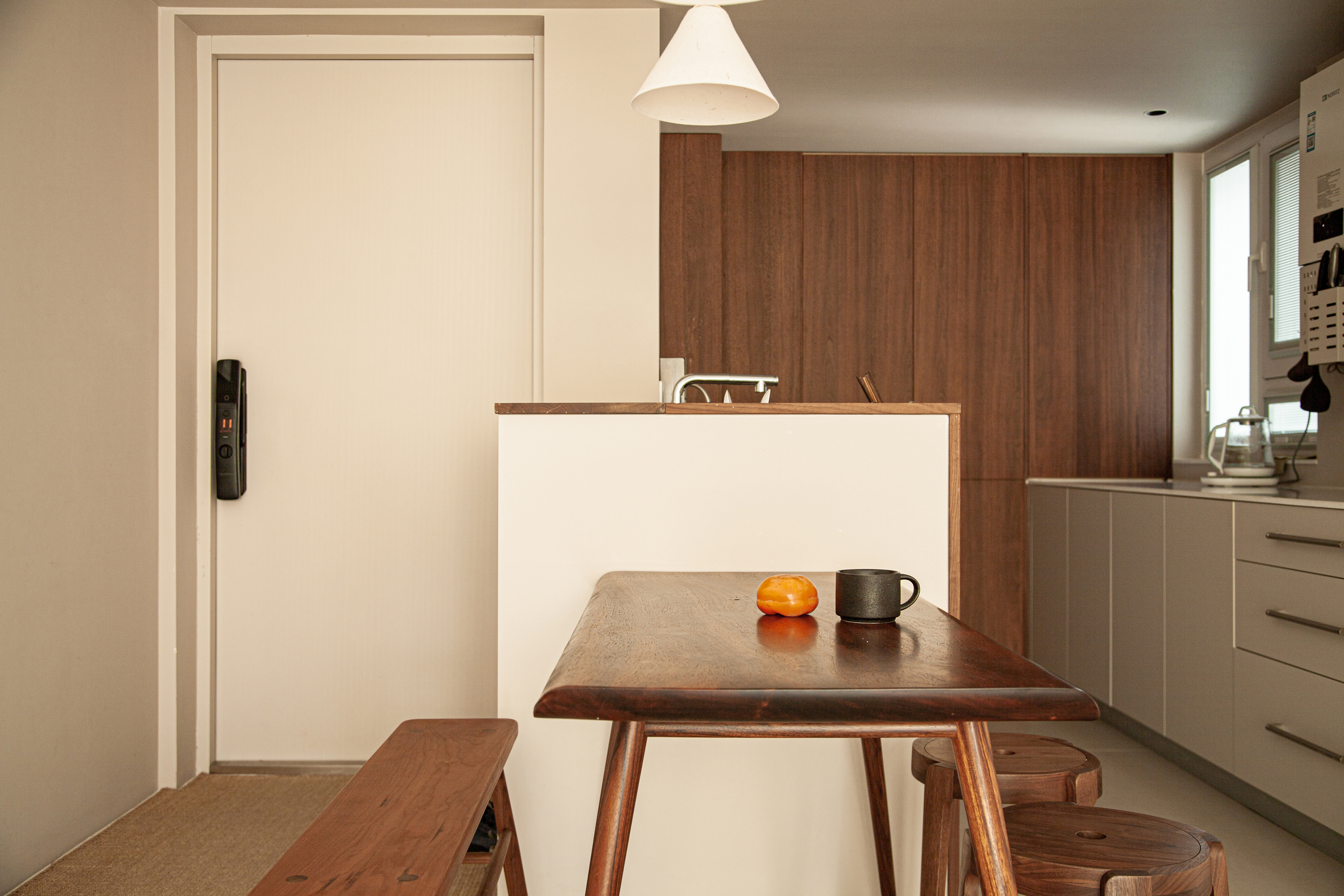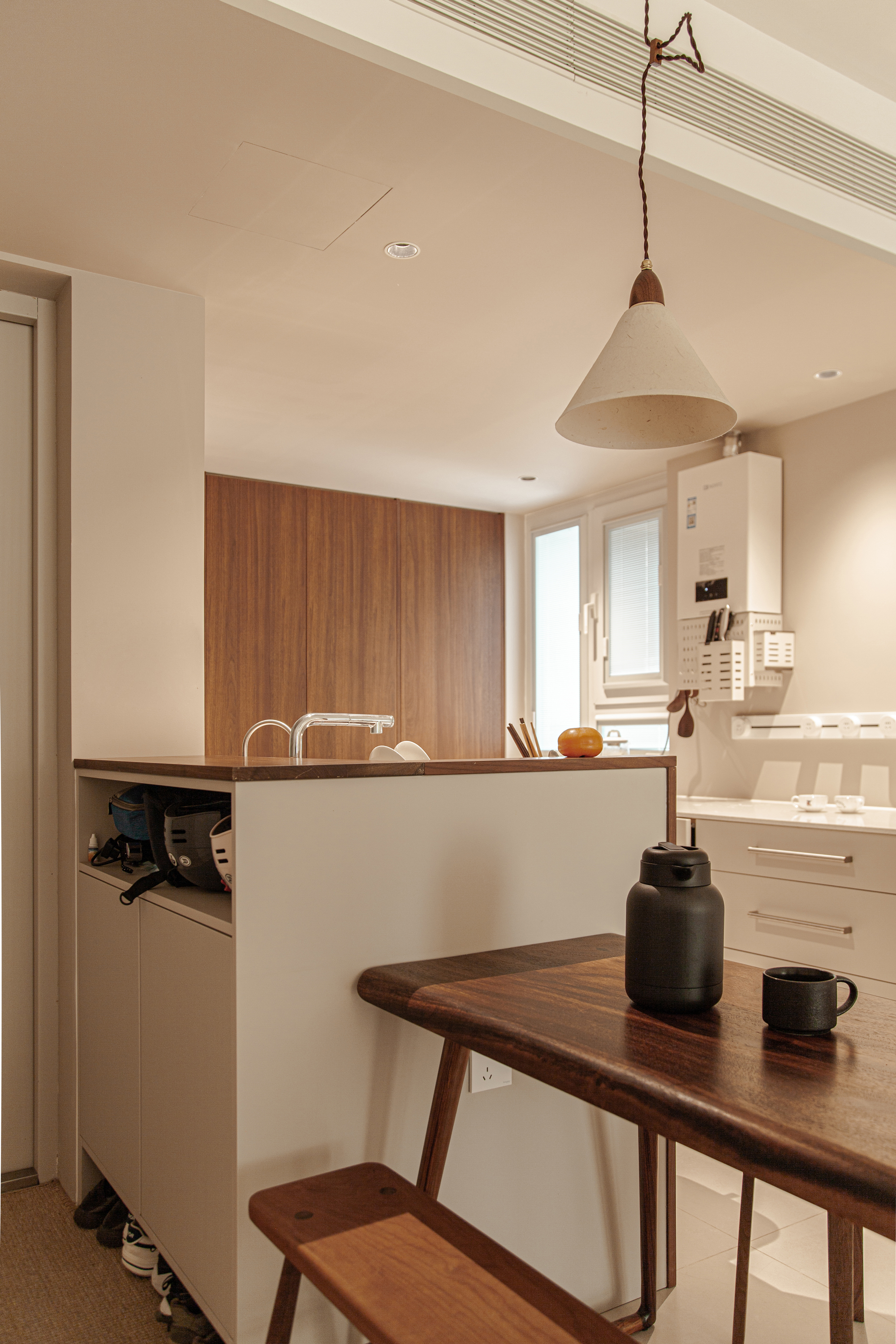 从餐厅延伸至厨房的设计,木质餐桌与白色橱柜形成色彩对比,功能与美学兼具。