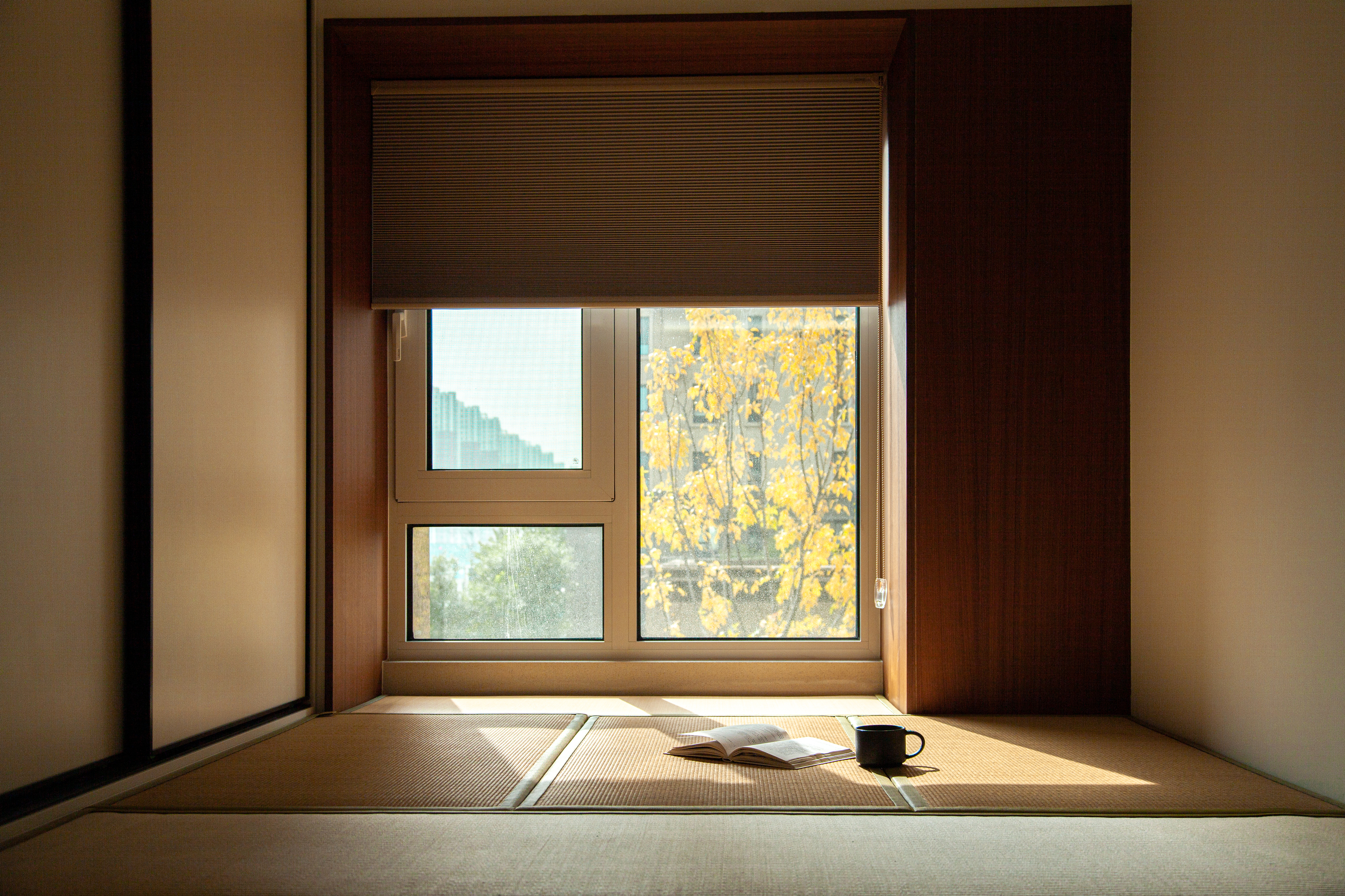 靠窗设计的日式榻榻米空间,阳光洒满,静谧而舒适。