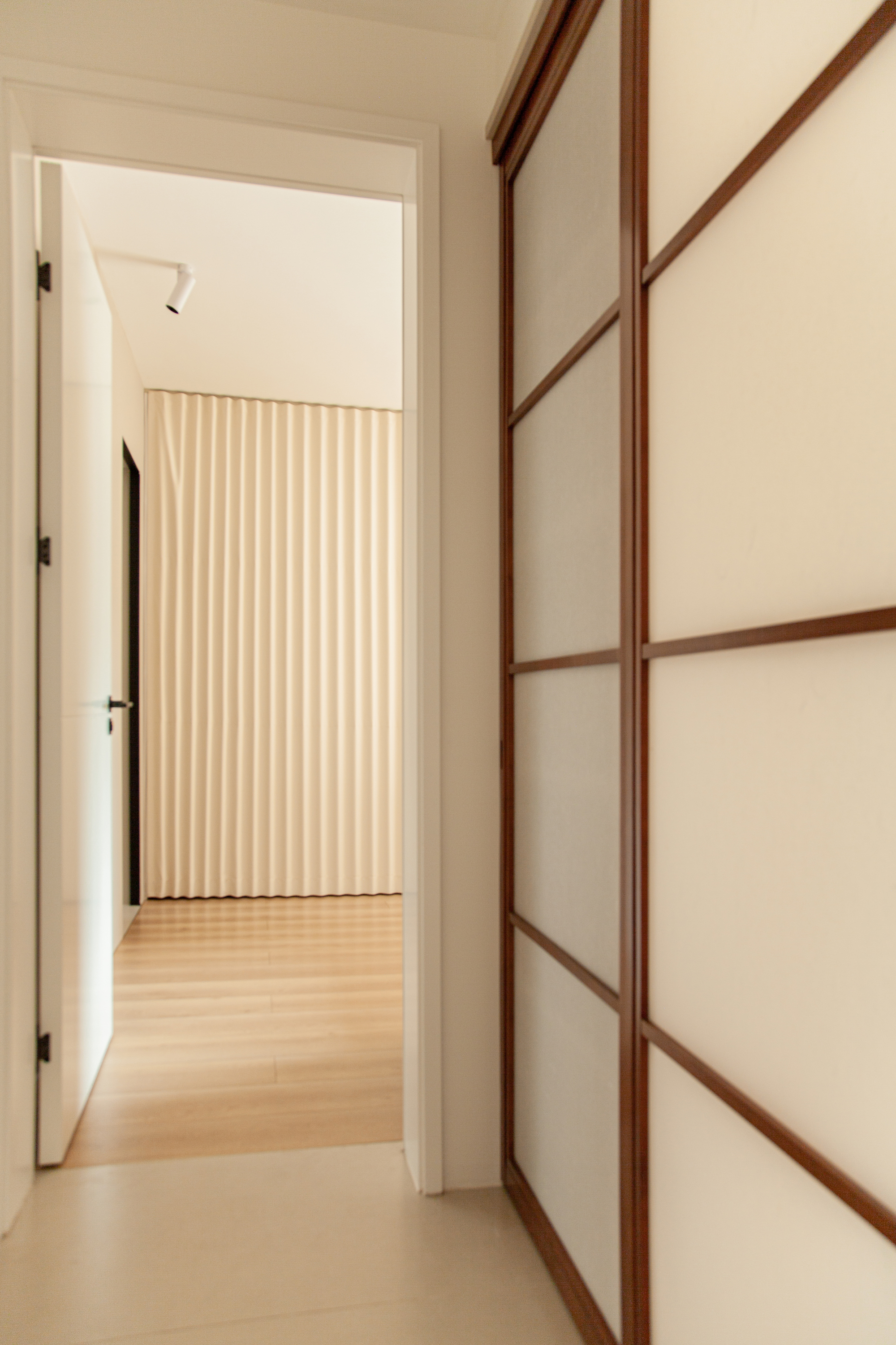 流线型走廊设计,连接起客厅与卧室,白色与木色形成和谐过渡。