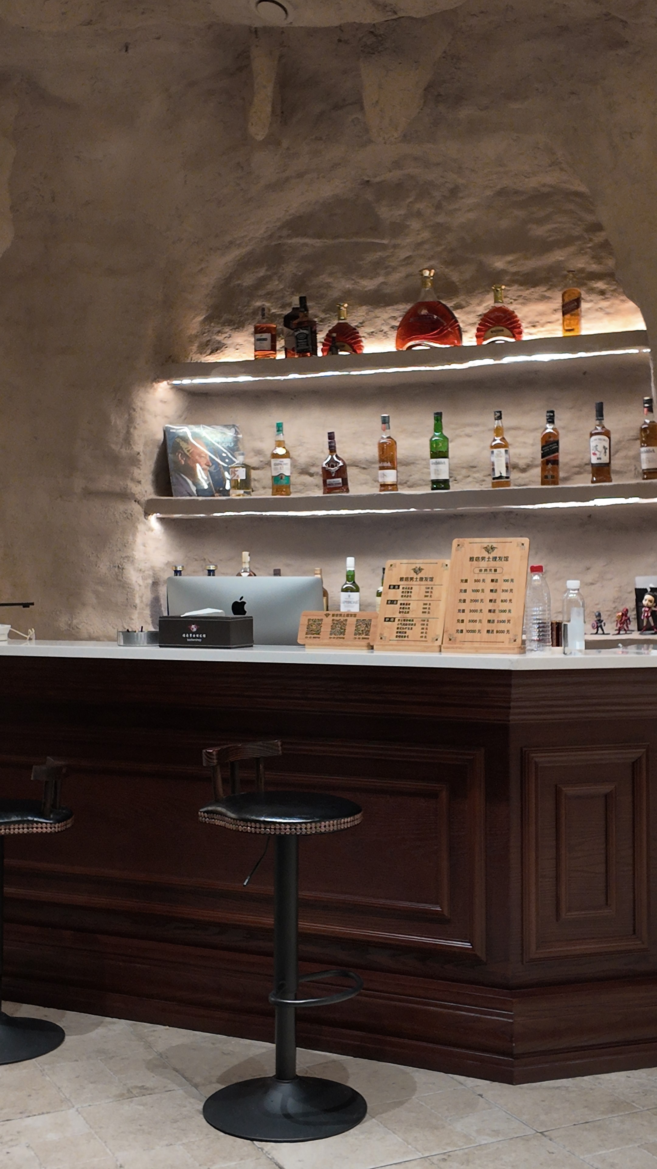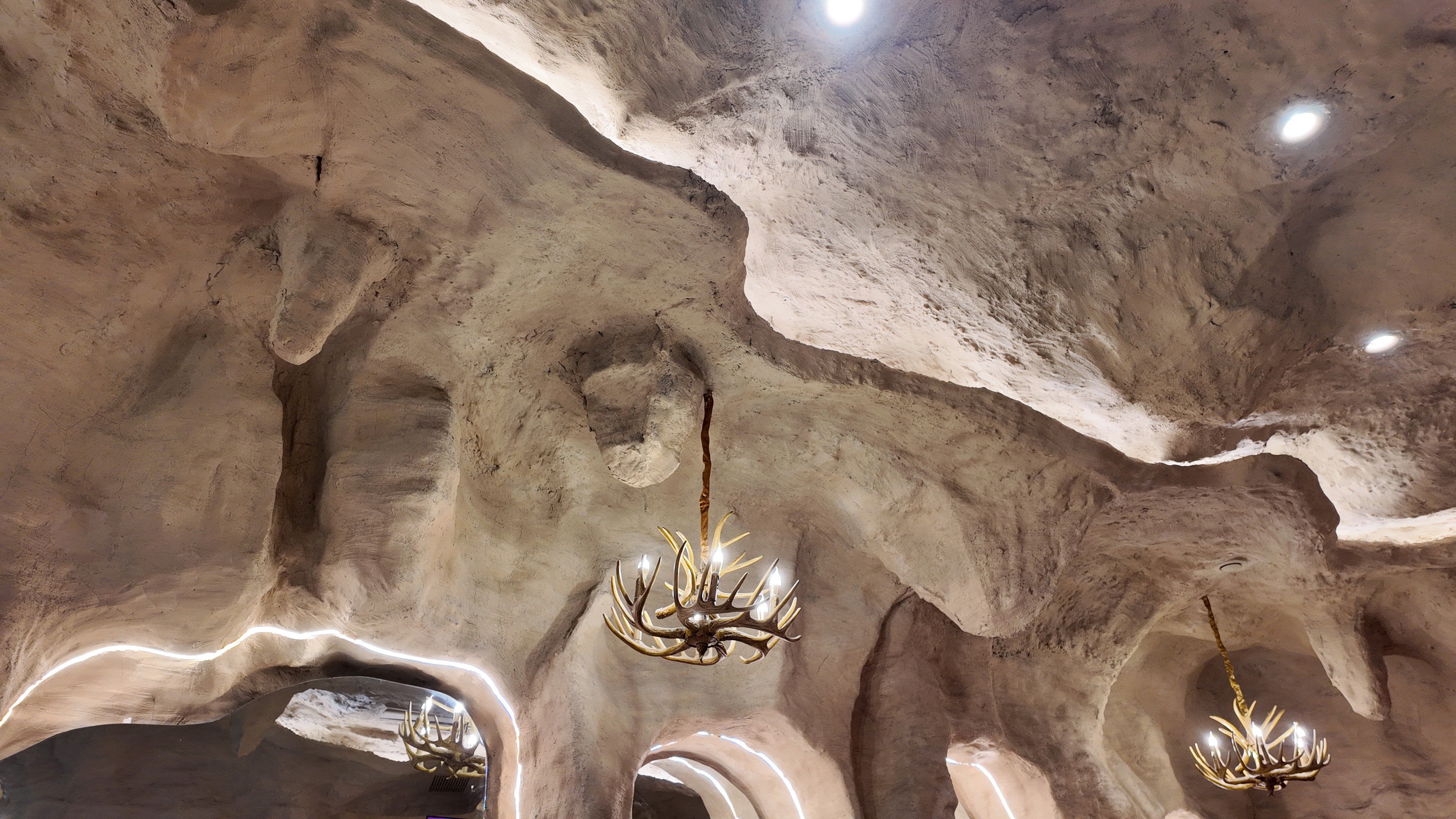 空间布局:室内设计采用了溶洞风格的元素,墙壁和天花板模仿溶洞的形态,使用石膏板和涂料制作出岩石和钟乳石的效果。地面采用深色大理石瓷砖,与墙面形成鲜明的对比。灯光设计采用暖色调的灯光,营造出温馨舒适的氛围。