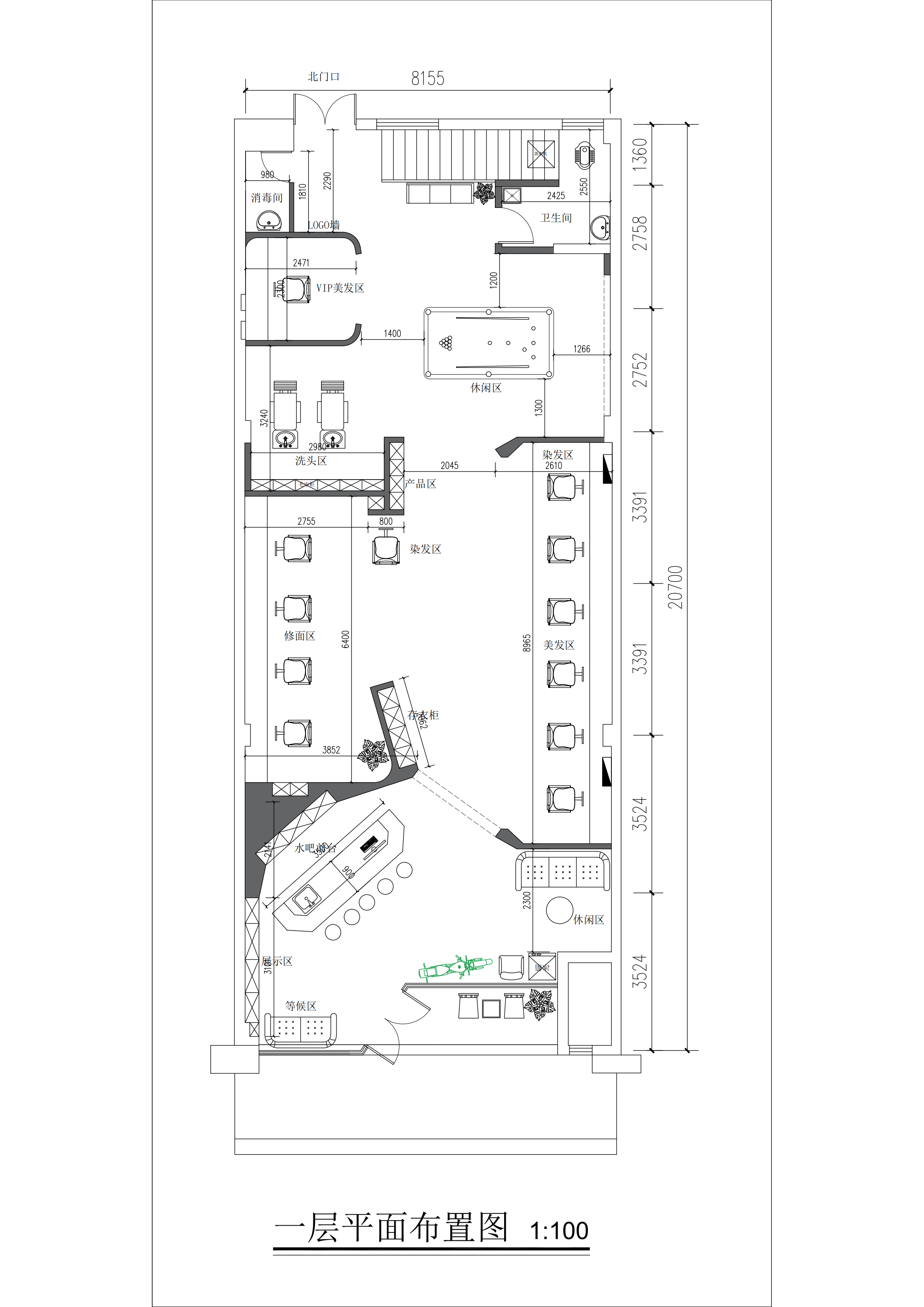 空间意境:理发馆总面积为150平方米,分为接待区、理发区、按摩区和休息区。接待区设于入口处,配有前台和等待区,提供舒适的座椅和杂志以供顾客等待时阅读。理发区设有8个理发位,每个位置之间以屏风分隔,保障顾客的私密性。按摩区设有2个按摩床位,提供头皮按摩服务。休息区设有沙发和茶几,让顾客在等待或理发后能够放松休息。