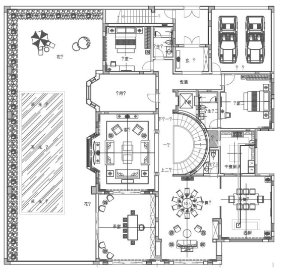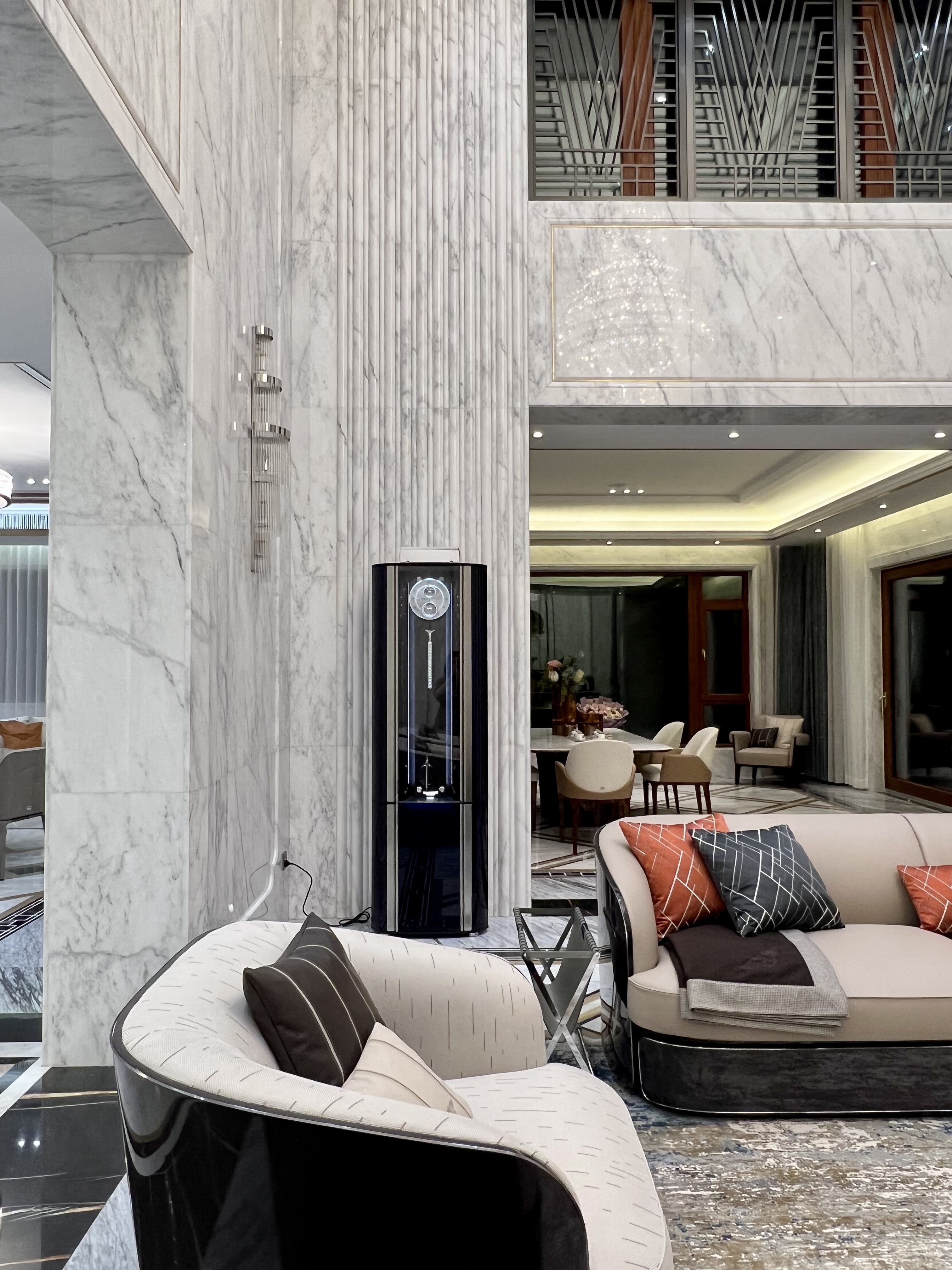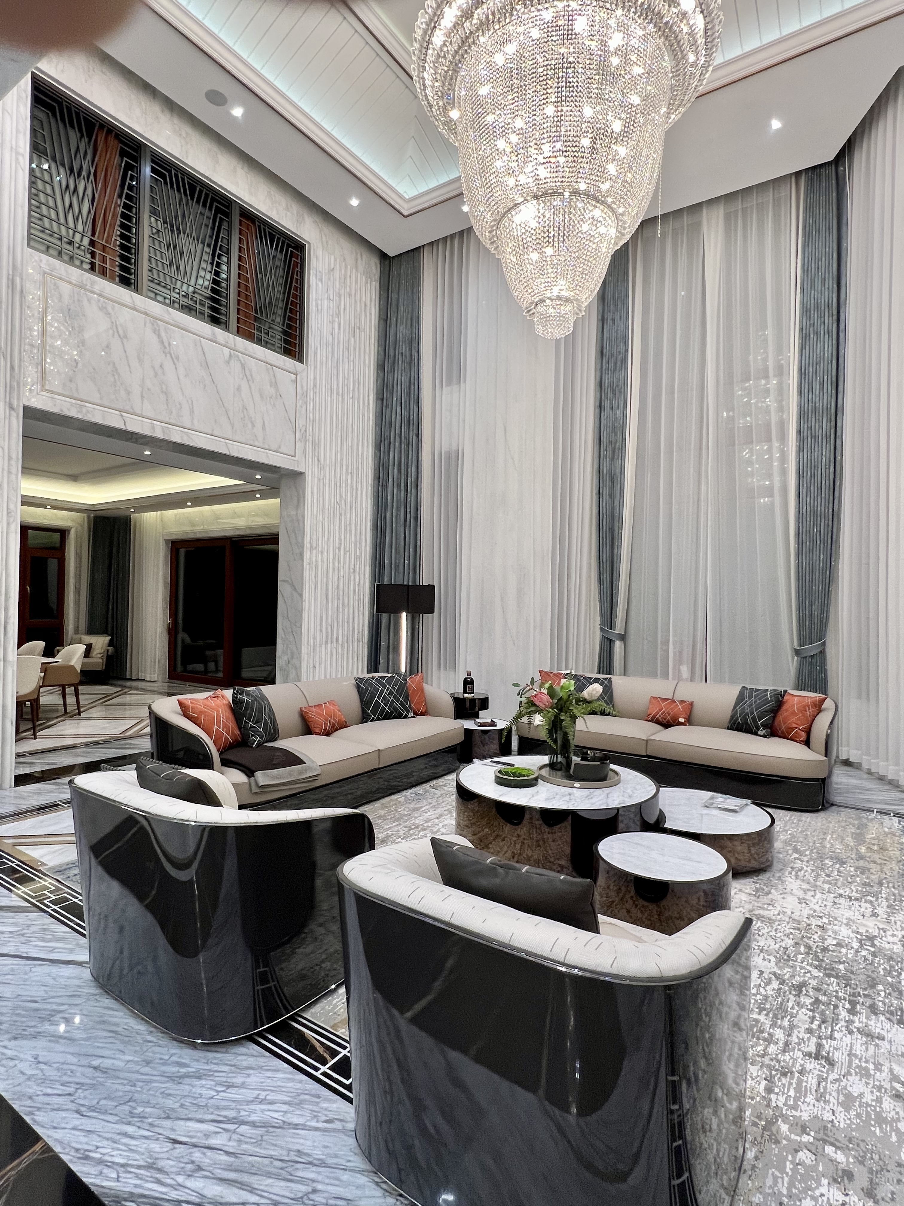 客厅:挑高开阔,鱼肚白天然石材墙面与地板配回纹装饰,意式沙发外框采用意大利纯手绘竖纹装饰,搭配同系列扶手椅,呼应抽象水墨地毯。
