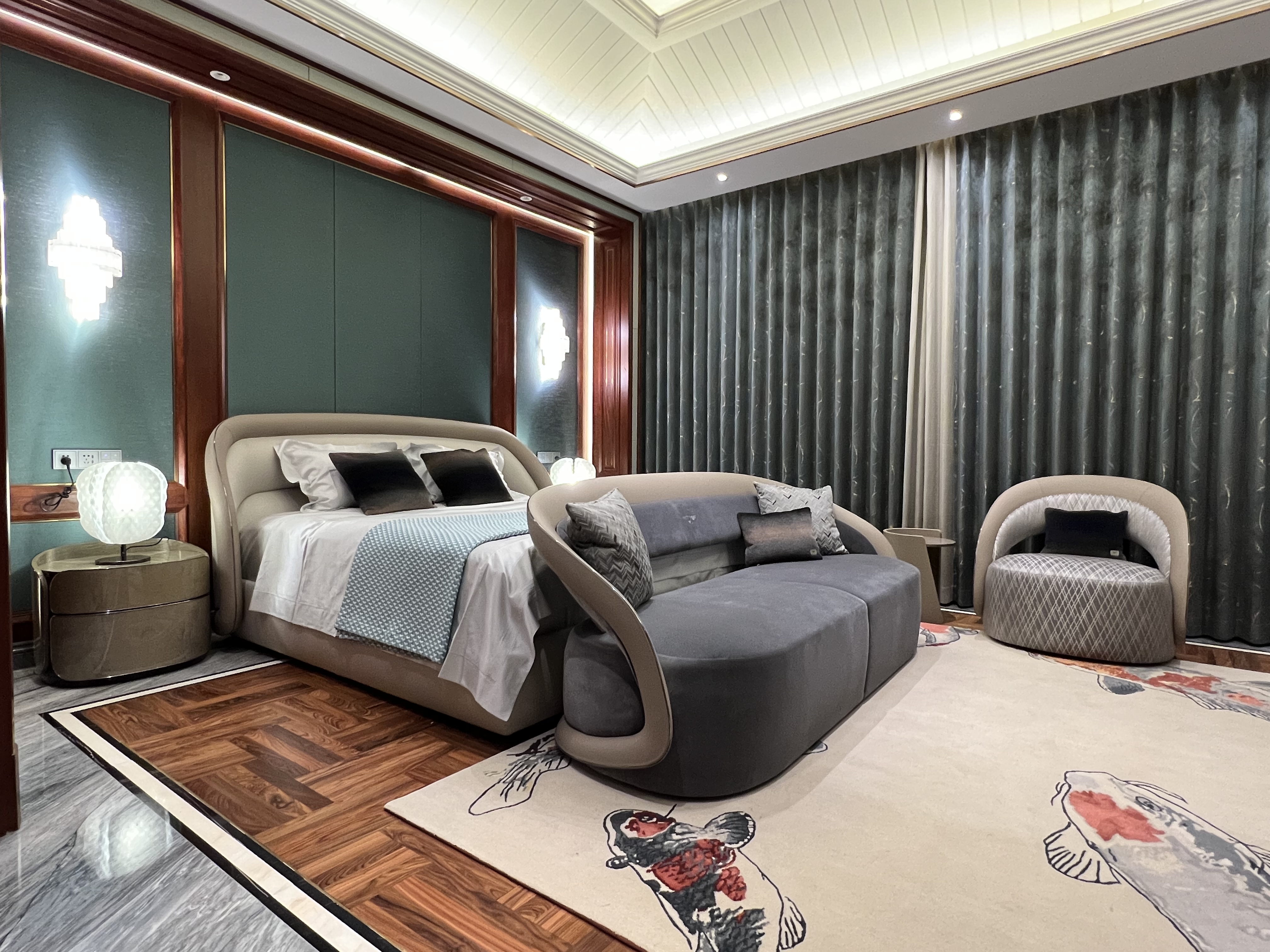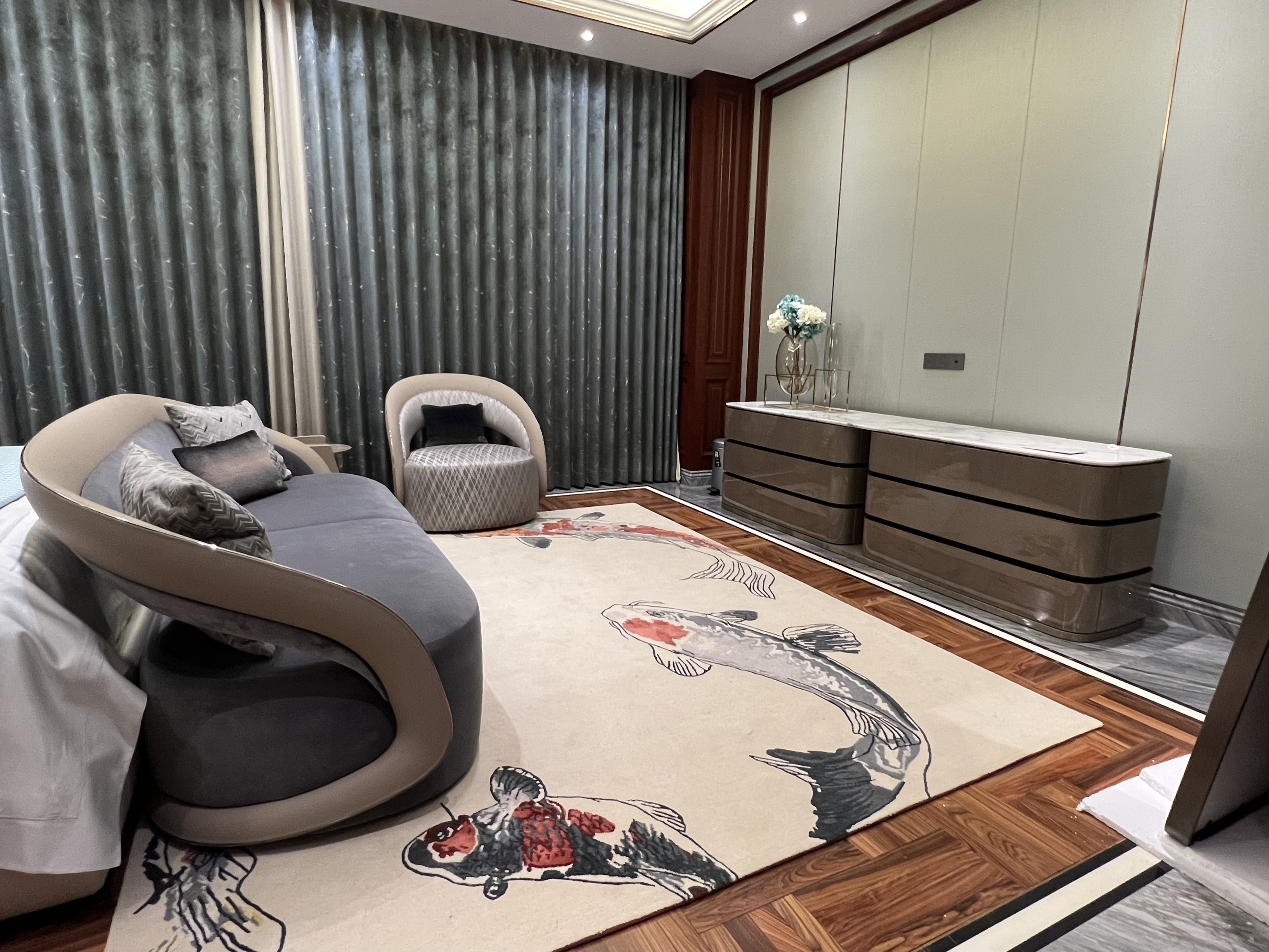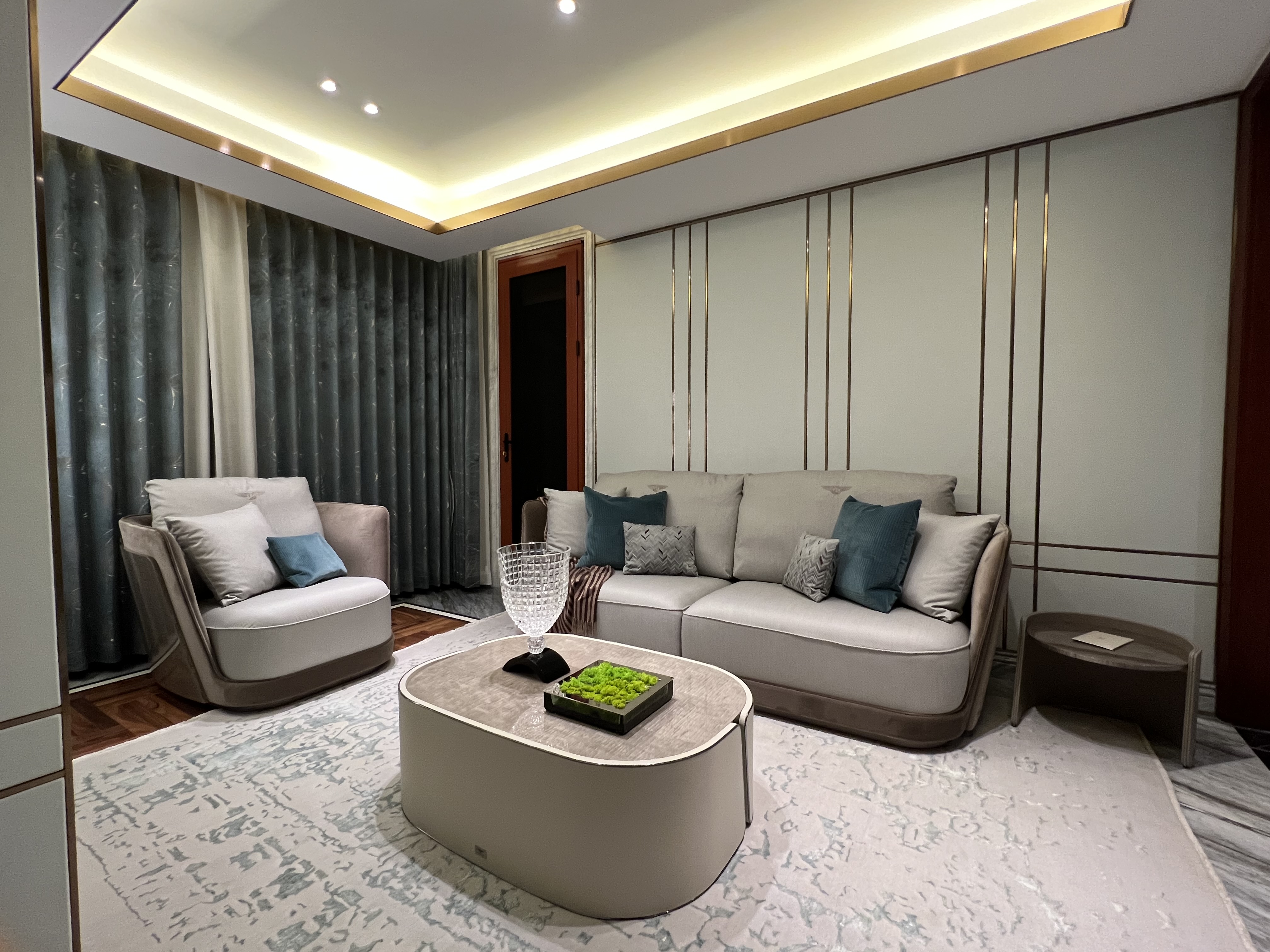 本软装项目锚地西安独有的新中式风格,汲取传统美学精髓,简约轻奢意式风格相结合,搭配沉稳醇厚的色彩,以及水墨地毯等图案,在表达极致奢华的同时又可以营造空灵静谧的氛围,于都市喧嚣中辟一方心灵桃园。