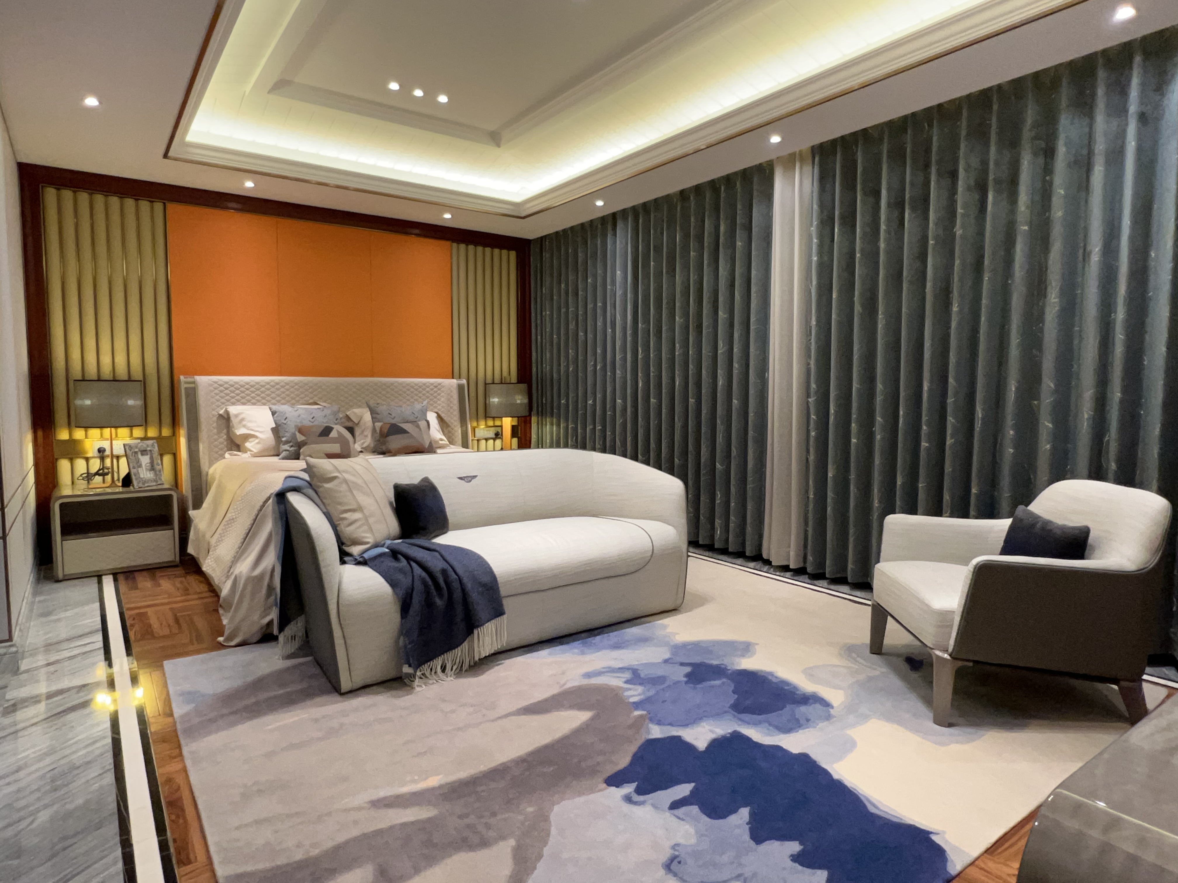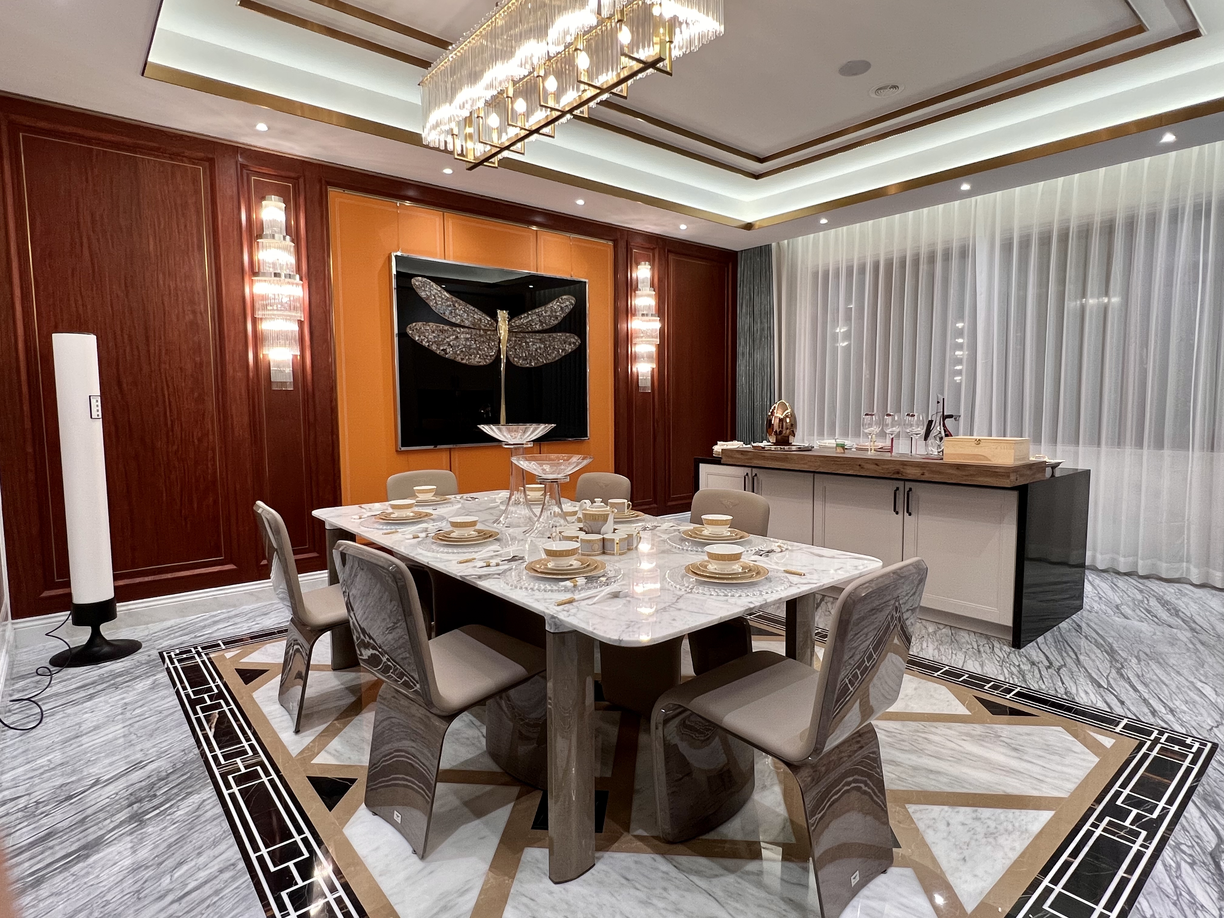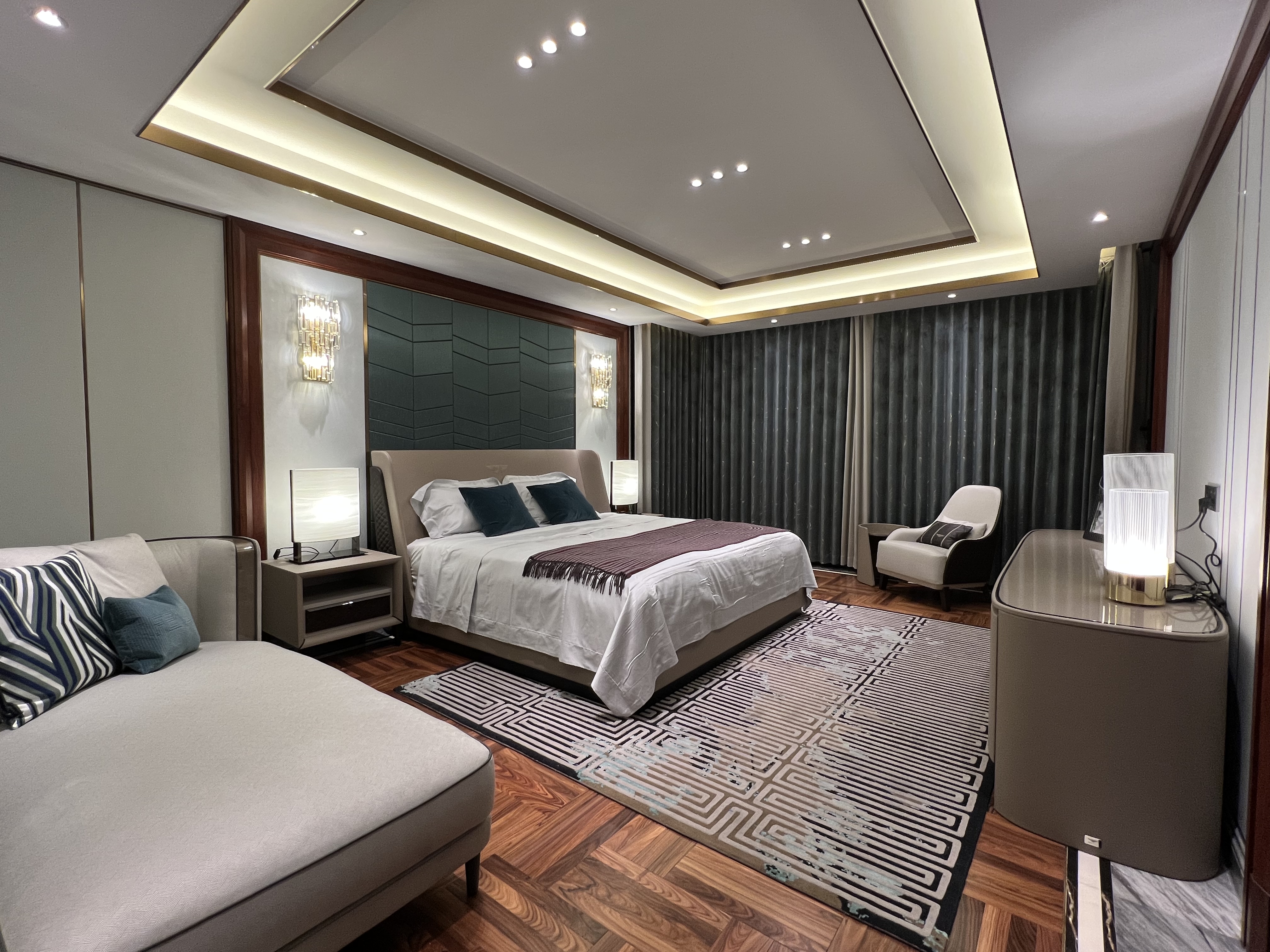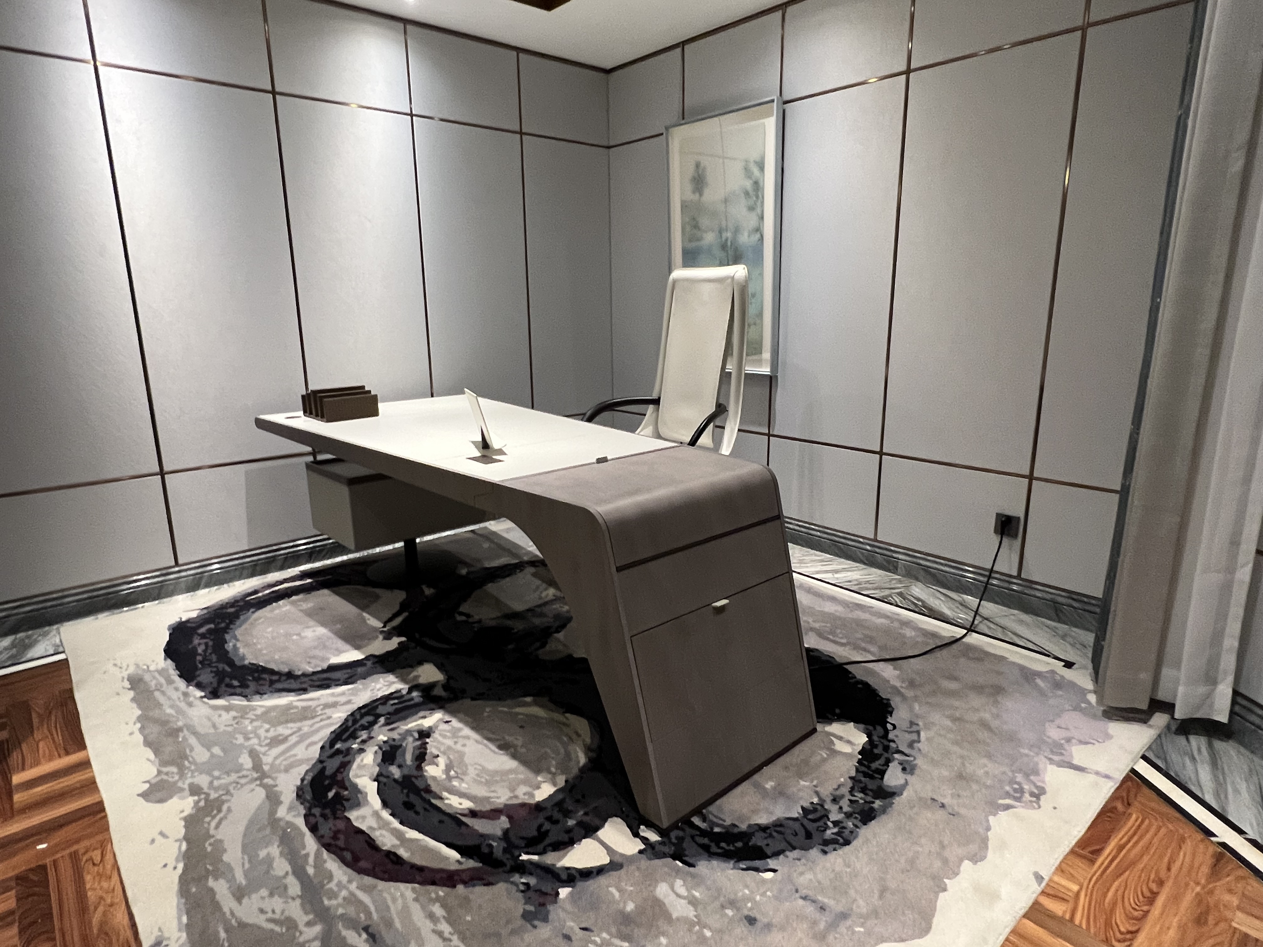 本软装项目锚地西安独有的新中式风格,汲取传统美学精髓,简约轻奢意式风格相结合,搭配沉稳醇厚的色彩,以及水墨地毯等图案,在表达极致奢华的同时又可以营造空灵静谧的氛围,于都市喧嚣中辟一方心灵桃园。