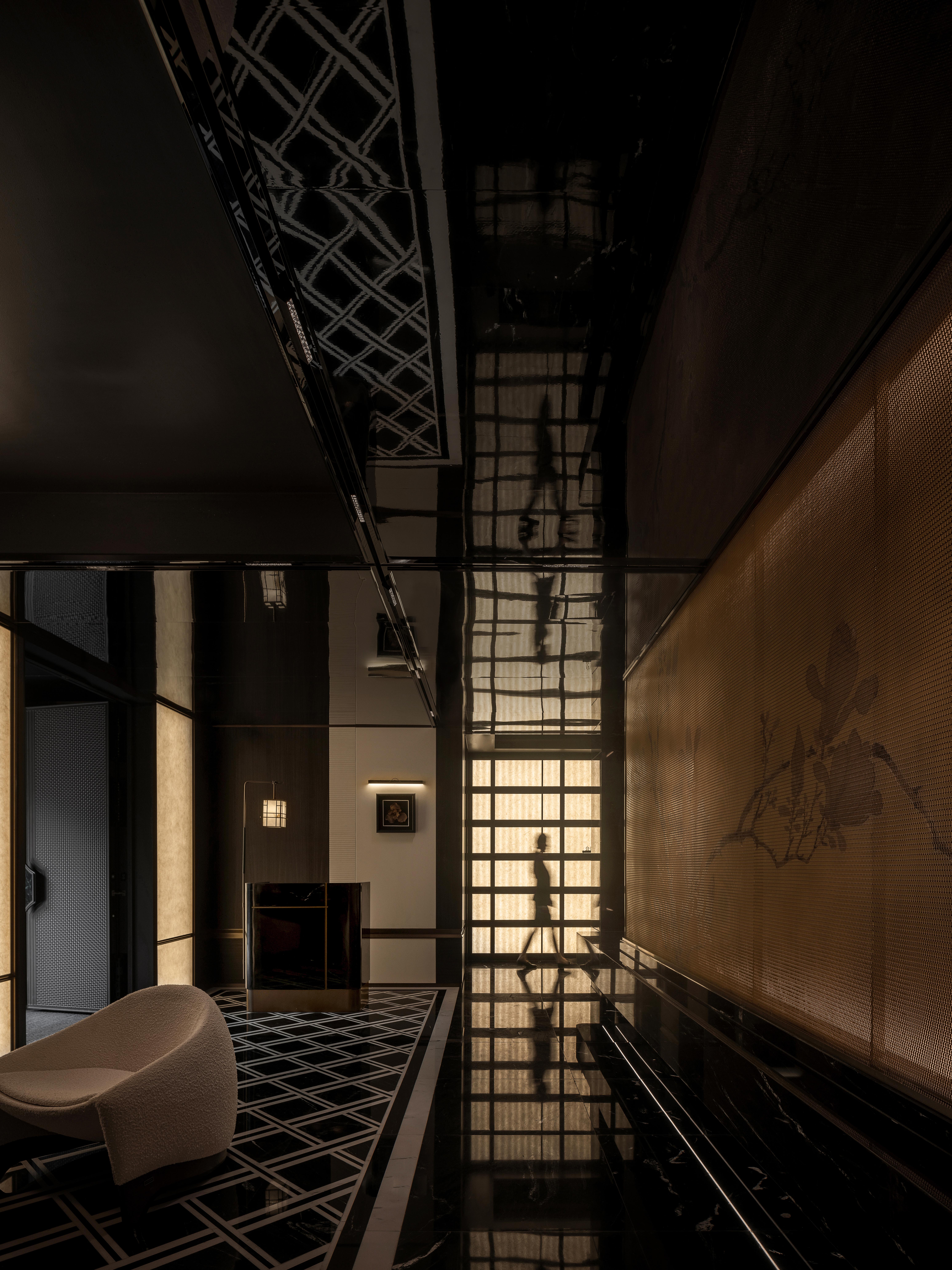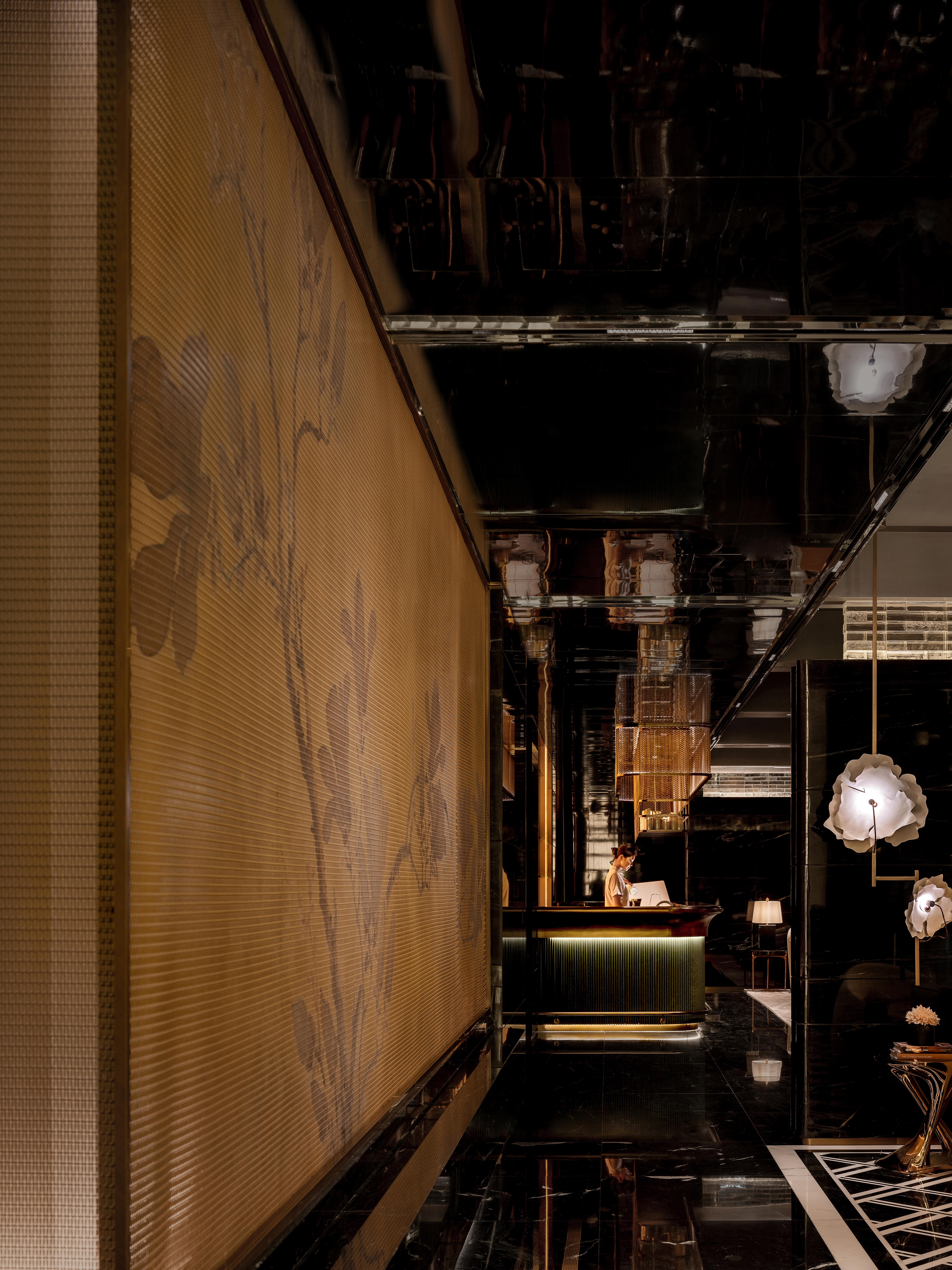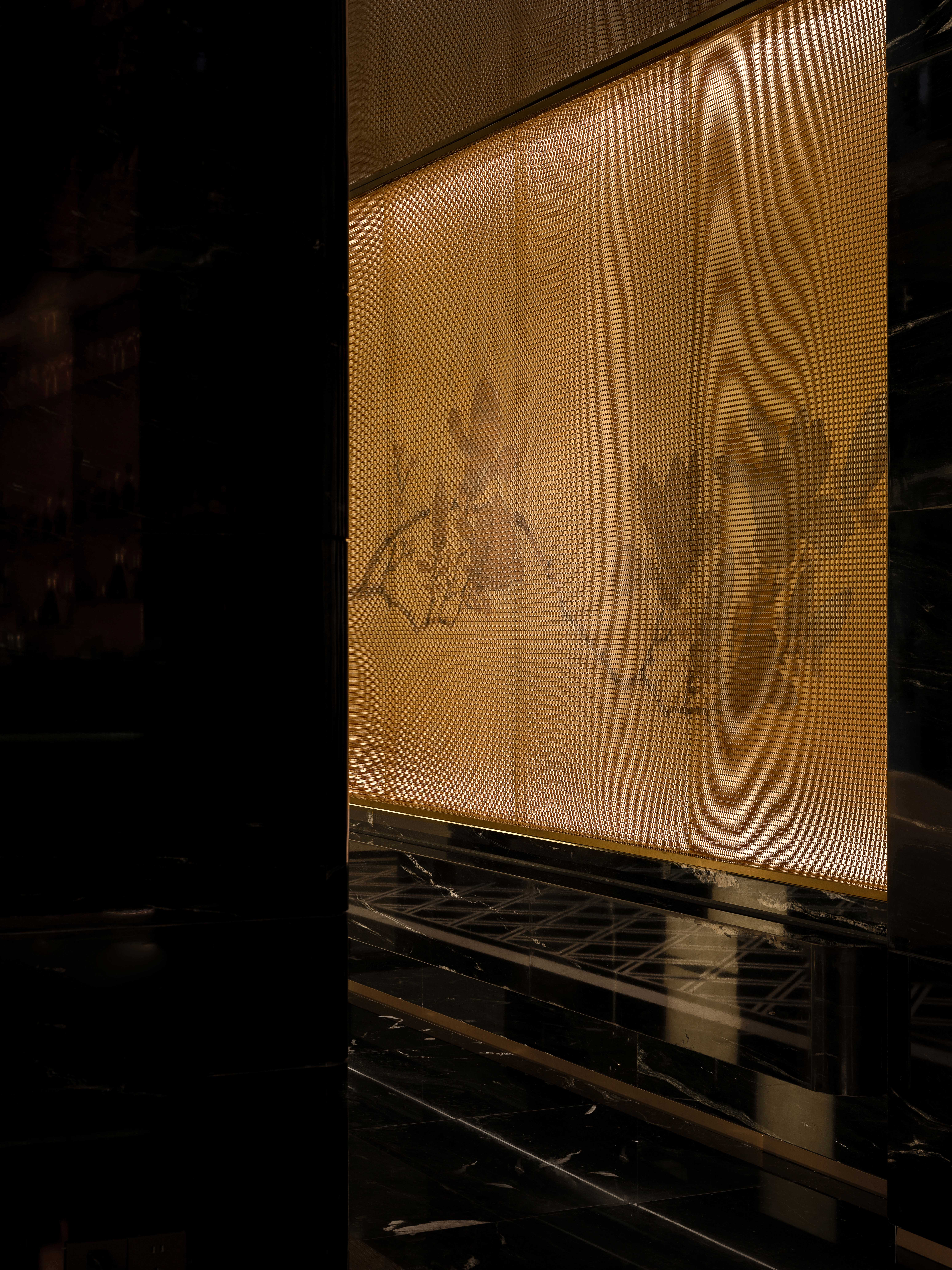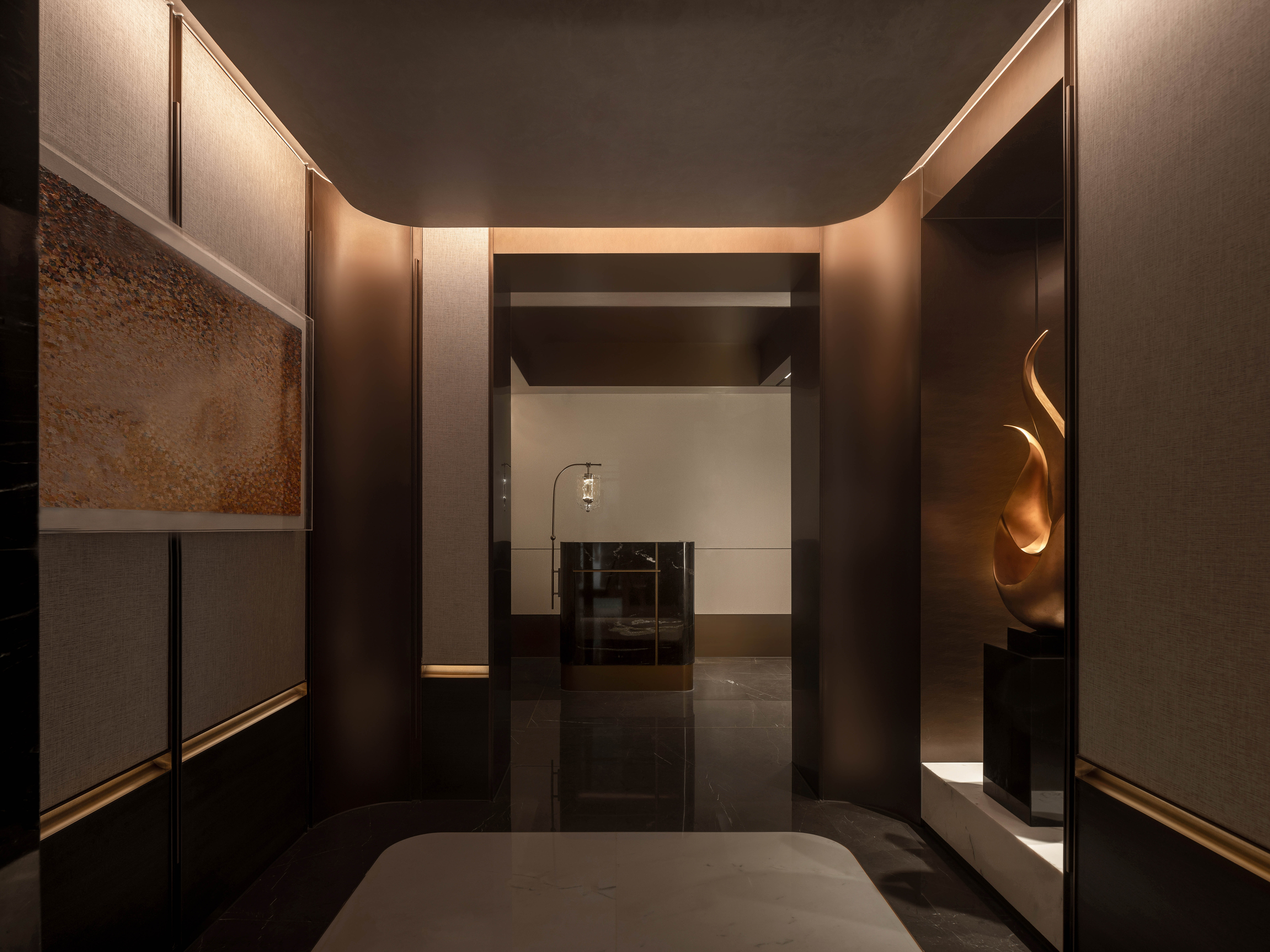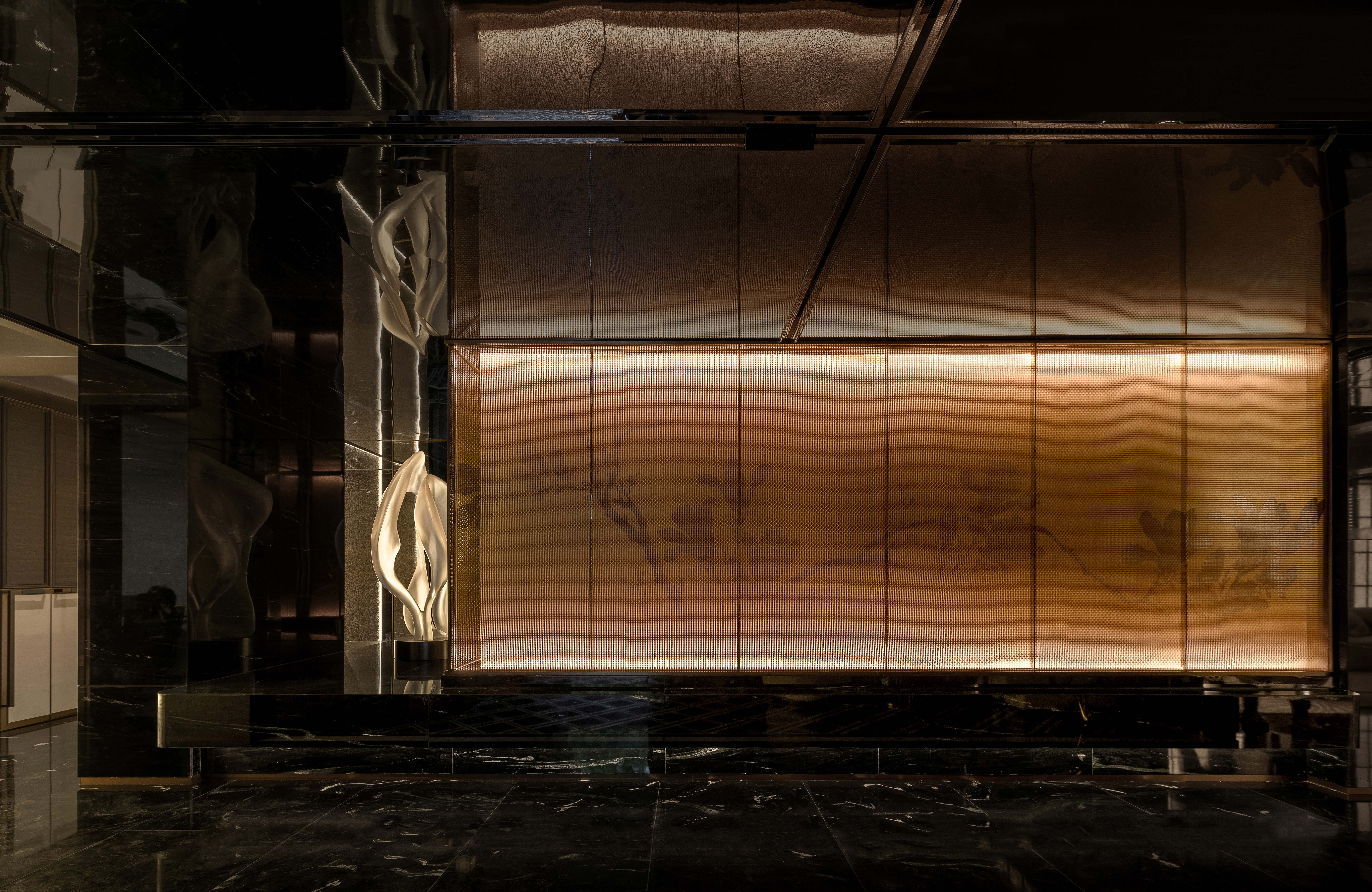 空间意境:设计师以情景化设计手法,将玉兰之美糅于场景空间,取意形、色、意、境、韵,将玉兰融于金属、墙壁、文化走廊及艺术品的运用,张弛有度,编制成一曲精致又创新的视觉交响。在保留老上海的复古海派格调的基础上,设计师创新当代上海国际化都市的艺术属性,做到传承,转译,再创新,来呼应历史文脉,复兴海派城市记忆,塑新城市空间。