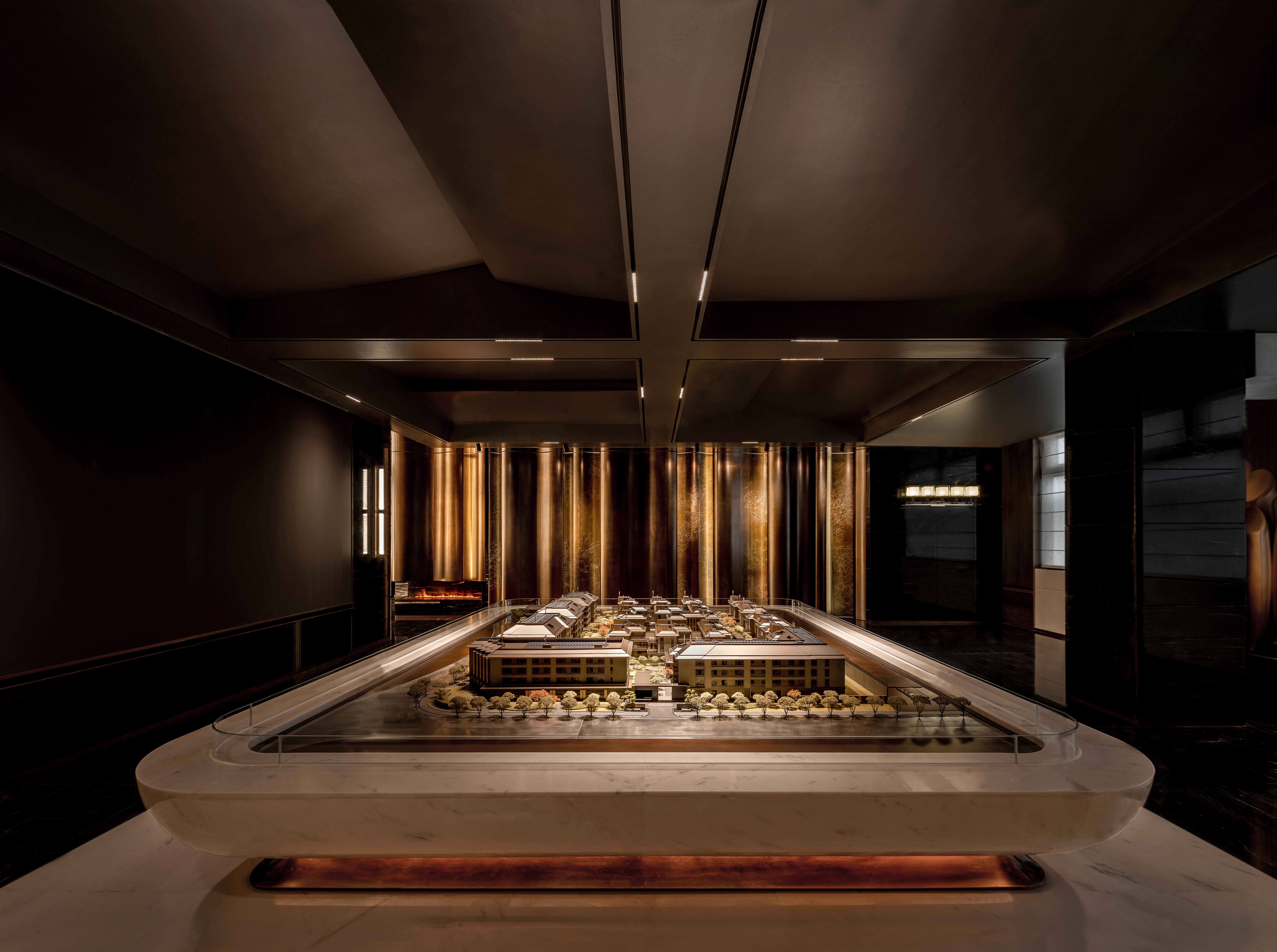 空间布局:售楼处分为序厅、沙盘区、洽谈区,两个VIP室,会议室和艺术走廊,流畅的动线让人沉浸其中,为客户体验提供更多生活场景化的可能。