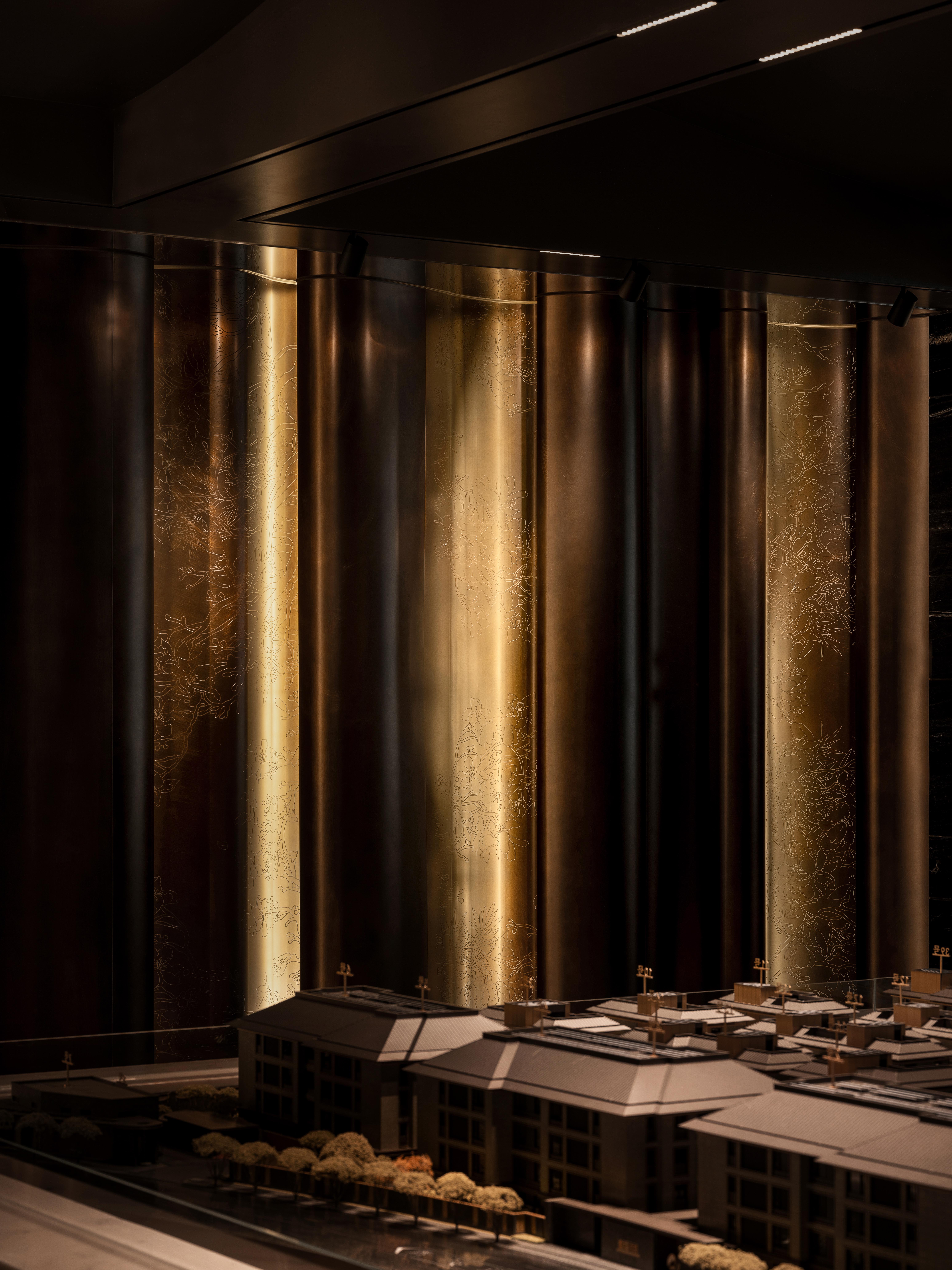设计选材:将玉兰元素雕刻于仿铜不锈钢上,将明代文徵明名画《玉兰图卷》融于可回收得金属网上,造价低,呈现效果强,也为日后售楼处的改造提供更多可能。