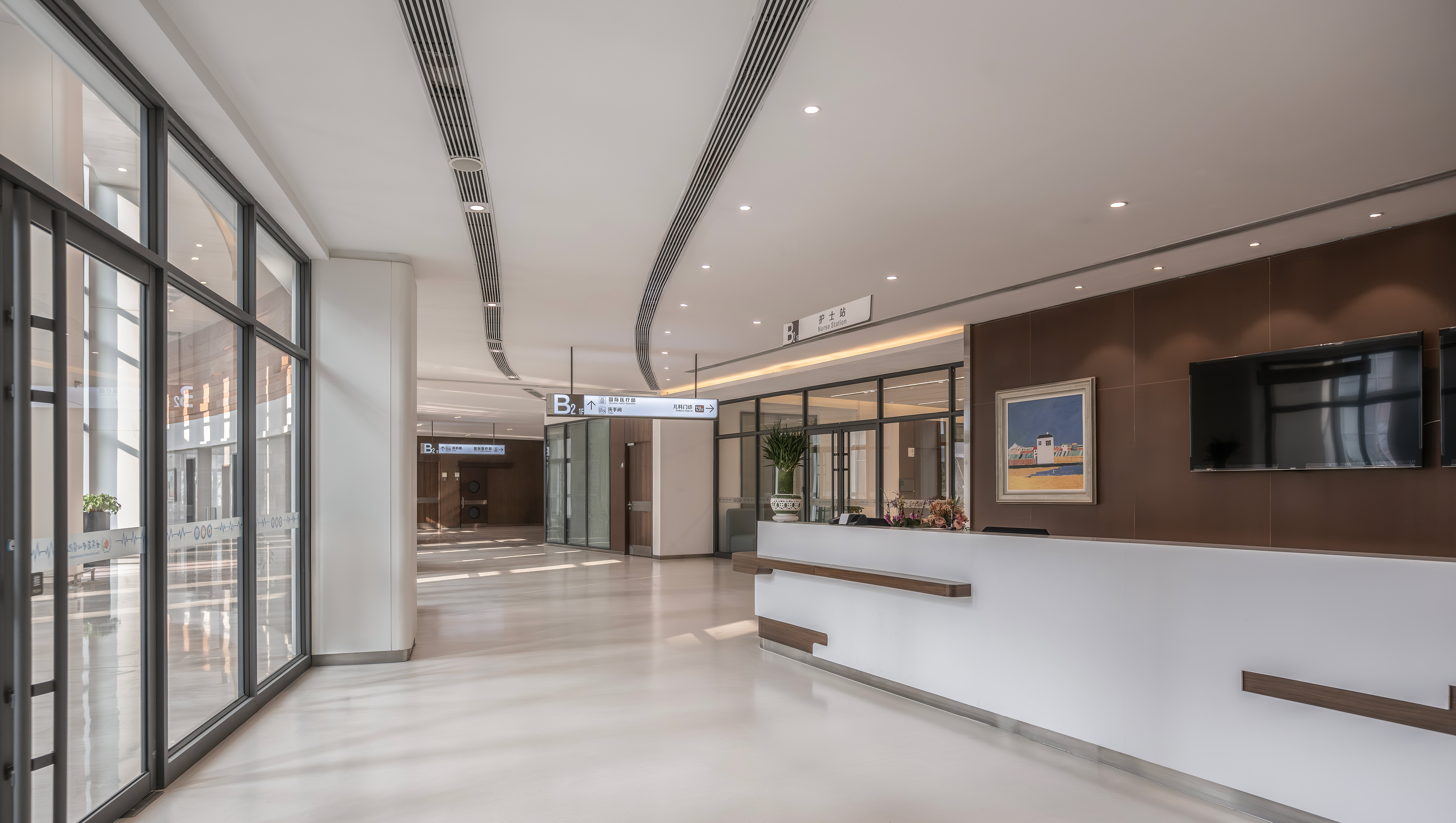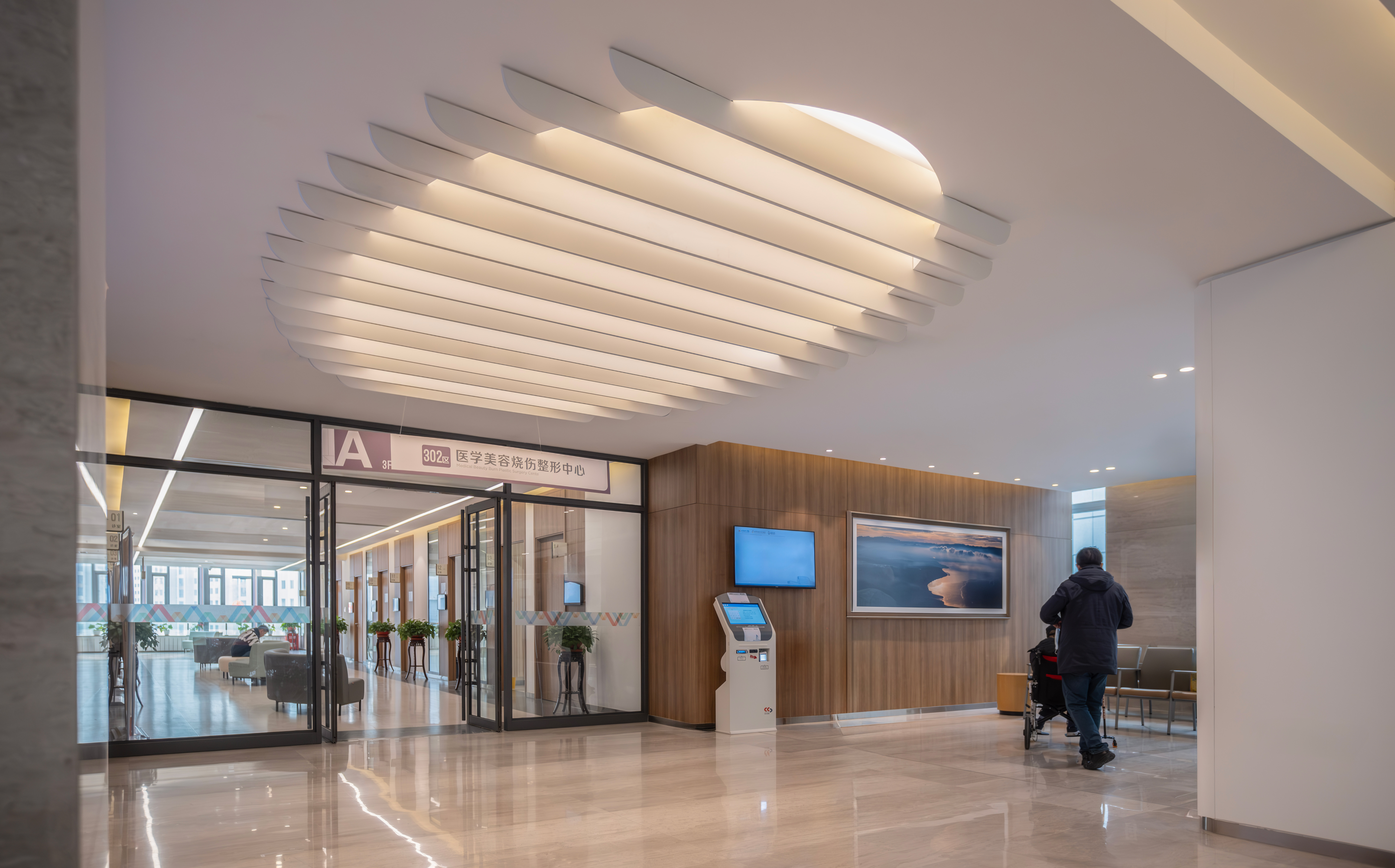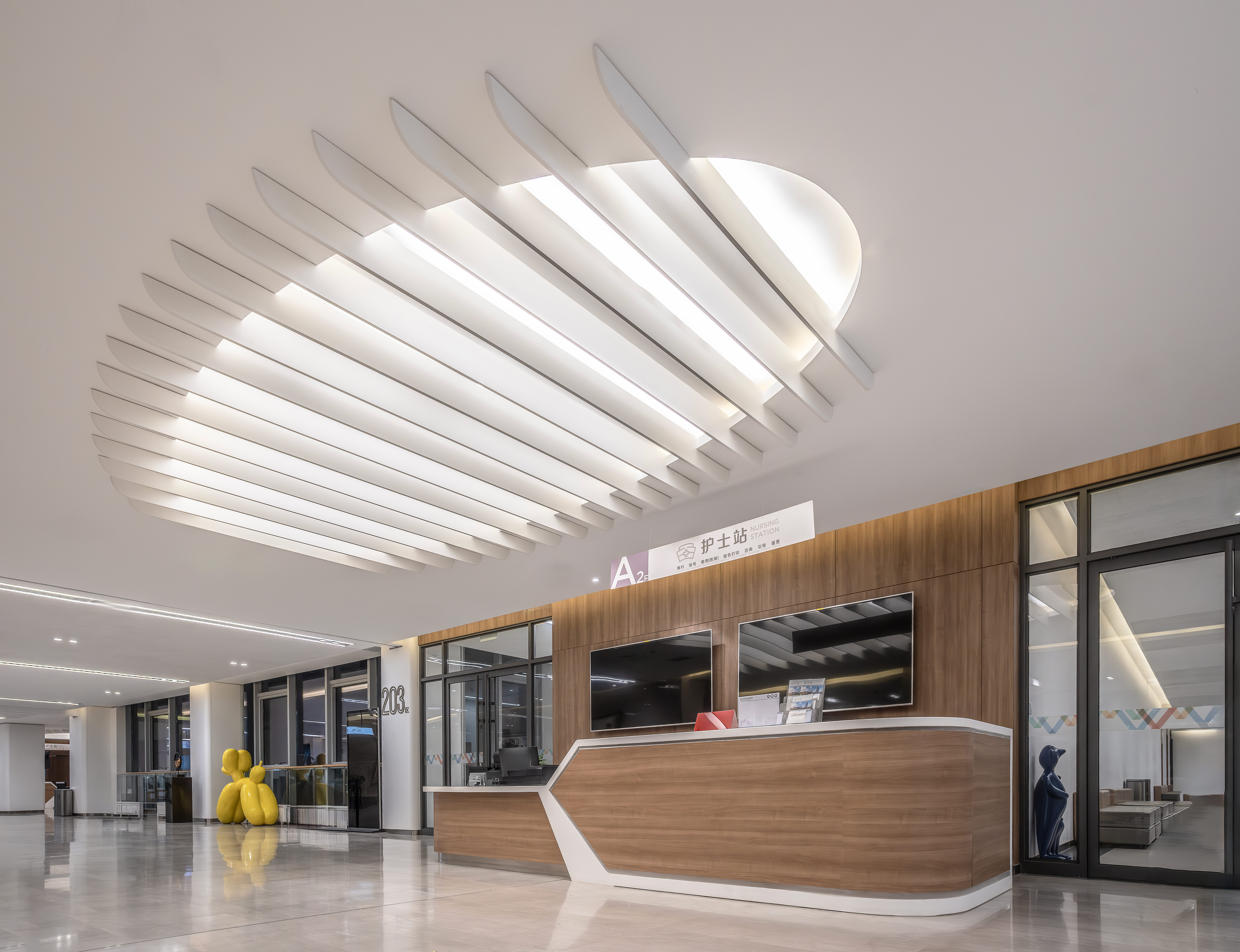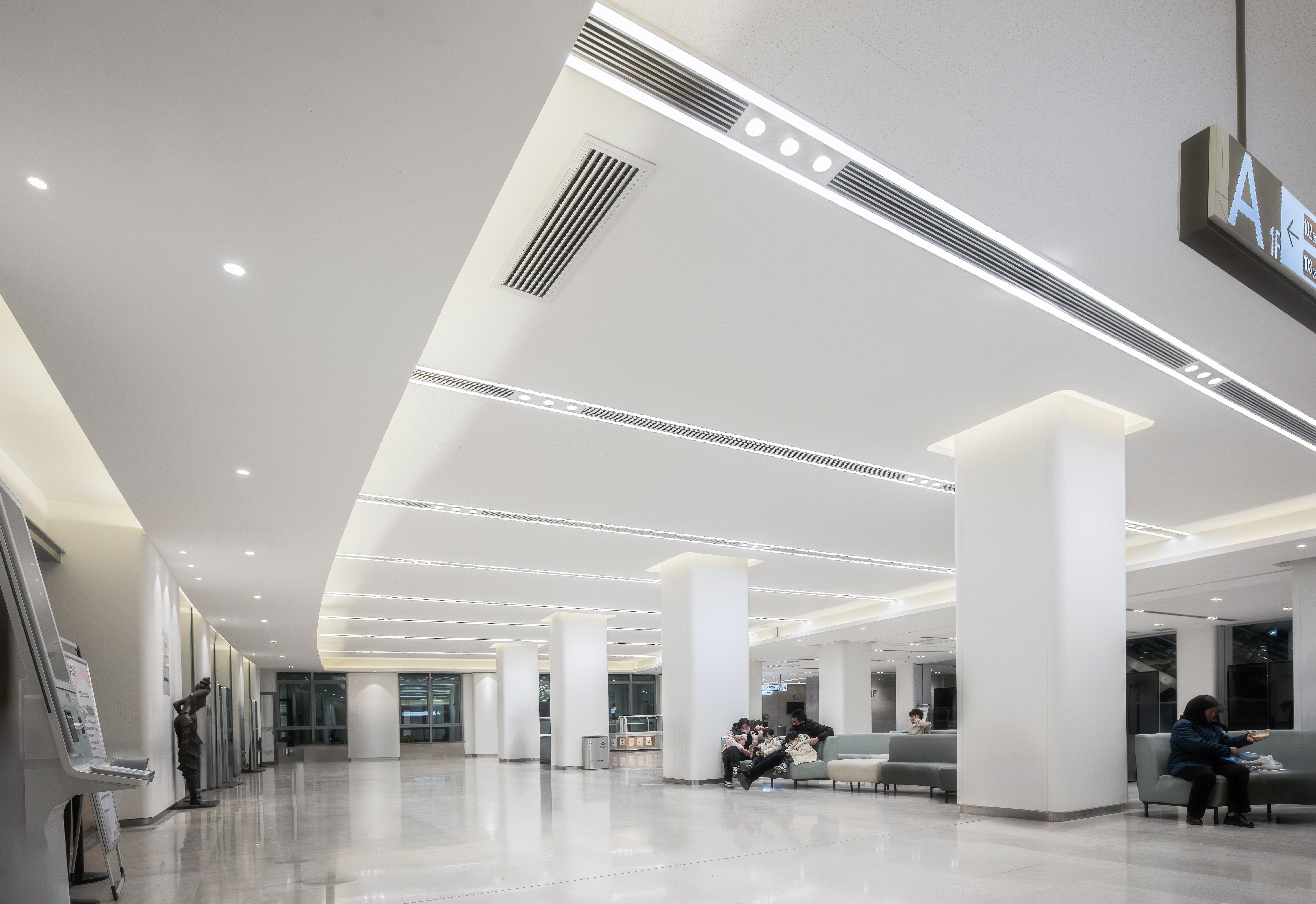 设计选材:门急诊楼各层就诊区主要由一条100多米长、8米宽的交通核,将一次候诊区、二次候诊区及各个科室相互连接,并且延伸至医技楼,作为主要人流密集场所,在装饰上整体简洁明快,天花采用了先进的新型一体式设备带,将中央空调、消防、疏散灯、日常照明等大部分设备通过集成的方式整合起来,使整体天花摆脱了以往医院设计中由于设备安装影响整体美观的遗憾,并且采用了矿棉吸音板,降低了在人员密集区造成的声音污染。在护士站上方设计了椭圆形铝垂片,间接光源照明,防止眩光,并且避免因过道太长而感觉到单调,起到了很好的功能强调作用。墙面主要以灰色大理石为主要装饰,柱面采用亚光铝板干挂,通过温馨的木色系着重强调如护士站、患者一次等候等主要功能分区。地面采用与墙面一色系的大理石,两种灰色拼接使整体空间整洁又不失活泼并且特别预留了一条花岗岩构成的物流通道,避免医院推车时对石材造成损坏,又兼具了导向作用。二次候诊区与诊室相连接的墙面采用了定制成品轻质隔墙,将门扇、护墙板、玻璃隔断进行统一装配式安装, 使墙面管线预埋更加快捷、高效。在每个诊室门边安装了双玻夹百叶,保护患者隐私的同时,使走廊和诊室相互借光,避免有些诊室、走廊无自然采光引起的压抑感。