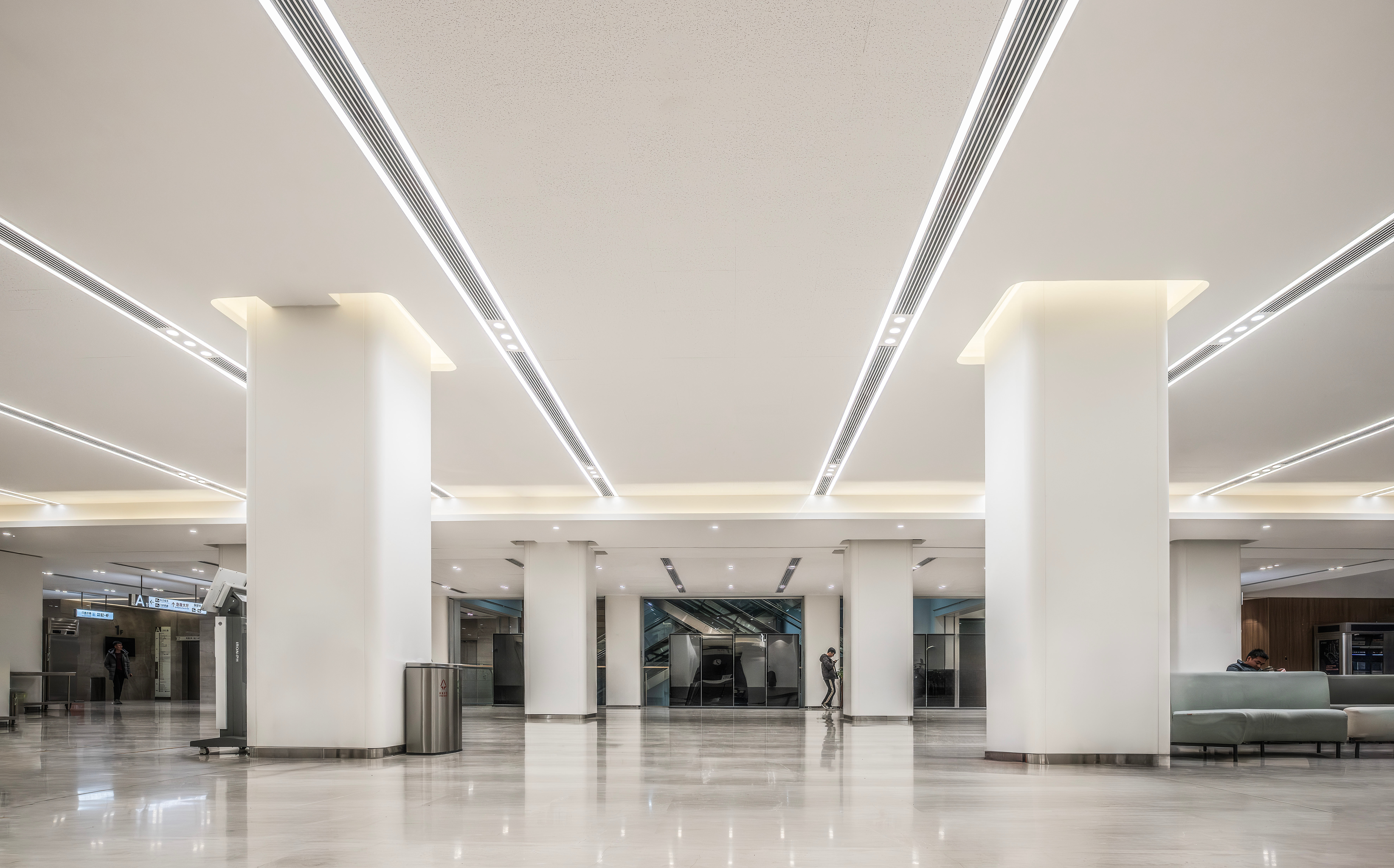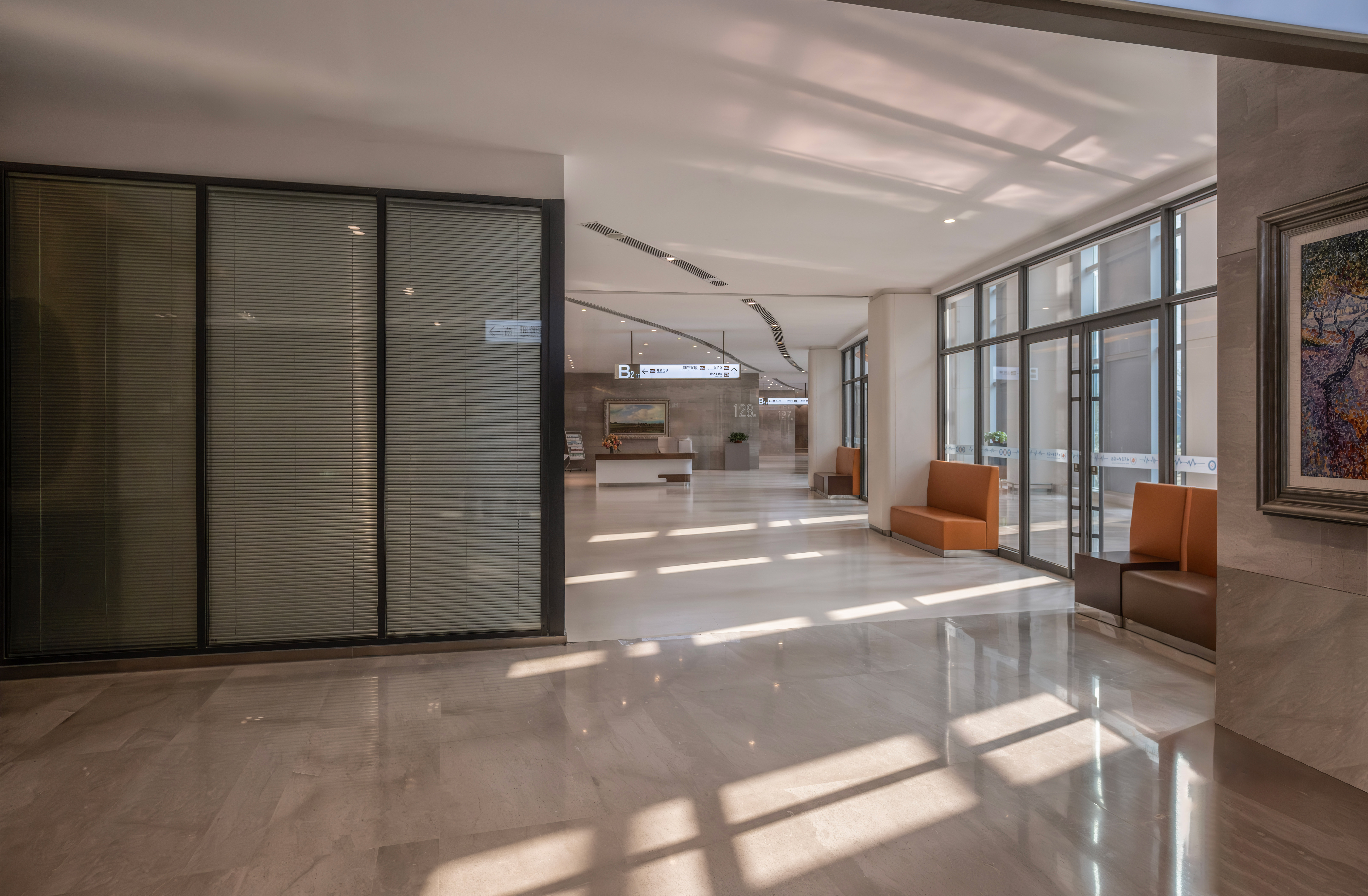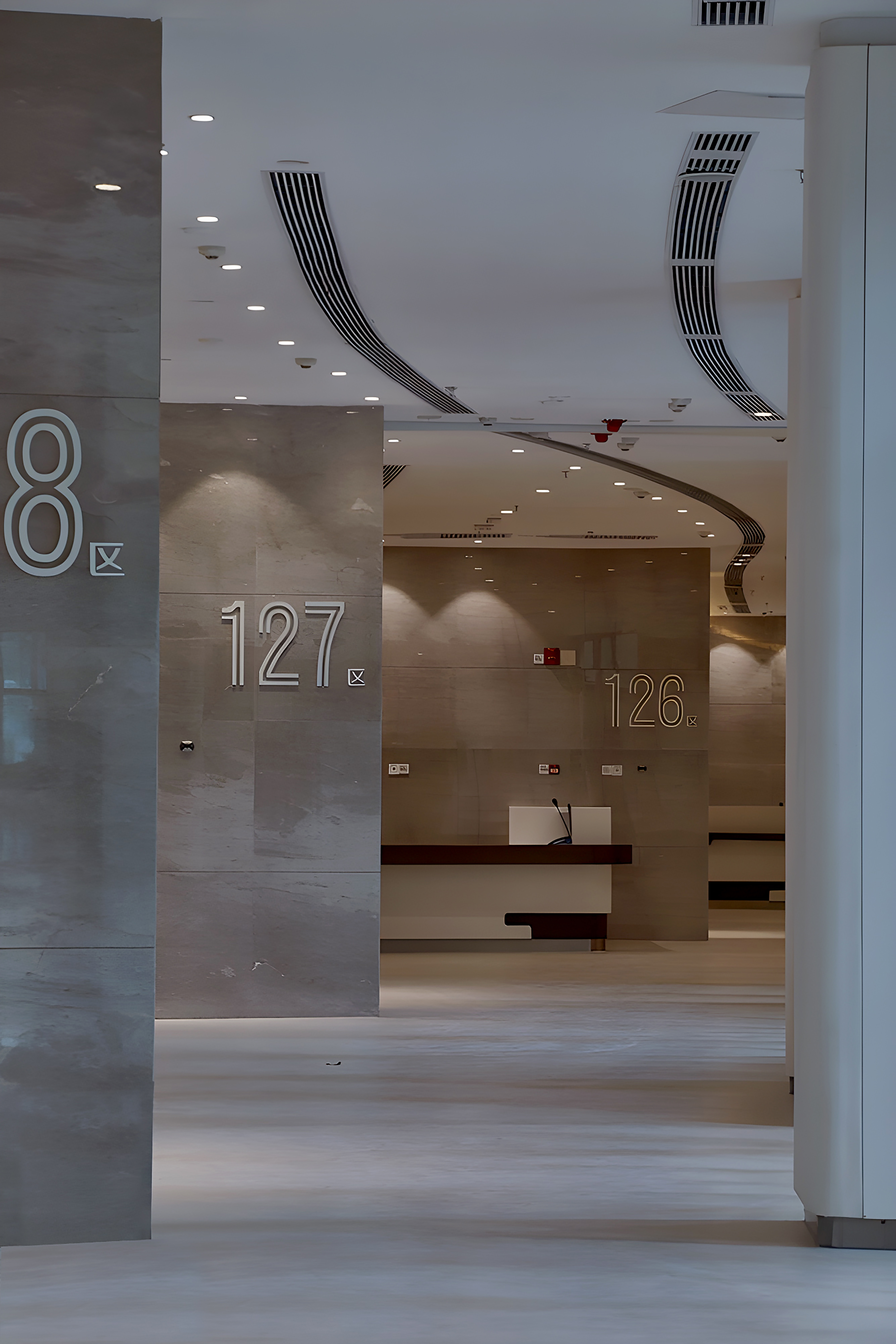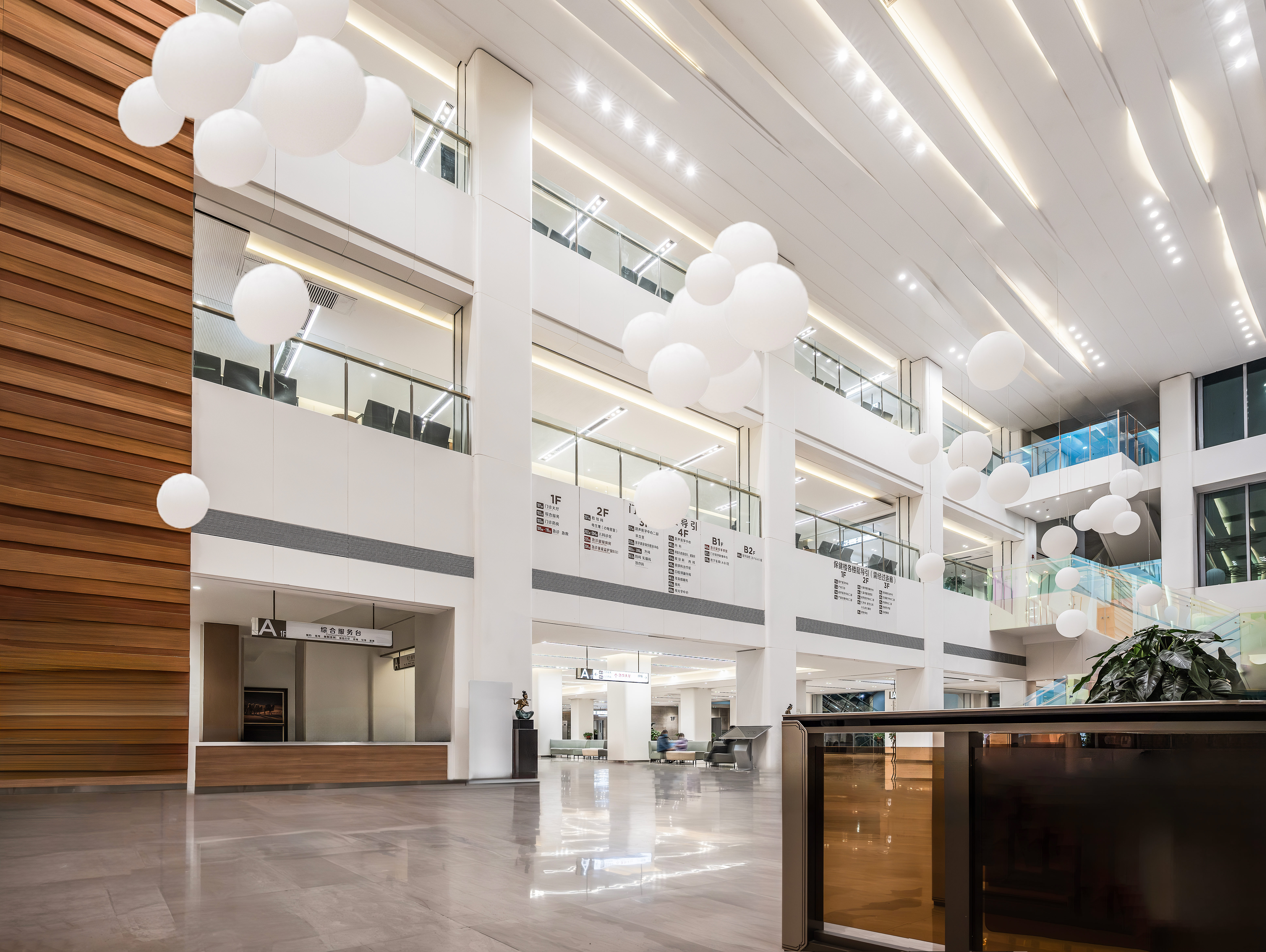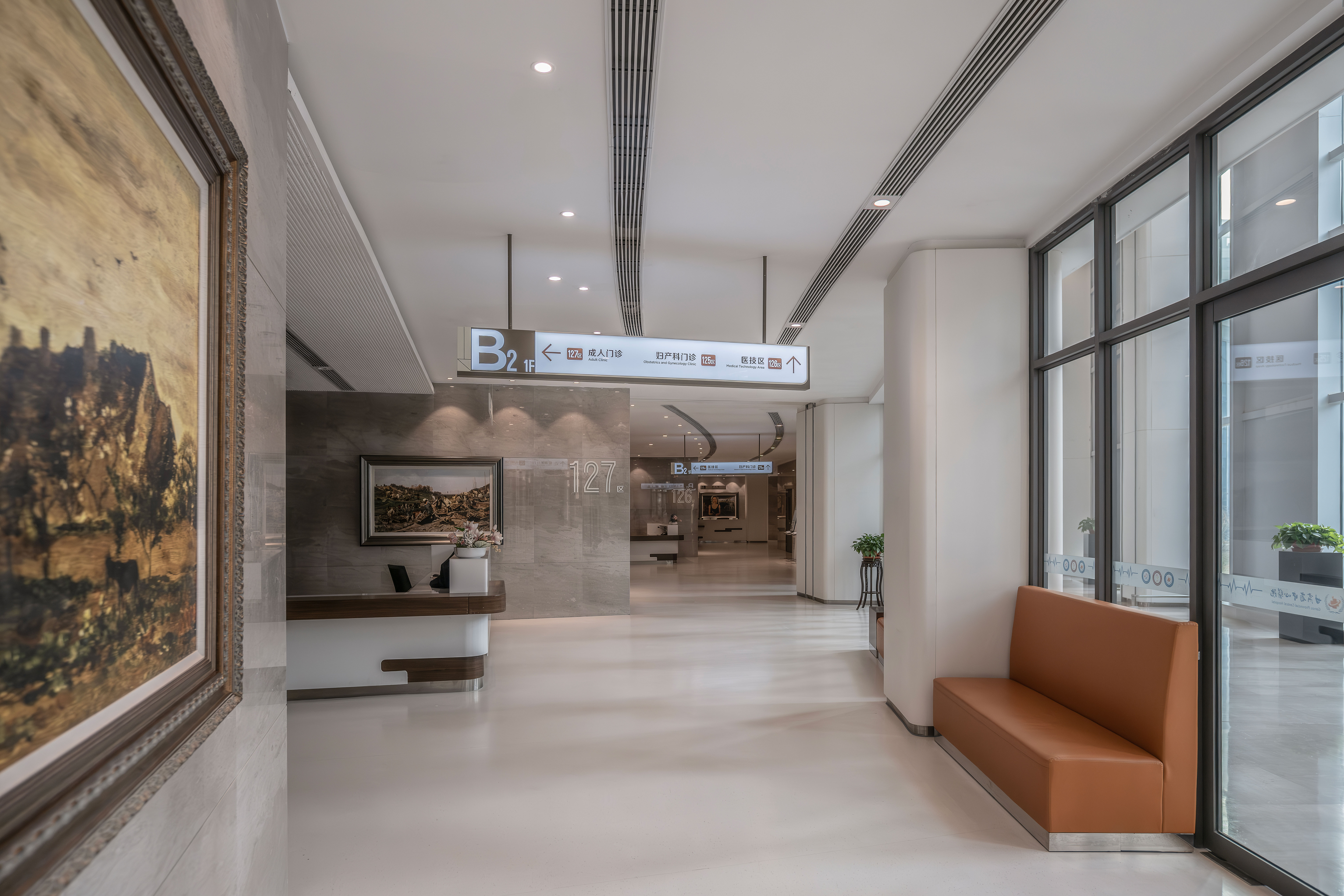 设计选材:门急诊楼各层就诊区主要由一条100多米长、8米宽的交通核,将一次候诊区、二次候诊区及各个科室相互连接,并且延伸至医技楼,作为主要人流密集场所,在装饰上整体简洁明快,天花采用了先进的新型一体式设备带,将中央空调、消防、疏散灯、日常照明等大部分设备通过集成的方式整合起来,使整体天花摆脱了以往医院设计中由于设备安装影响整体美观的遗憾,并且采用了矿棉吸音板,降低了在人员密集区造成的声音污染。在护士站上方设计了椭圆形铝垂片,间接光源照明,防止眩光,并且避免因过道太长而感觉到单调,起到了很好的功能强调作用。墙面主要以灰色大理石为主要装饰,柱面采用亚光铝板干挂,通过温馨的木色系着重强调如护士站、患者一次等候等主要功能分区。地面采用与墙面一色系的大理石,两种灰色拼接使整体空间整洁又不失活泼并且特别预留了一条花岗岩构成的物流通道,避免医院推车时对石材造成损坏,又兼具了导向作用。二次候诊区与诊室相连接的墙面采用了定制成品轻质隔墙,将门扇、护墙板、玻璃隔断进行统一装配式安装, 使墙面管线预埋更加快捷、高效。在每个诊室门边安装了双玻夹百叶,保护患者隐私的同时,使走廊和诊室相互借光,避免有些诊室、走廊无自然采光引起的压抑感。