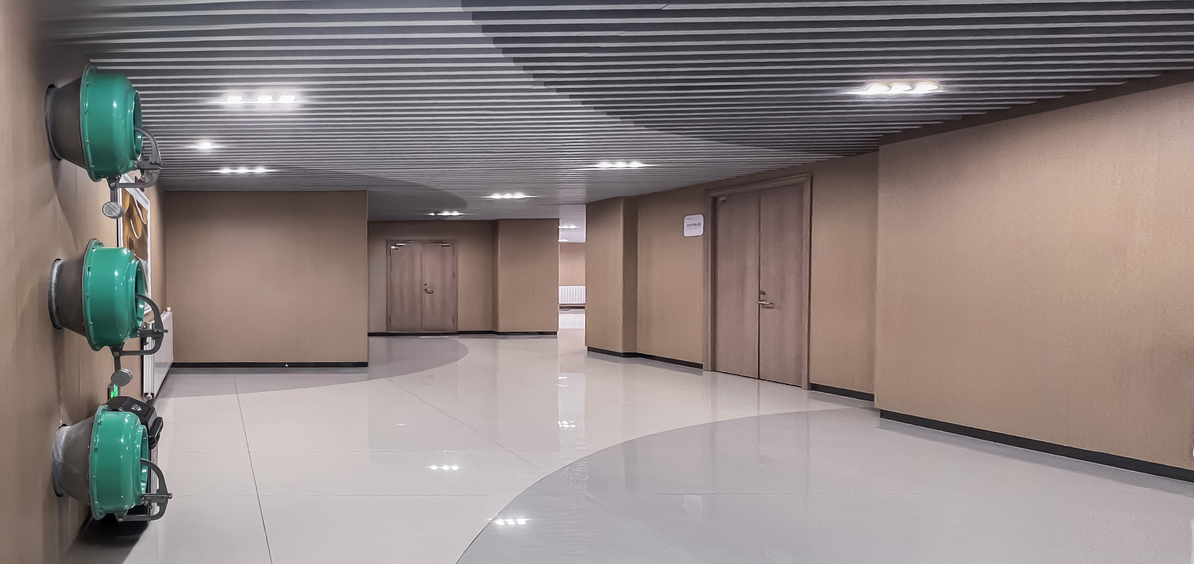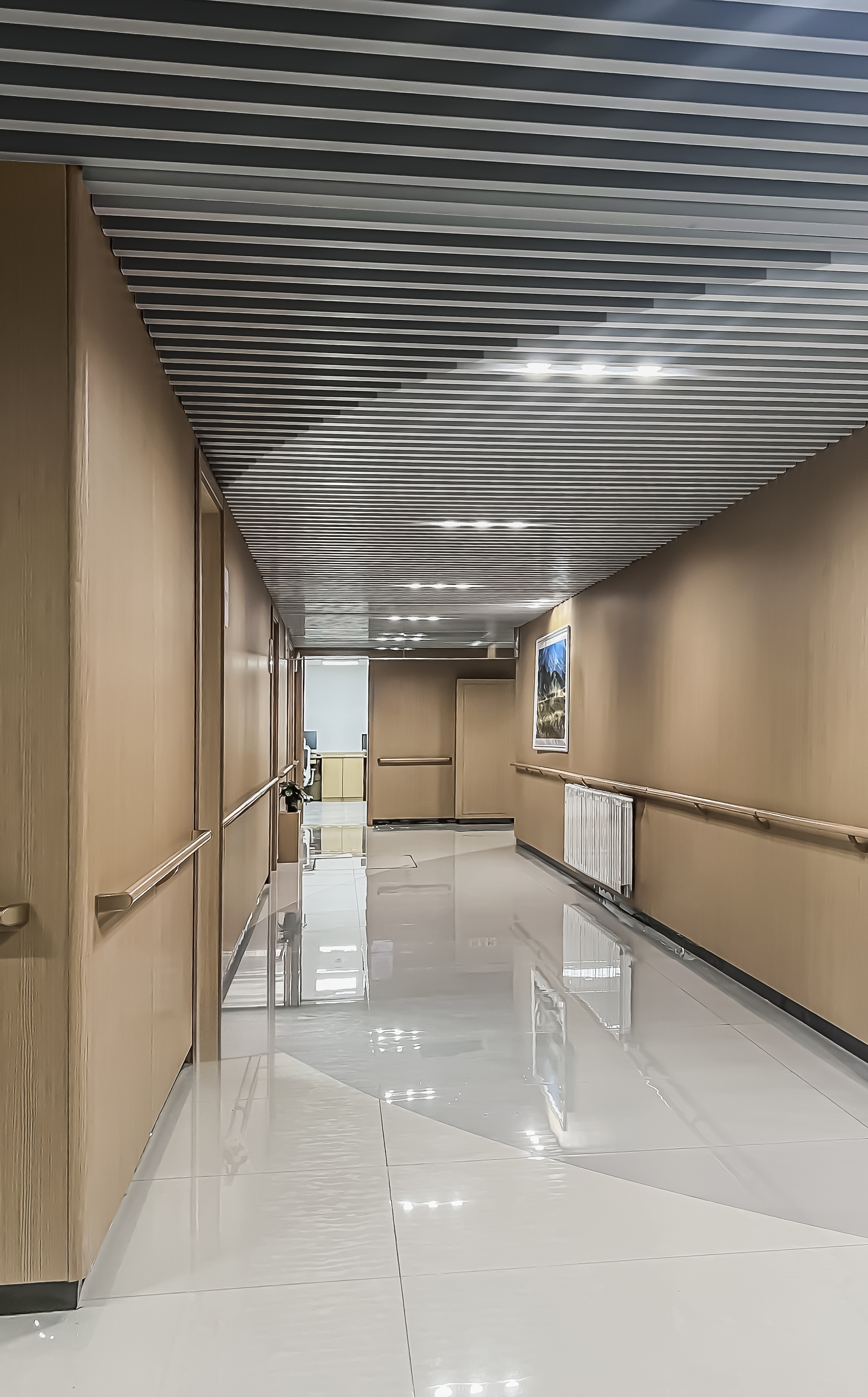 设计选材:公共建筑对于地下室的装饰材料防火等级要求非常严格,本次设计除特殊区域的地面为B1级外,其它区域均采用A级防火材料,这也增加了装饰材料的选择难度。公共区域地面为地砖、机房内及医护区内地面为塑胶地板。墙面装饰为金属木纹板、医疗板搭配无机防火涂料。顶部铝方通搭配石膏板无机防火涂料。