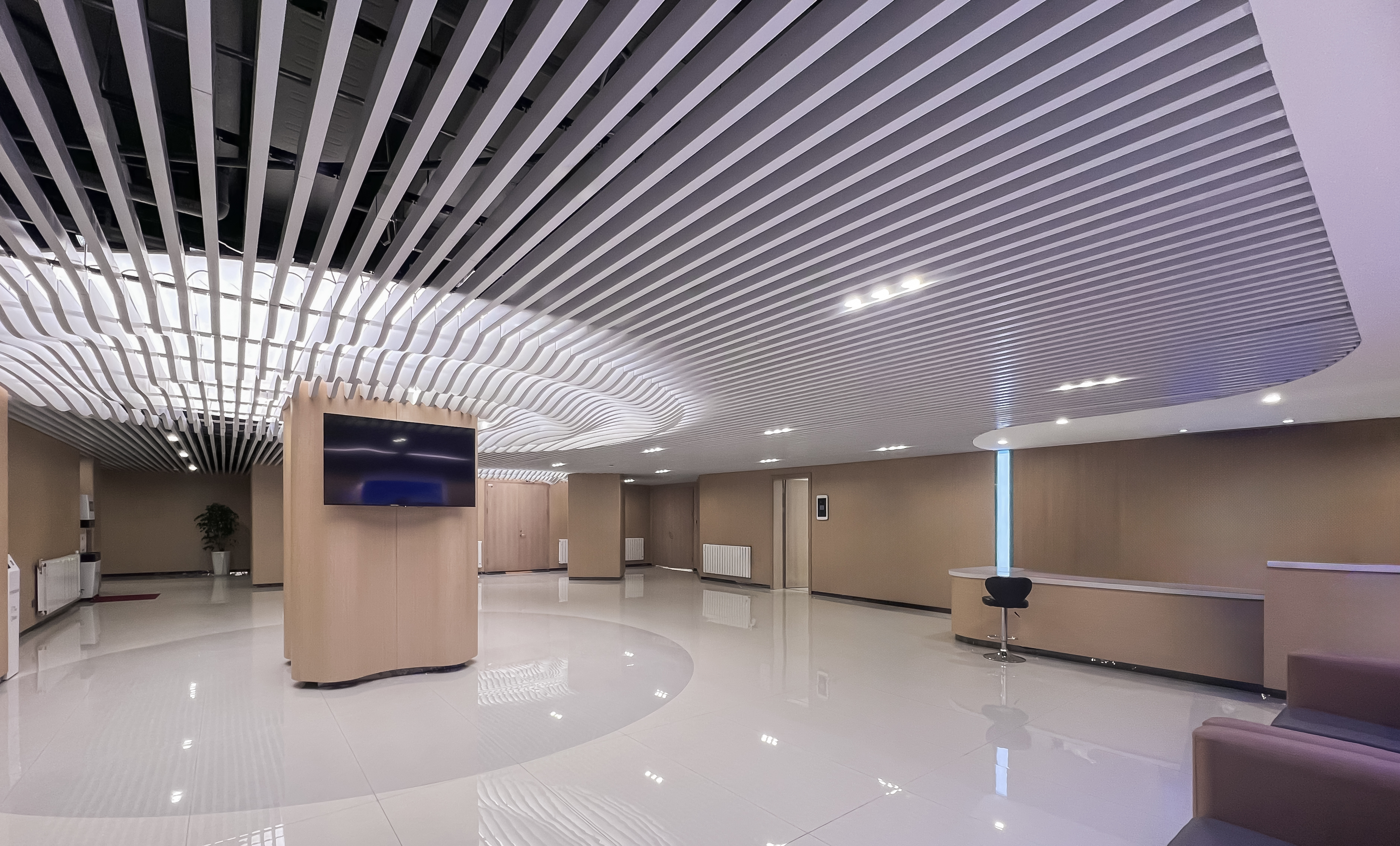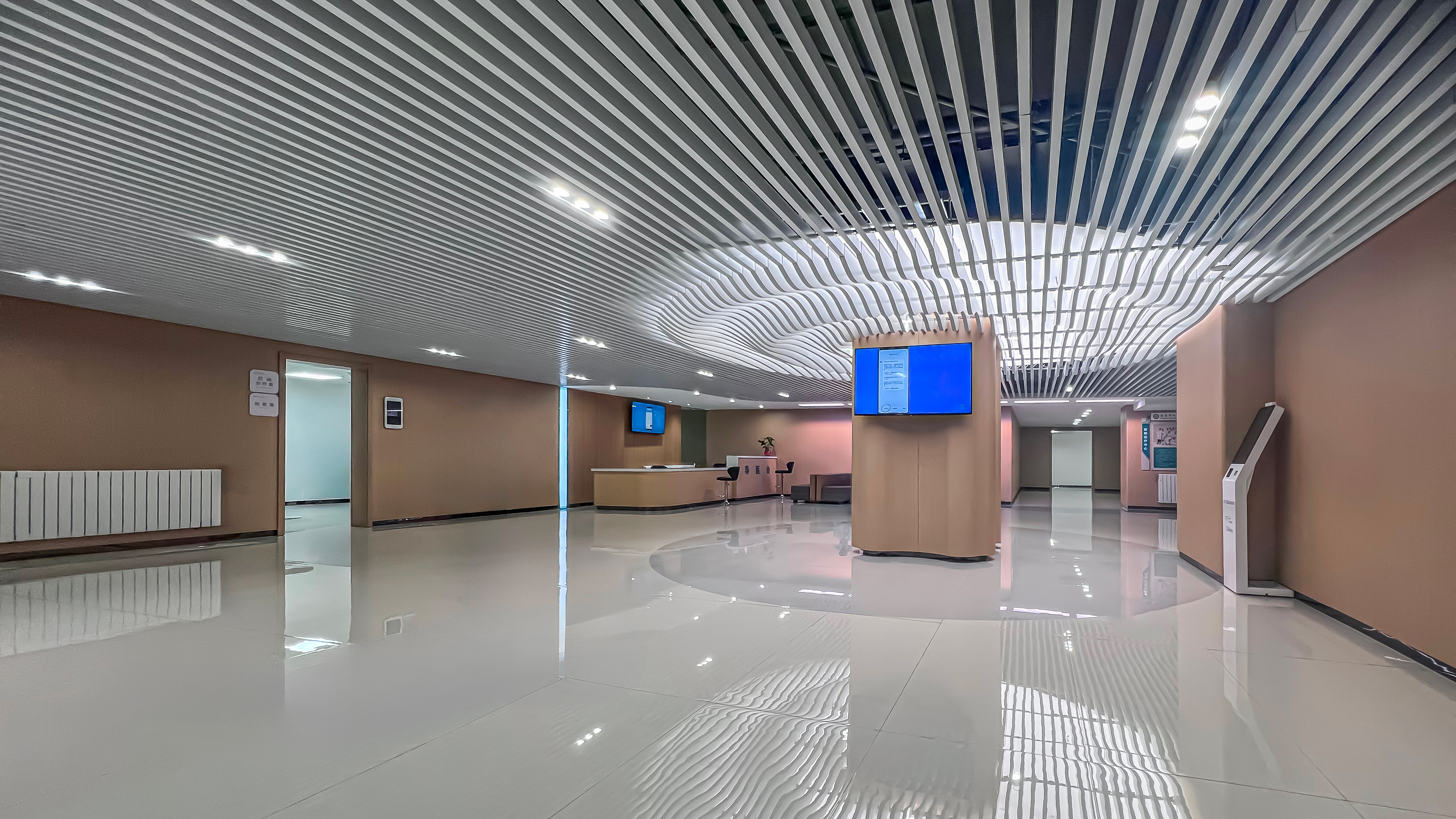 空间意境:由于肿瘤治疗中心对环境的特殊要求,整体建在地下二层,缺乏自然采光,考虑到在此空间就诊的患者多为特殊病患,整体空间灯光设计尽可能模拟自然采光效果,装饰设计上以九曲黄河为“地”,沙漠山川为“顶”,融入自然元素,使空间变得灵动。由于层高限制,特别将候诊区顶部设计成镂空的波浪形,从视觉上给人以上升的空间视觉效果,减少因空间的局限给人造成的压抑感,在直线加速器机房顶部安装晴空灯,模拟天光从日出到黄昏的自然采光效果。