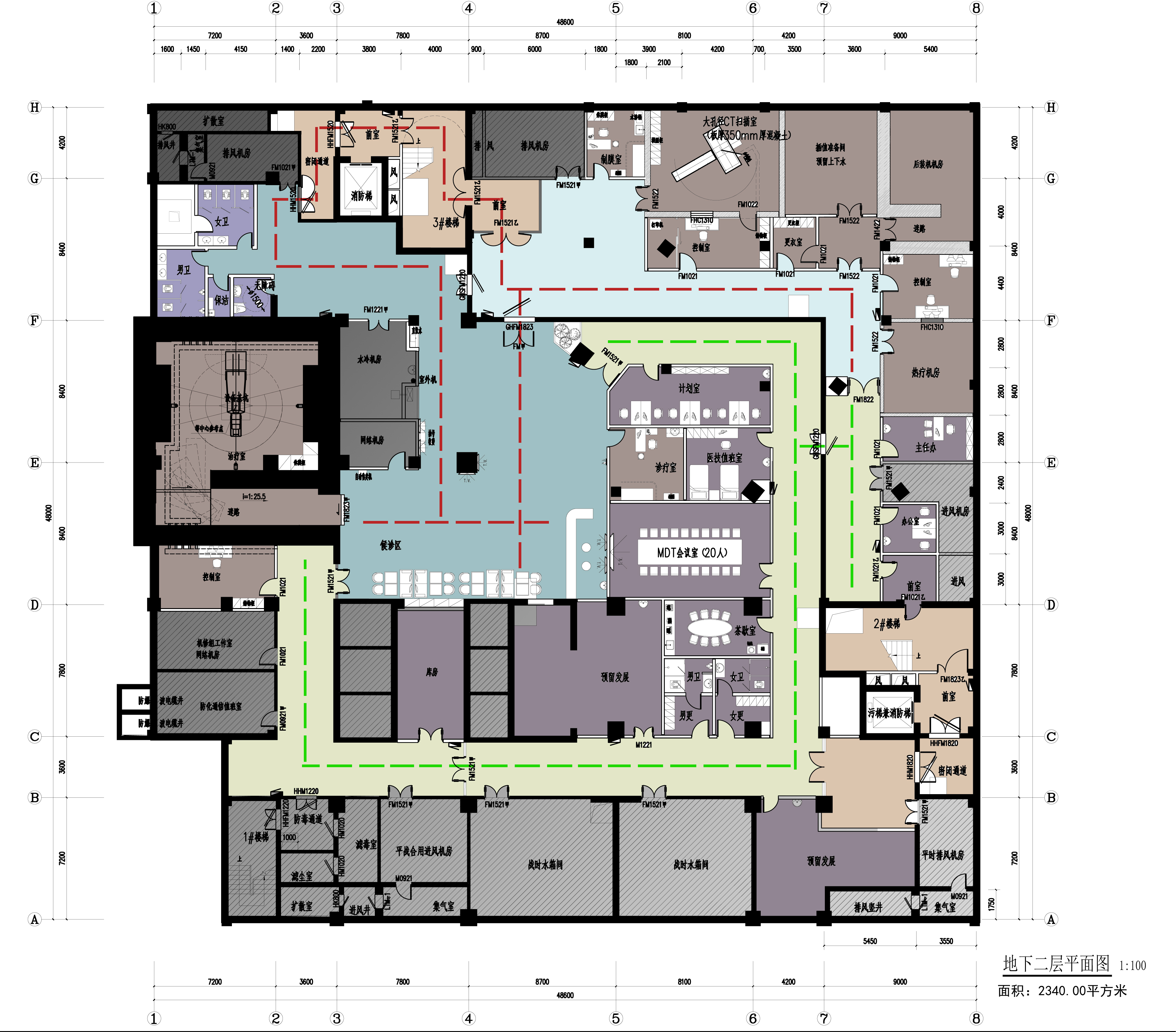 空间布局:整体空间分为医疗区和医护区。其中医疗区内设候诊区、各类治疗机房、诊疗室、患者卫生间。医护区内设MDT会议室、茶歇间、卫生间及更衣间、各类办公室、值班室。