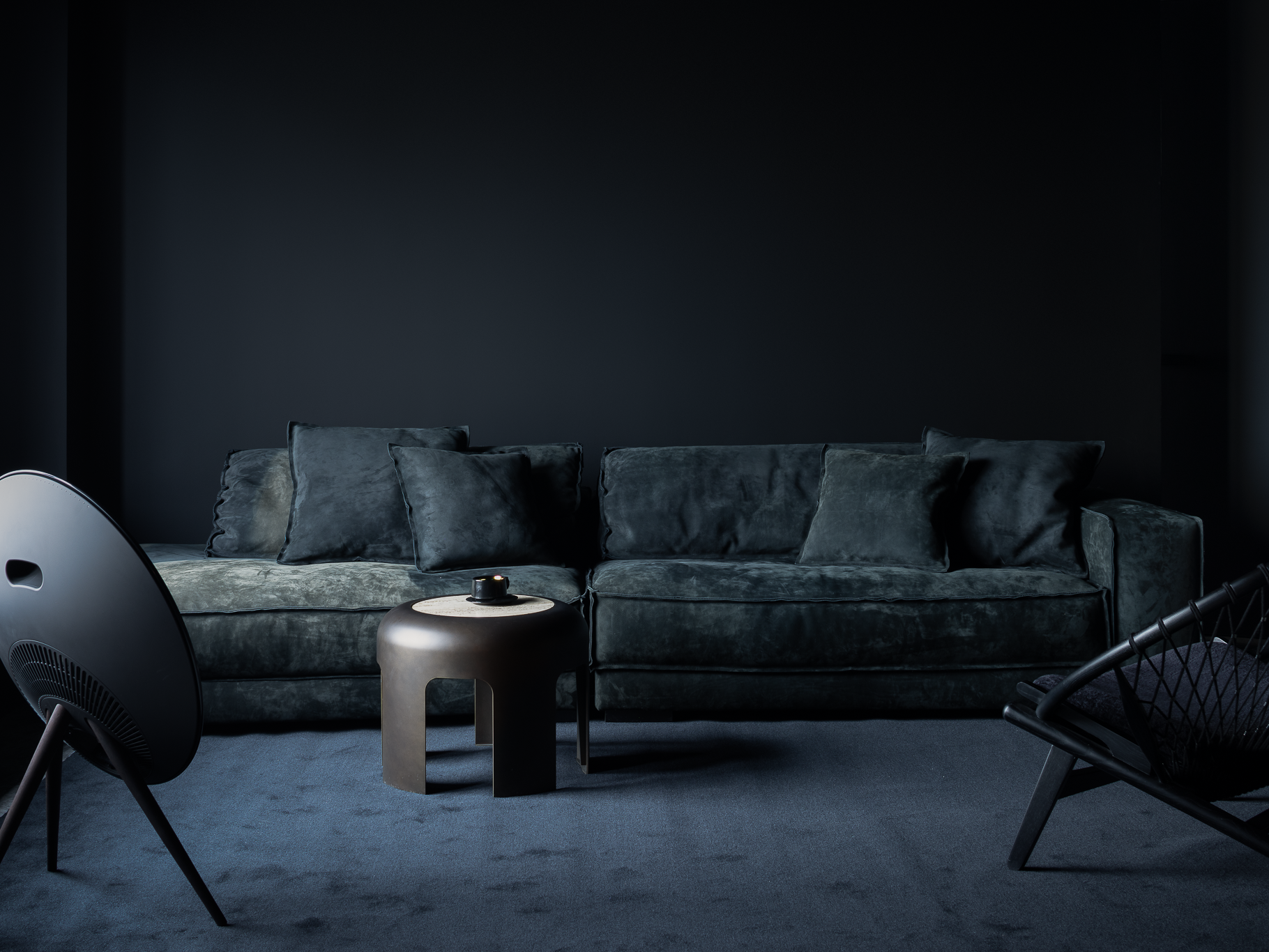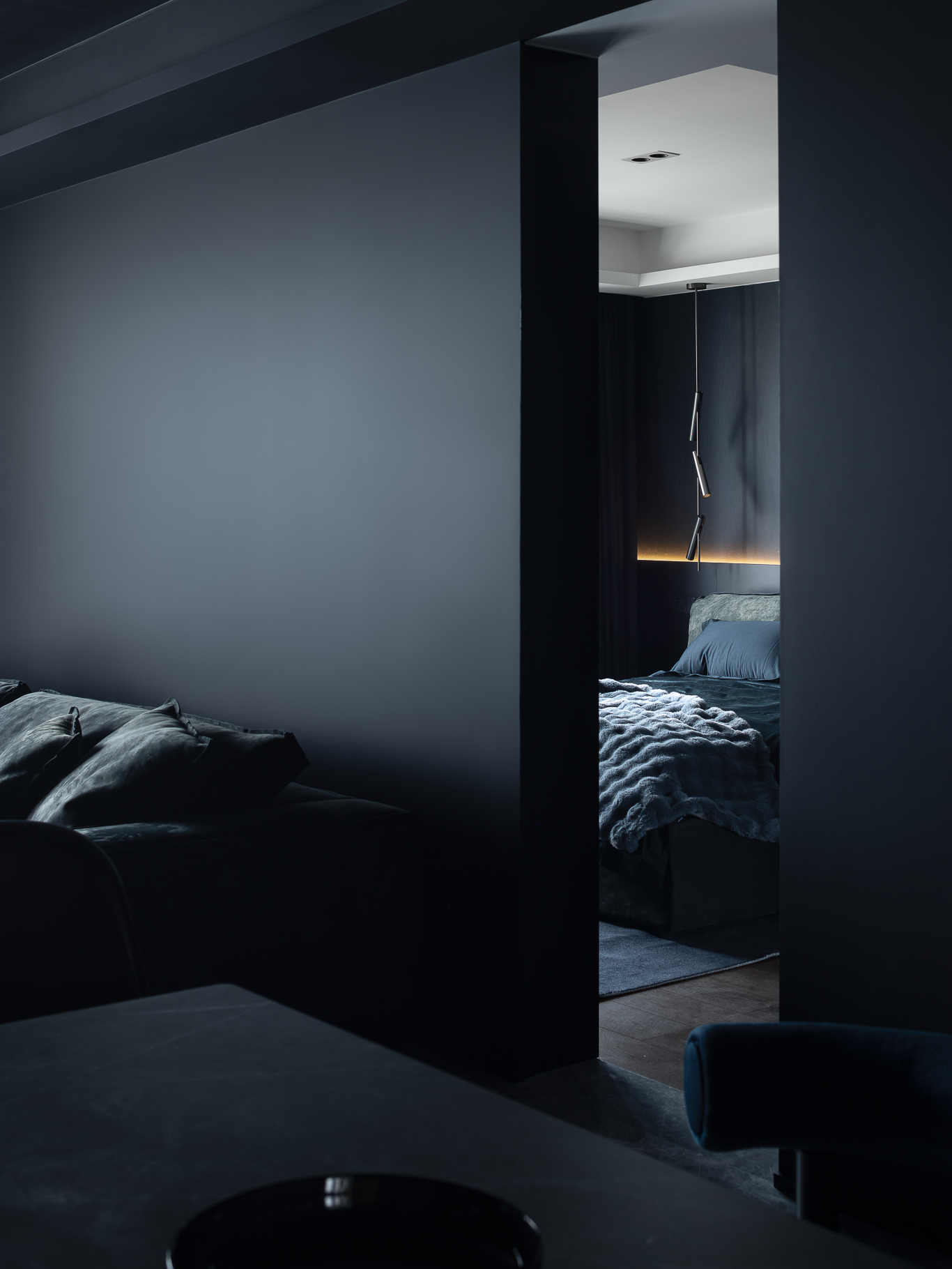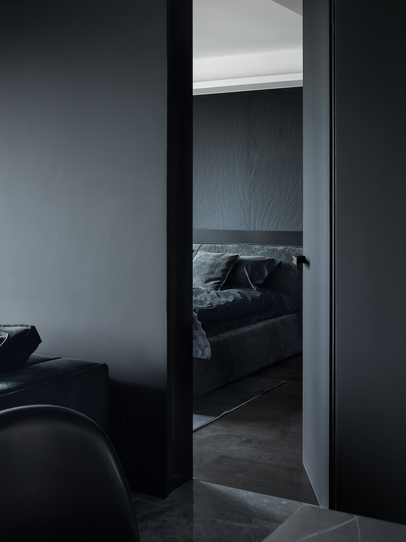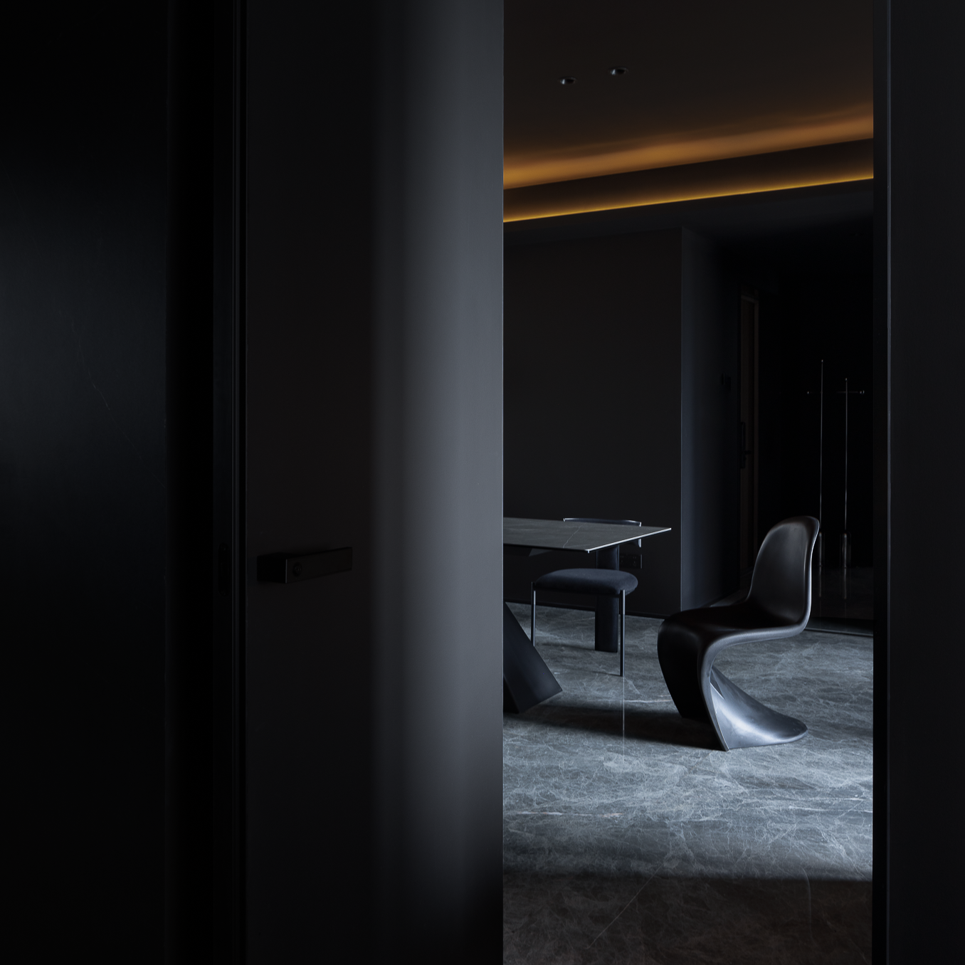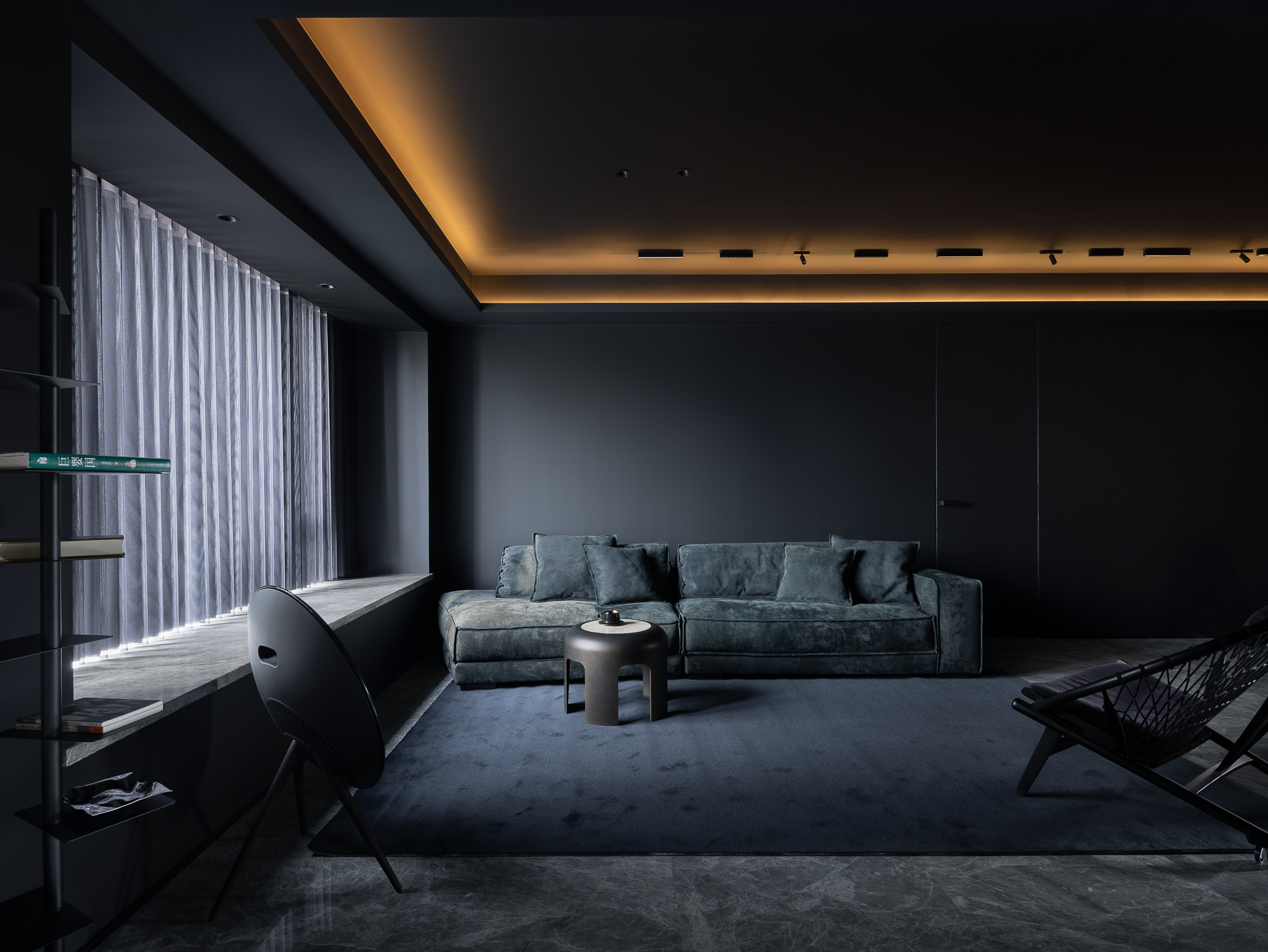 黑色对场域的营造是极具深邃的,它让你一眼观察不出空间的具体模样。本案的客厅虽是深色调,但在细究之下,深得很有层次感。 黑色的墙体、玄青的地砖、BAXTER磨砂皮沙发、紫黑的躺椅和深灰的餐桌,这几种不同色系围合、穿透、糅合、塑形。构建了家的主心骨,表达了空间或静谧、或高级、或隐现的感知。