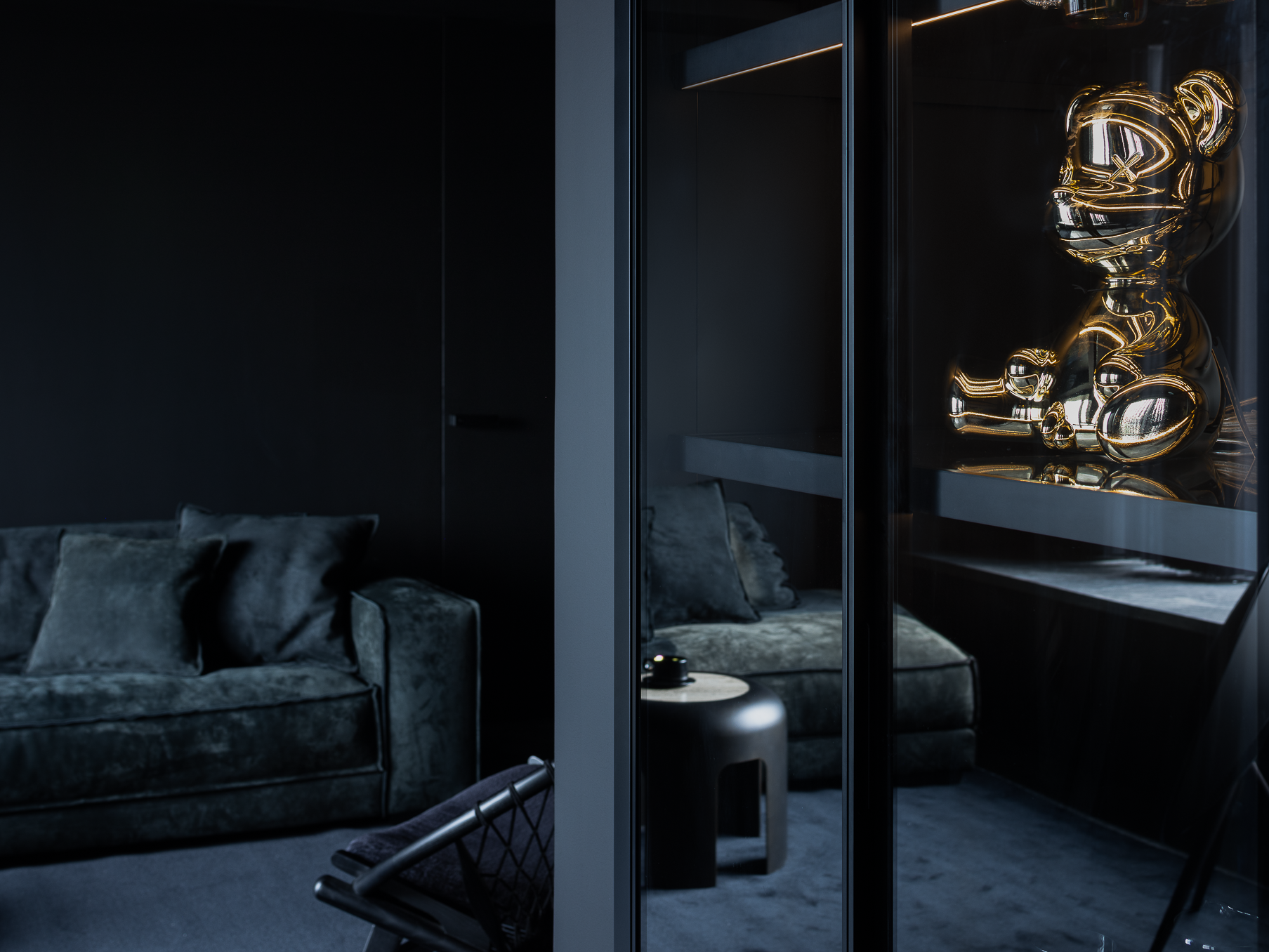黑和金是绝妙的组合,而设计者擅长用各种趣意满满的物件,来聚焦空间的核心和亮点。客厅的米色茶几,使得人的注意力为其所吸引。玻璃橱柜中的玩偶手办,在灯光映衬之下熠熠生辉,这股贵族的气质,也彰显业主的个性和品位。