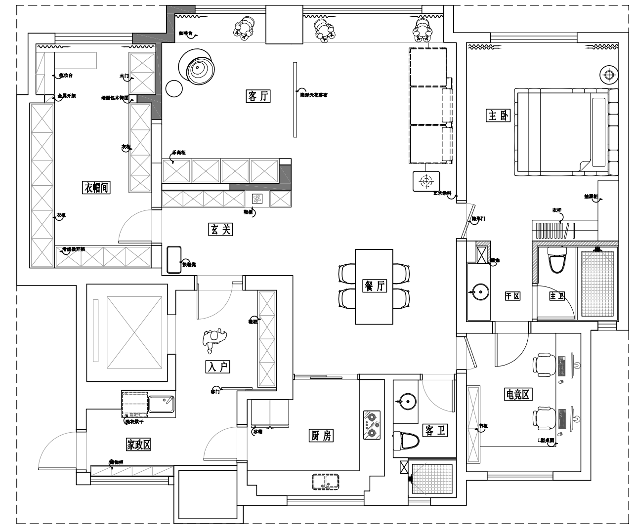 空间布局:空间布局上,打通书房与客厅,打通卧室与衣帽间,成为一个套间,让155的空间成为一个人的舞台。