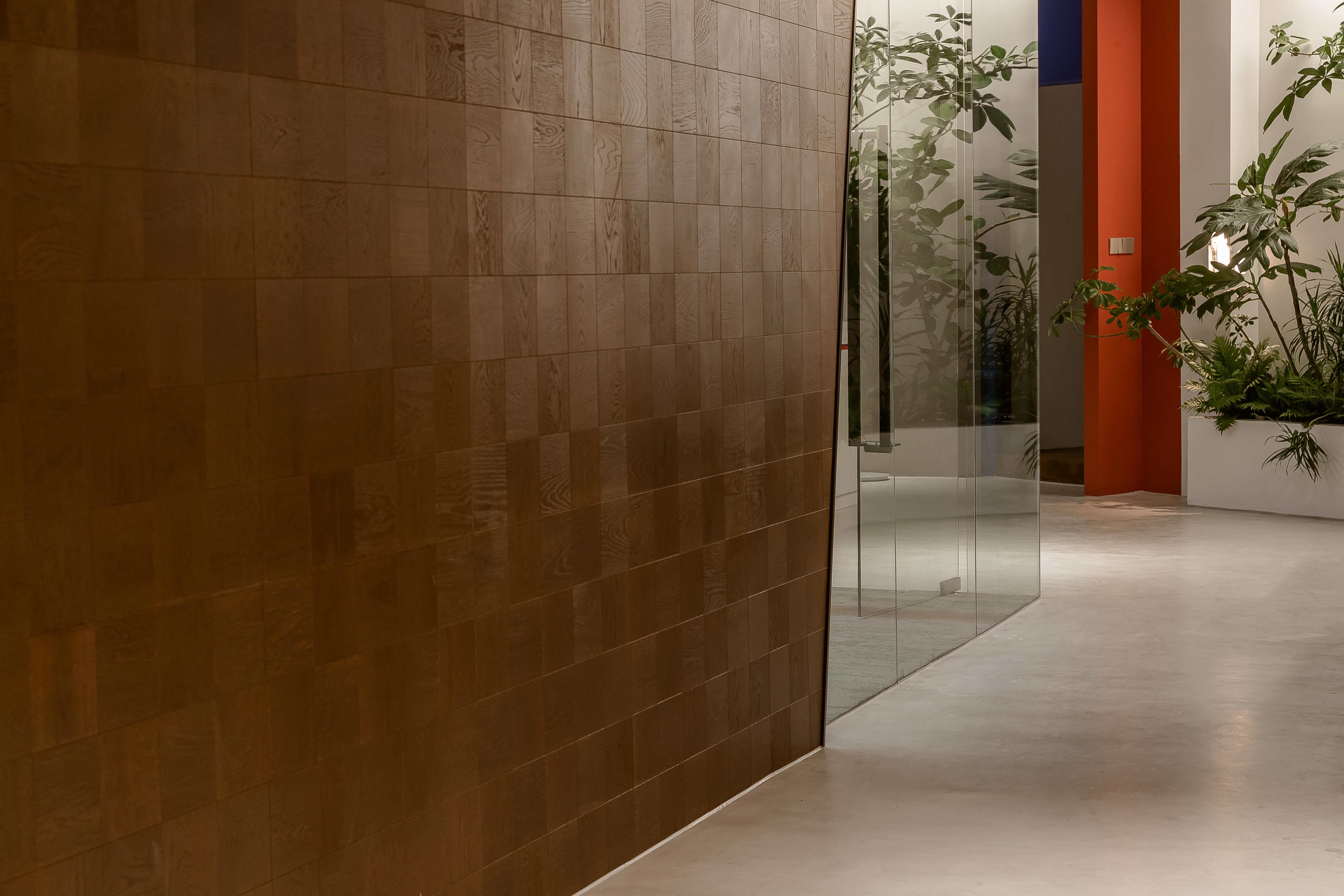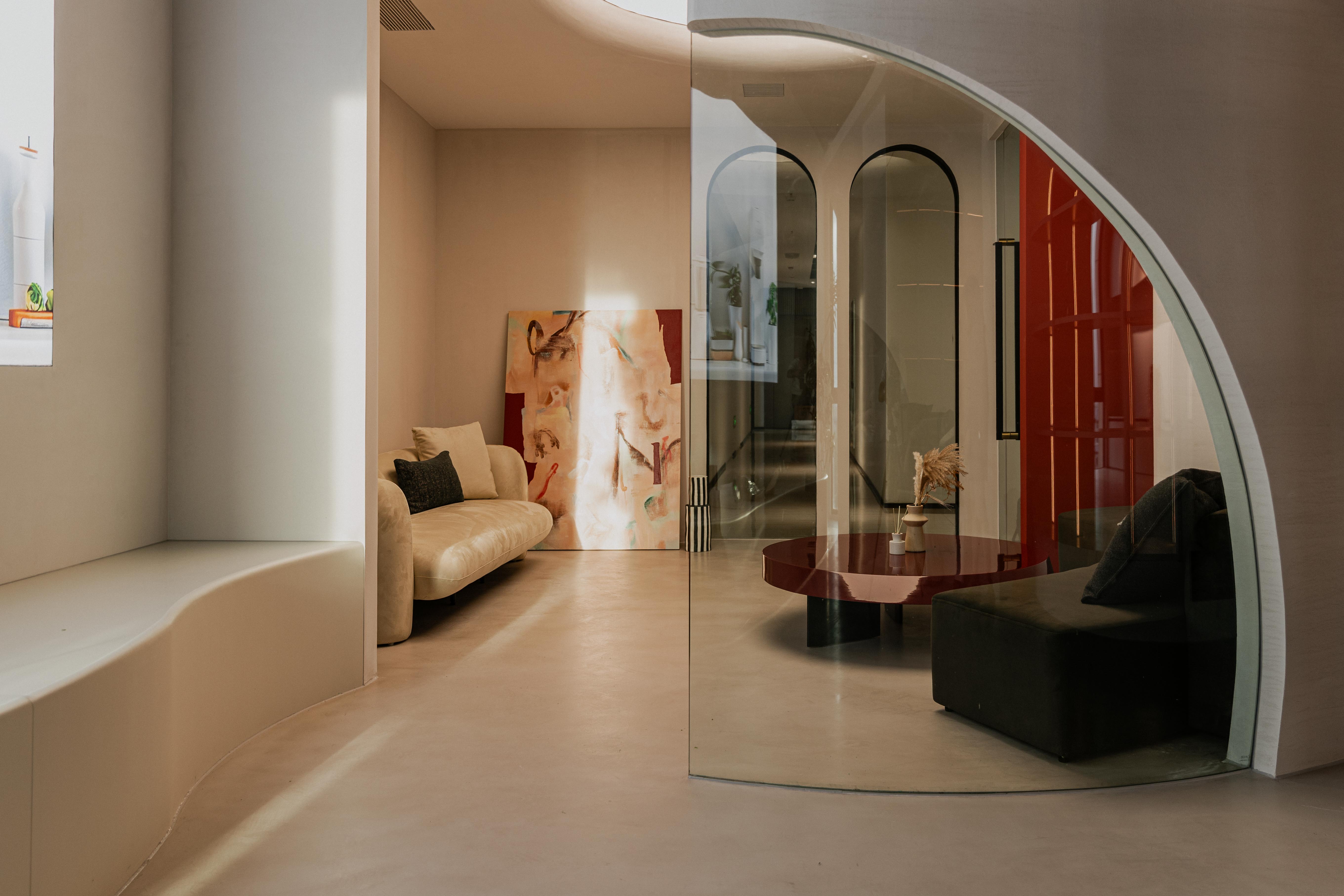 空间意境:在本设计中,色彩是关键元素。我们采用了多种鲜艳的颜色,如红色、蓝色、绿色、棕色等,来打造一个充满活力和热情的工作环境。红色,热情奔放,寓意美好。在这个卷卷卷的时代,红色可以带动工作的积极性。展厅部分设计融入外建筑形态,弧度造型重新延展了空间的纵深,让我们感受到时尚、潮流、热情的工作氛围。另外,我们将地板上墙,去往茶室的通道做了艺术画廊墙,高级简约环保。门头用方块地板墙做了漏斗造型,寓意兜满财富。