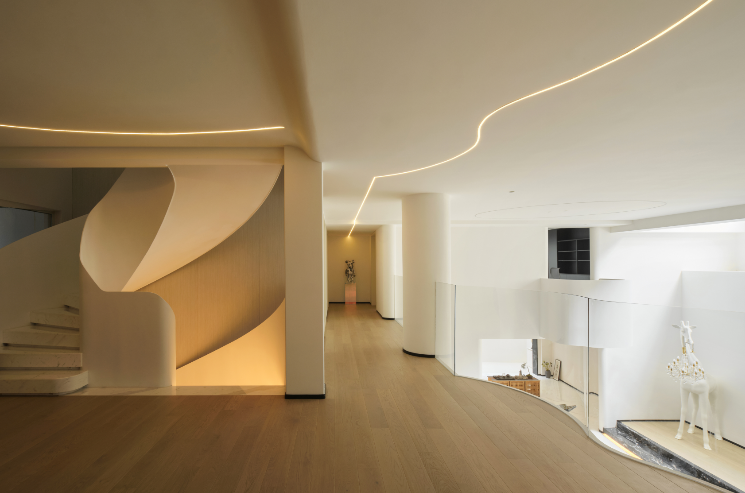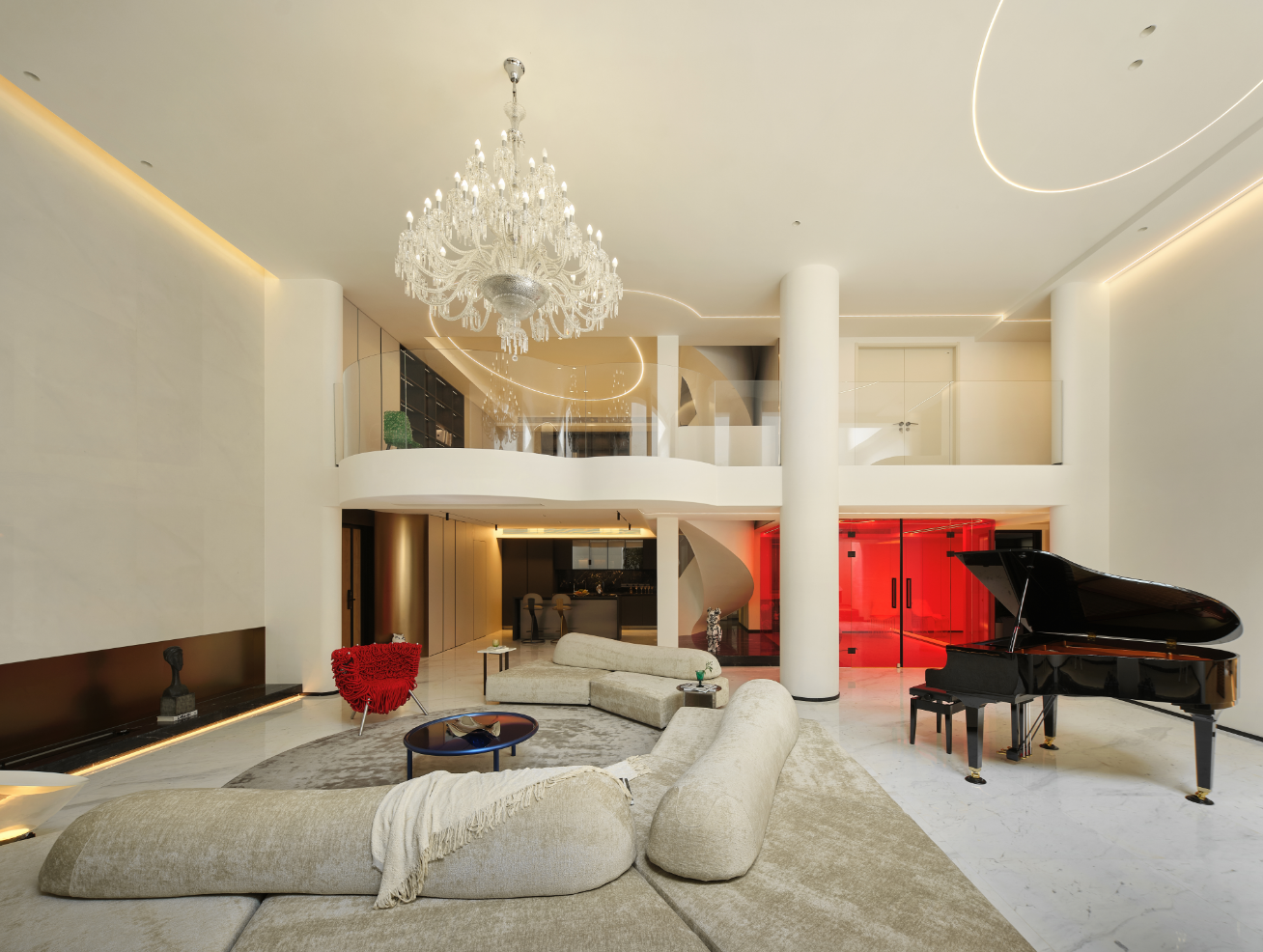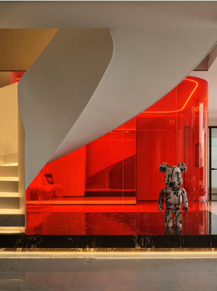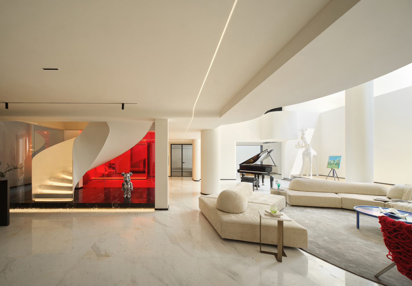 空间布局:从负二层入户归家,一进门是一个白色雕塑般的楼梯,坐落在黑色的大理石上面,黑色的大理石我代表水的意向,以红色的烤漆玻璃为背景,一进门就会有一个非常有视觉冲击力的景象。红色的烤漆玻璃里边是女儿的舞蹈房。我把每个空间都是做的串通的,负一层的书房我特意做了一个挑台出来,让负一层和负二层可以形成上下空间的互动。负一层的挑台我做成了云朵状的形状,负一层的顶的线性灯我也做成了云朵状的延伸,和楼下三角钢琴的形状刚好可以形成呼应,整个空间就是一个艺术气息很浓的感觉