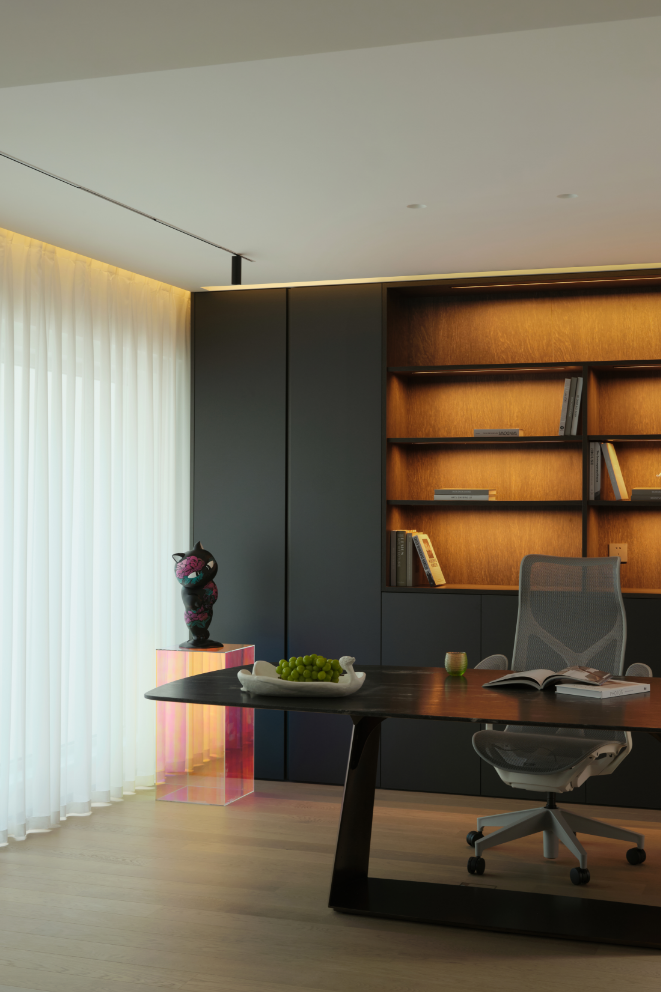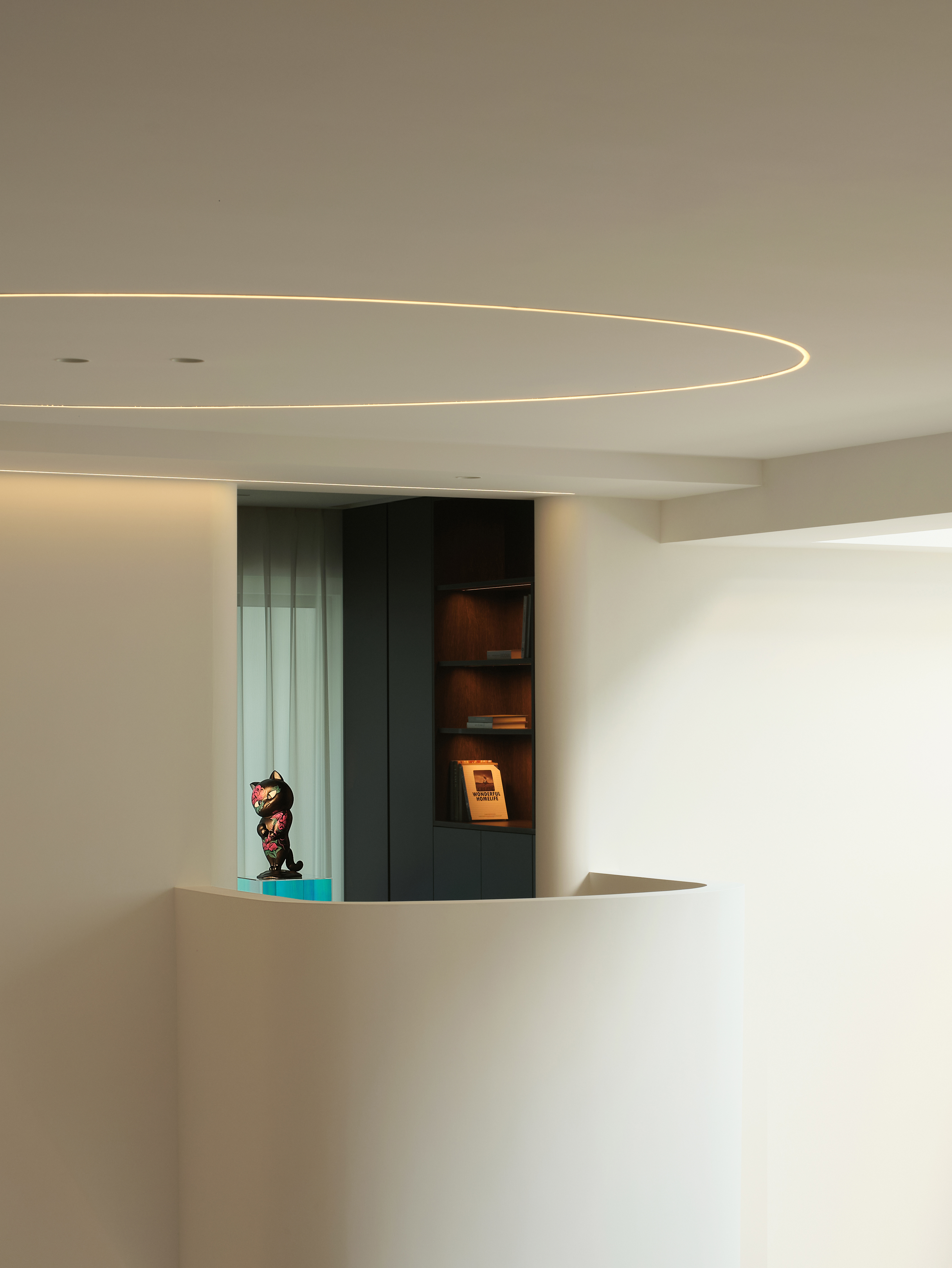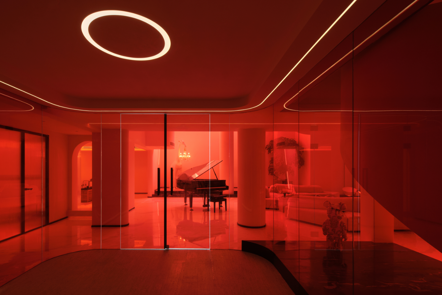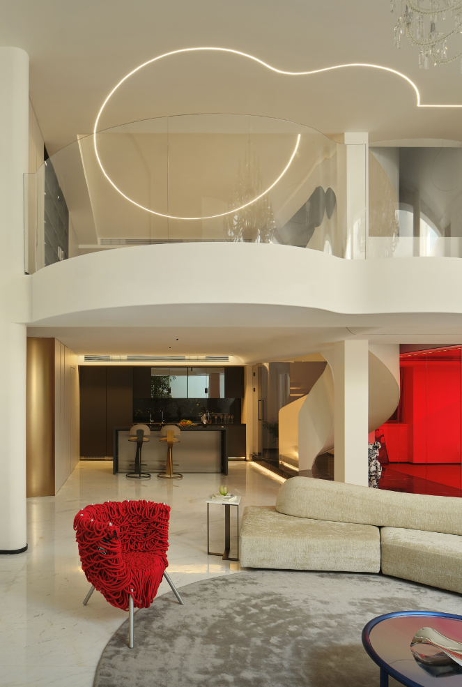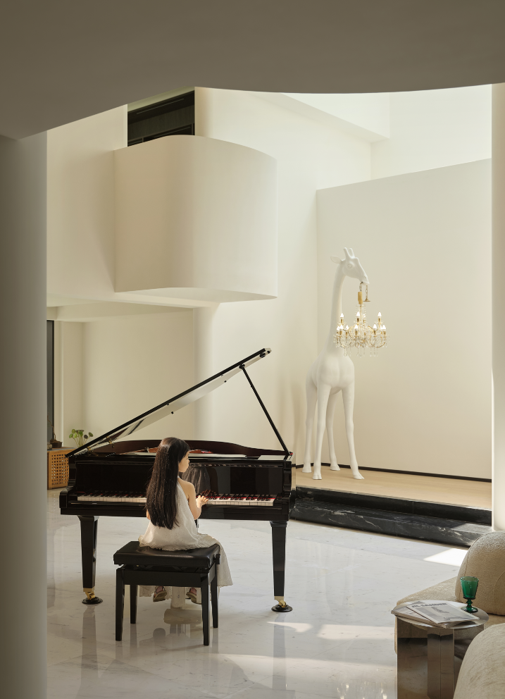 空间布局:从负二层入户归家,一进门是一个白色雕塑般的楼梯,坐落在黑色的大理石上面,黑色的大理石我代表水的意向,以红色的烤漆玻璃为背景,一进门就会有一个非常有视觉冲击力的景象。红色的烤漆玻璃里边是女儿的舞蹈房。我把每个空间都是做的串通的,负一层的书房我特意做了一个挑台出来,让负一层和负二层可以形成上下空间的互动。负一层的挑台我做成了云朵状的形状,负一层的顶的线性灯我也做成了云朵状的延伸,和楼下三角钢琴的形状刚好可以形成呼应,整个空间就是一个艺术气息很浓的感觉