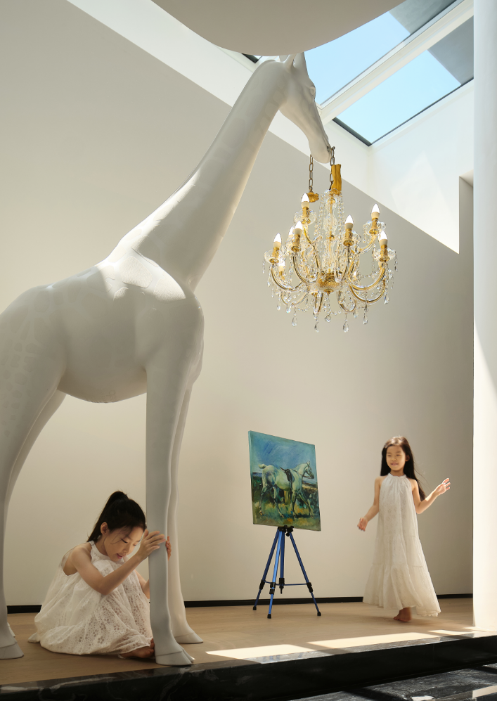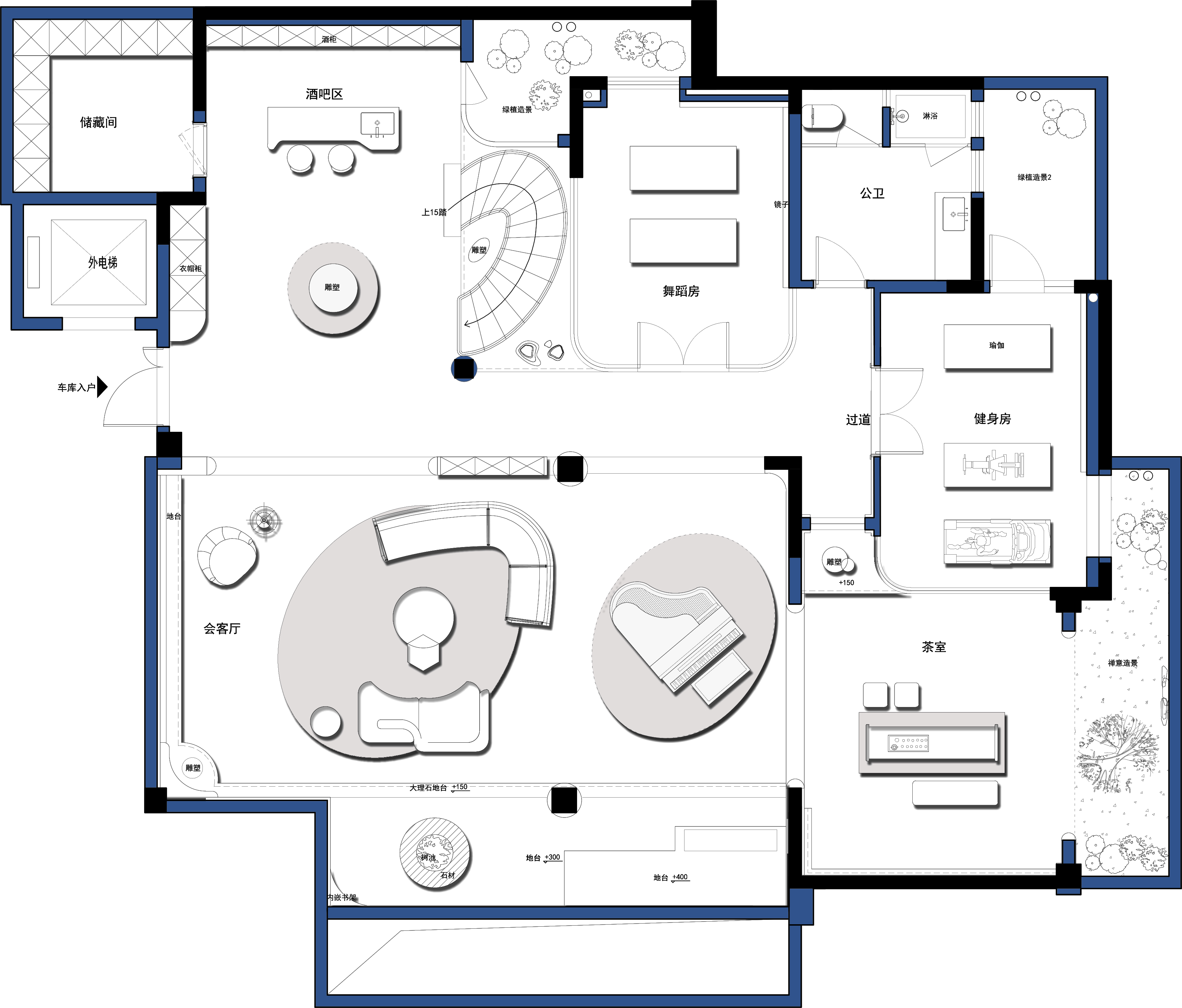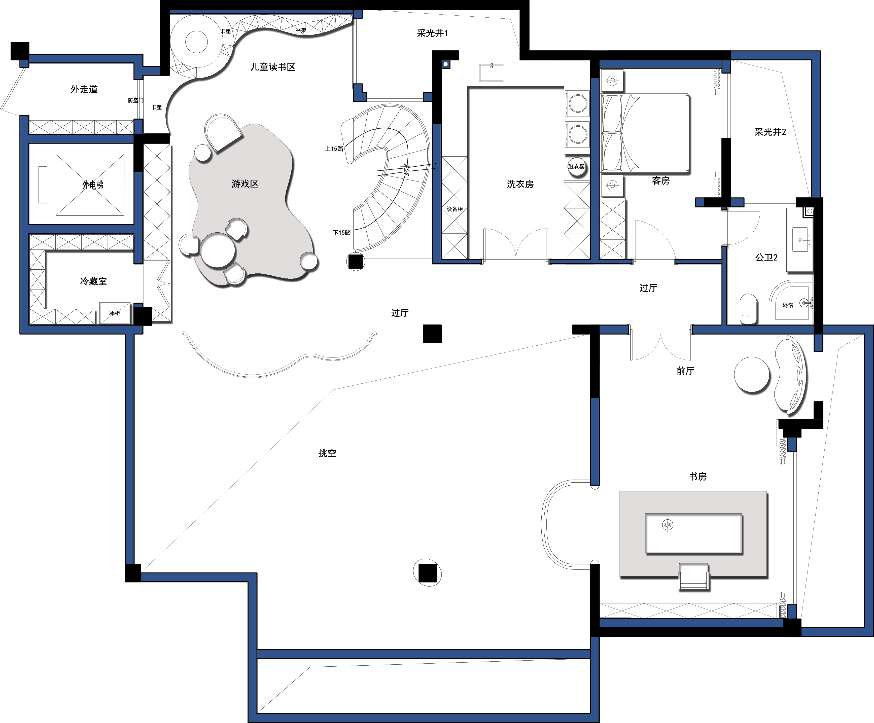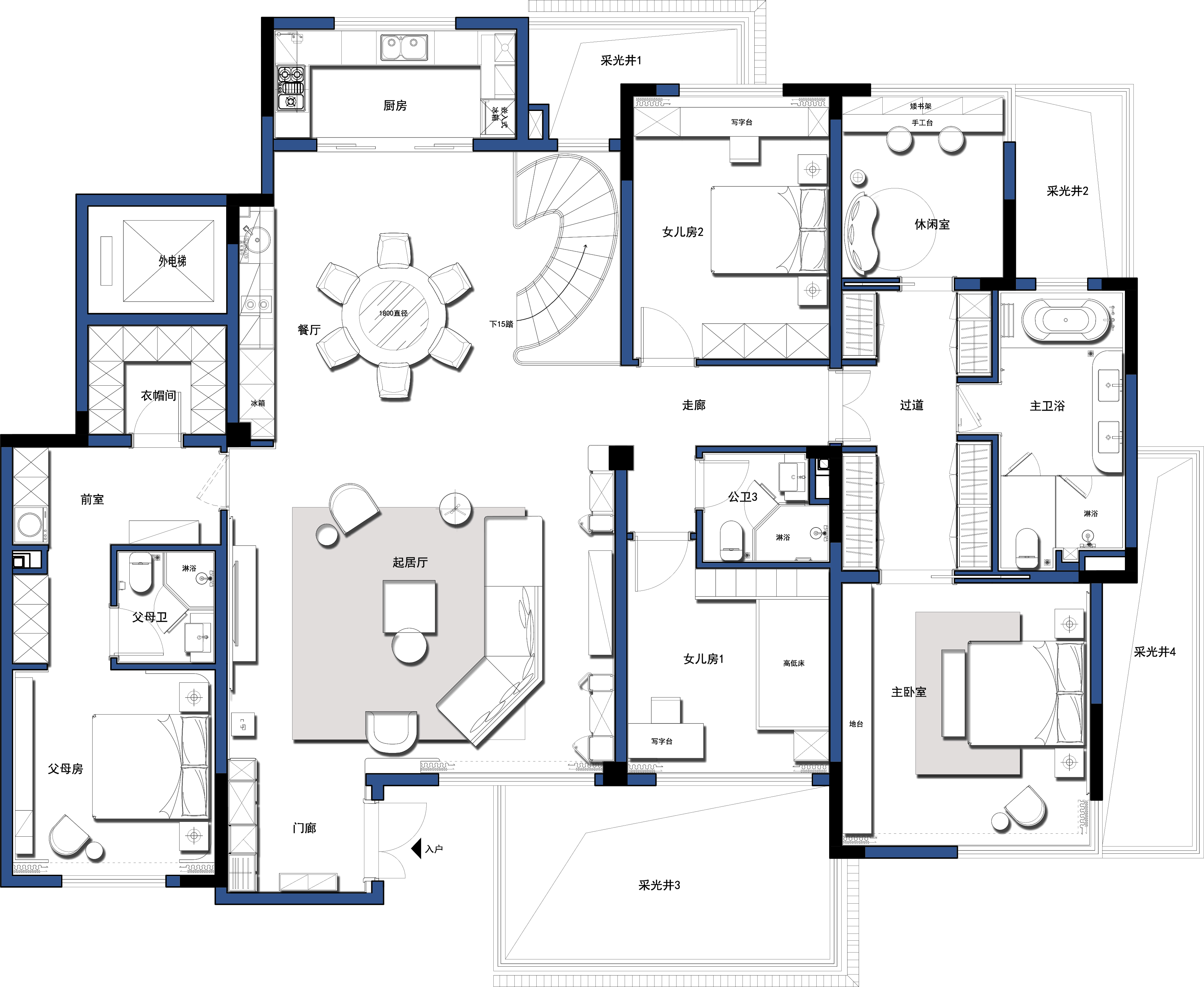 项目定位:这是一个叠加别墅的下叠,三代同堂,一层240平的精装大平层,地下两层,是孩子们的休闲娱乐空间,包括书房,茶室,孩子的读书区,游戏区,舞蹈房,健身房,钢琴厅,娱乐厅等等。
