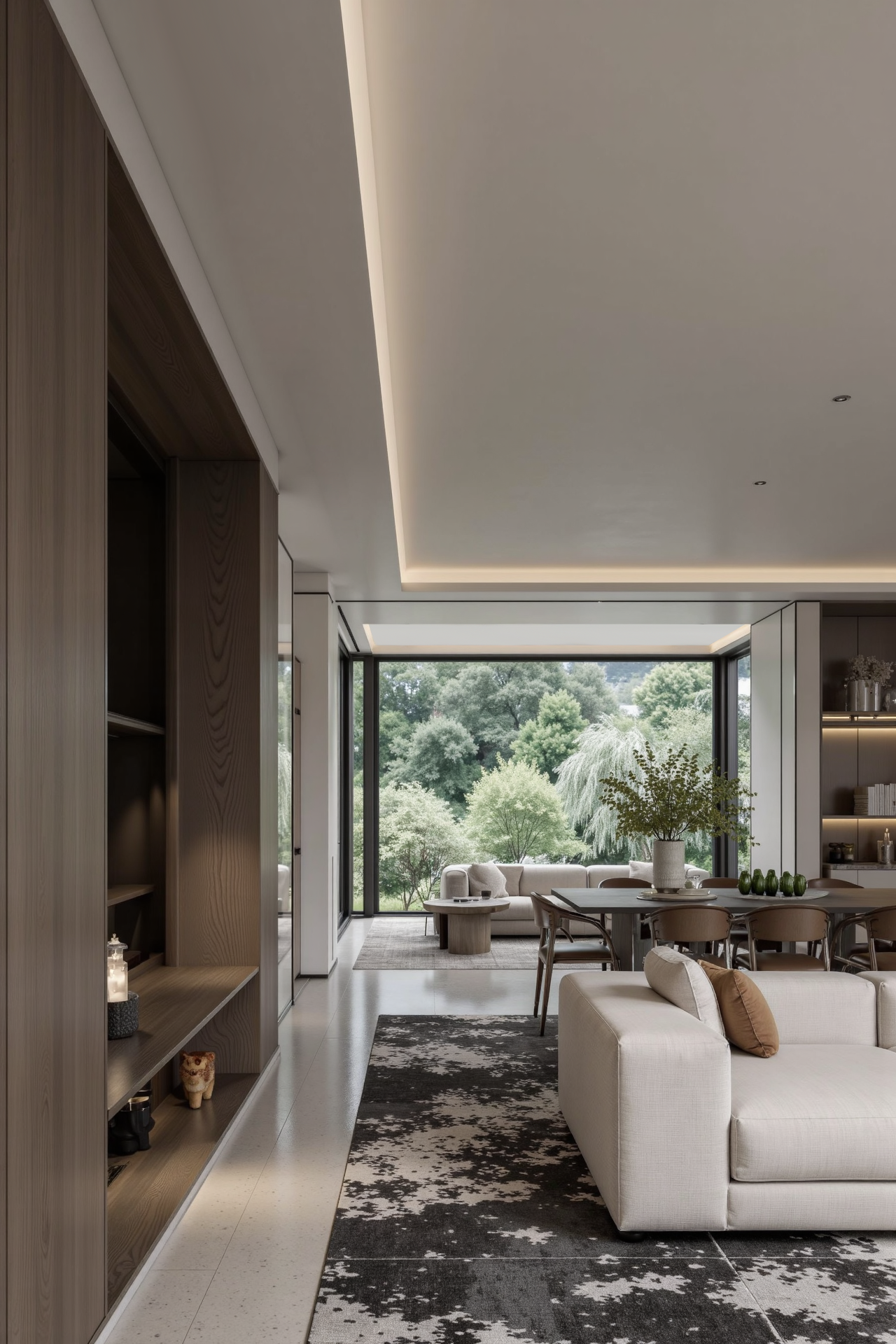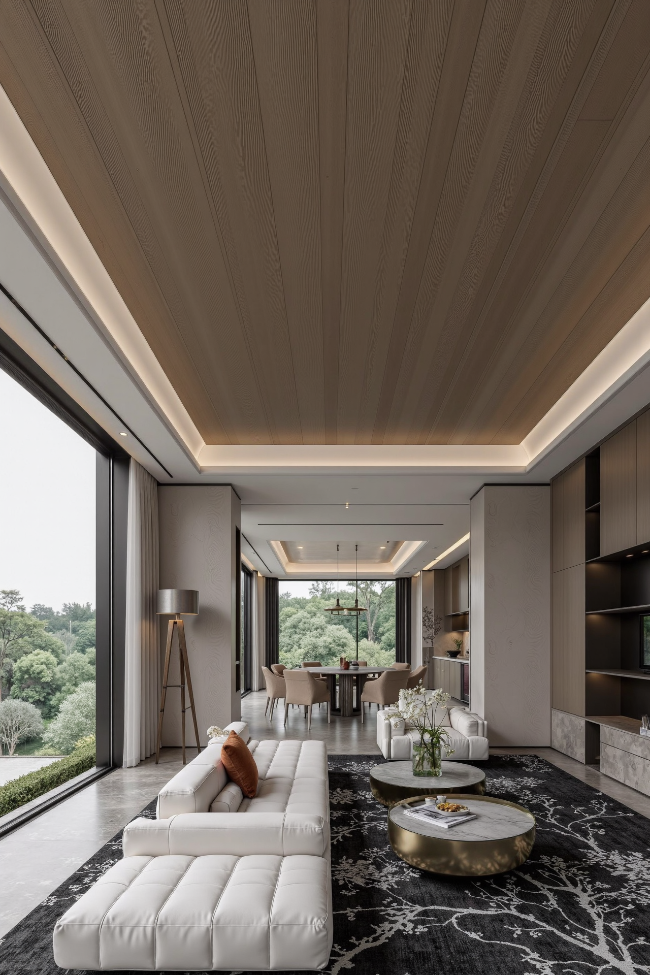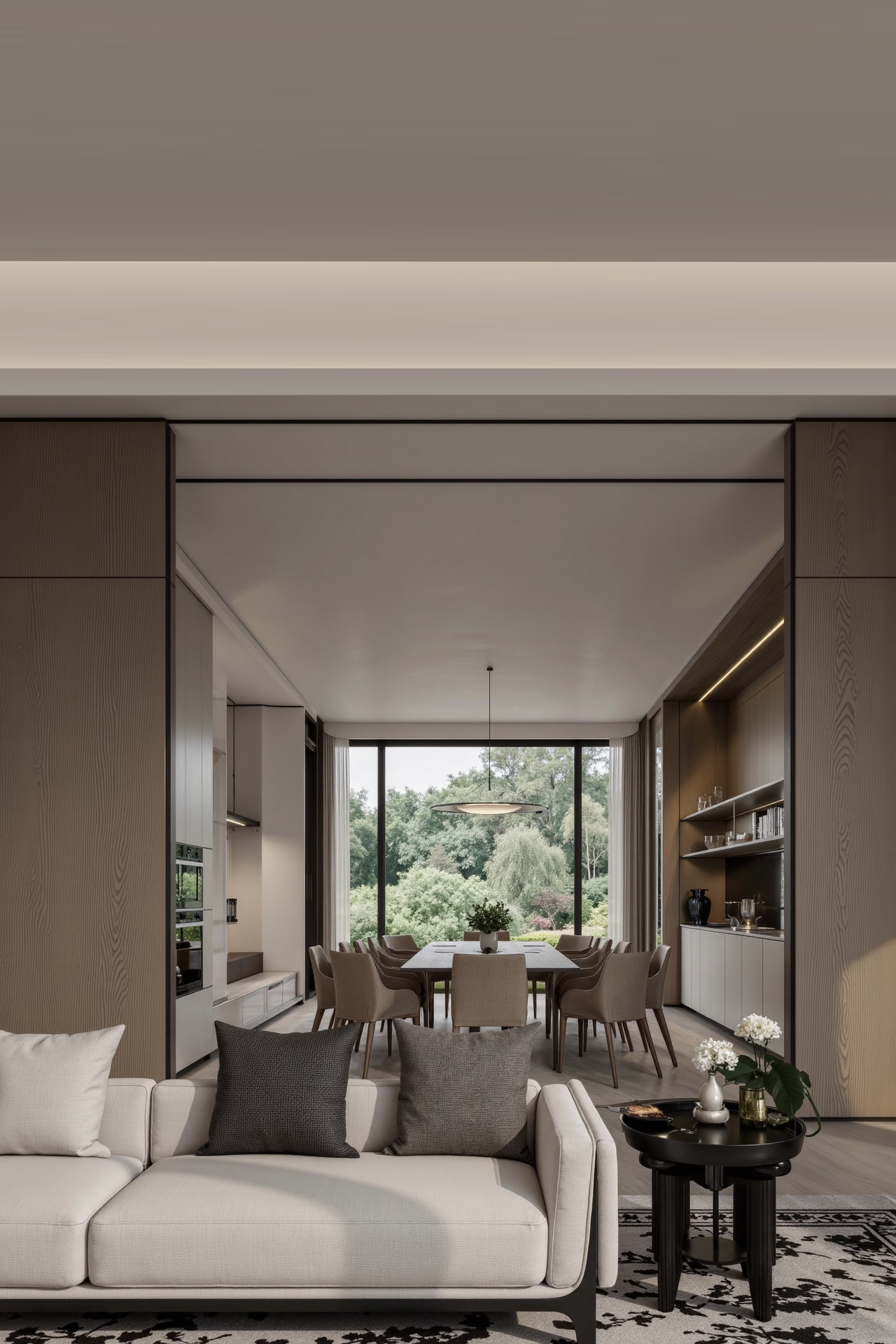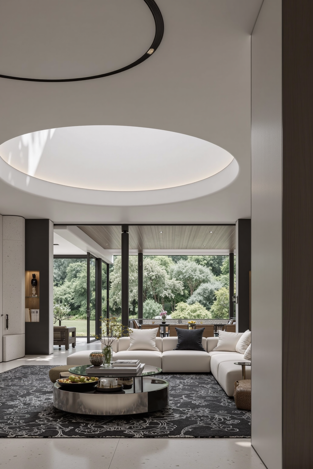 该现代风格别墅作品在环境风格上极具创新。一方面,打破室内外界限,采用大面积落地窗与可折叠玻璃门,将室外景观自然融入室内,模糊空间边界,使室内外浑然一体。另一方面,利用环保新型材料营造独特质感,如仿石纹的可再生板材,兼具美观与可持续性。再者,引入智能生态系统,精准调控温湿度与空气质量,同时搭配绿植墙,打造会 “呼吸” 的居住空间,为居住者带来自然、舒适且极具科技感的全新居住体验,彰显现代生活理念与艺术美学的完美融合。