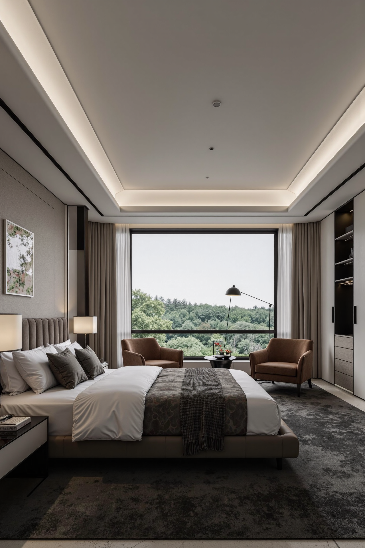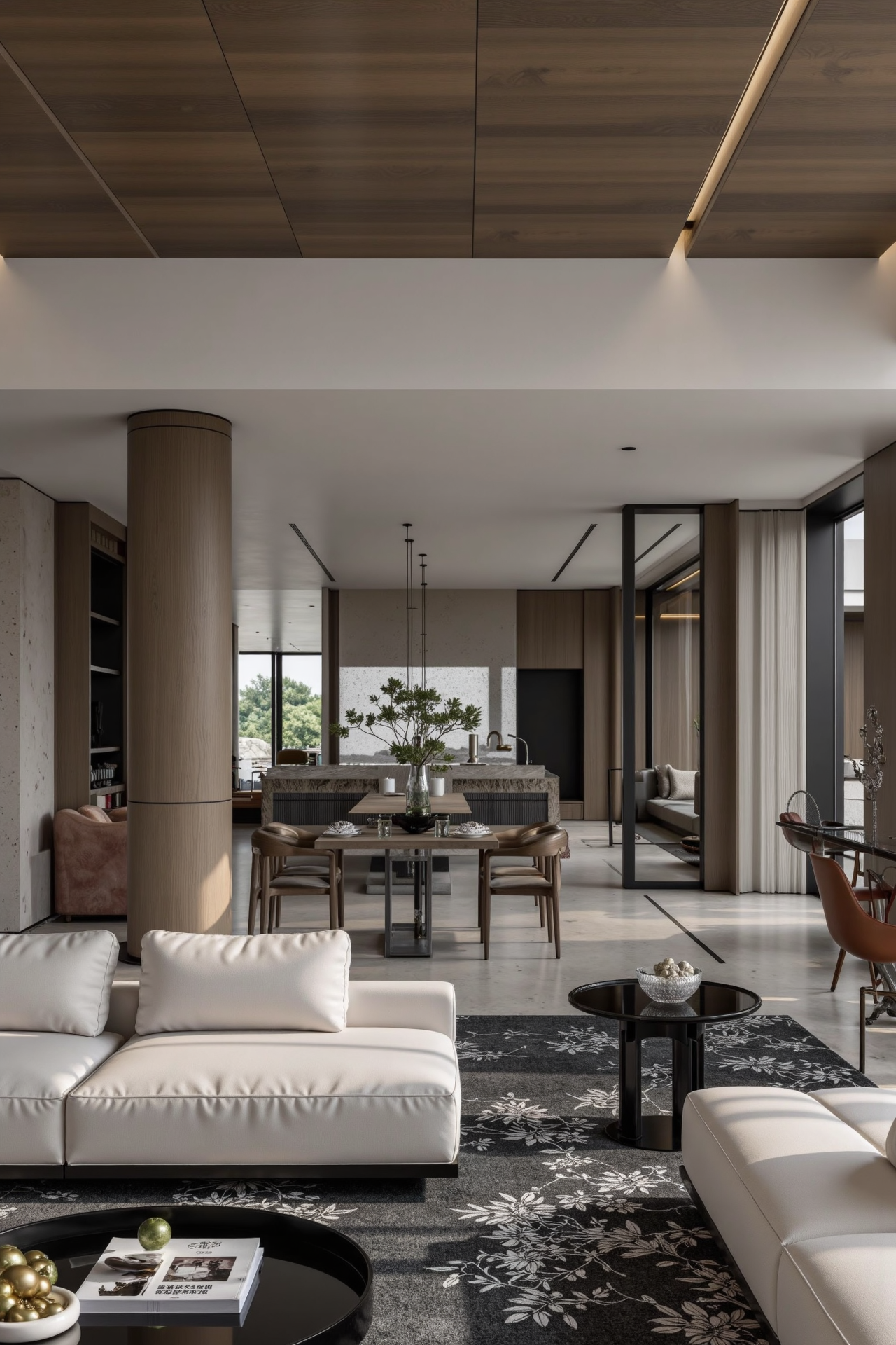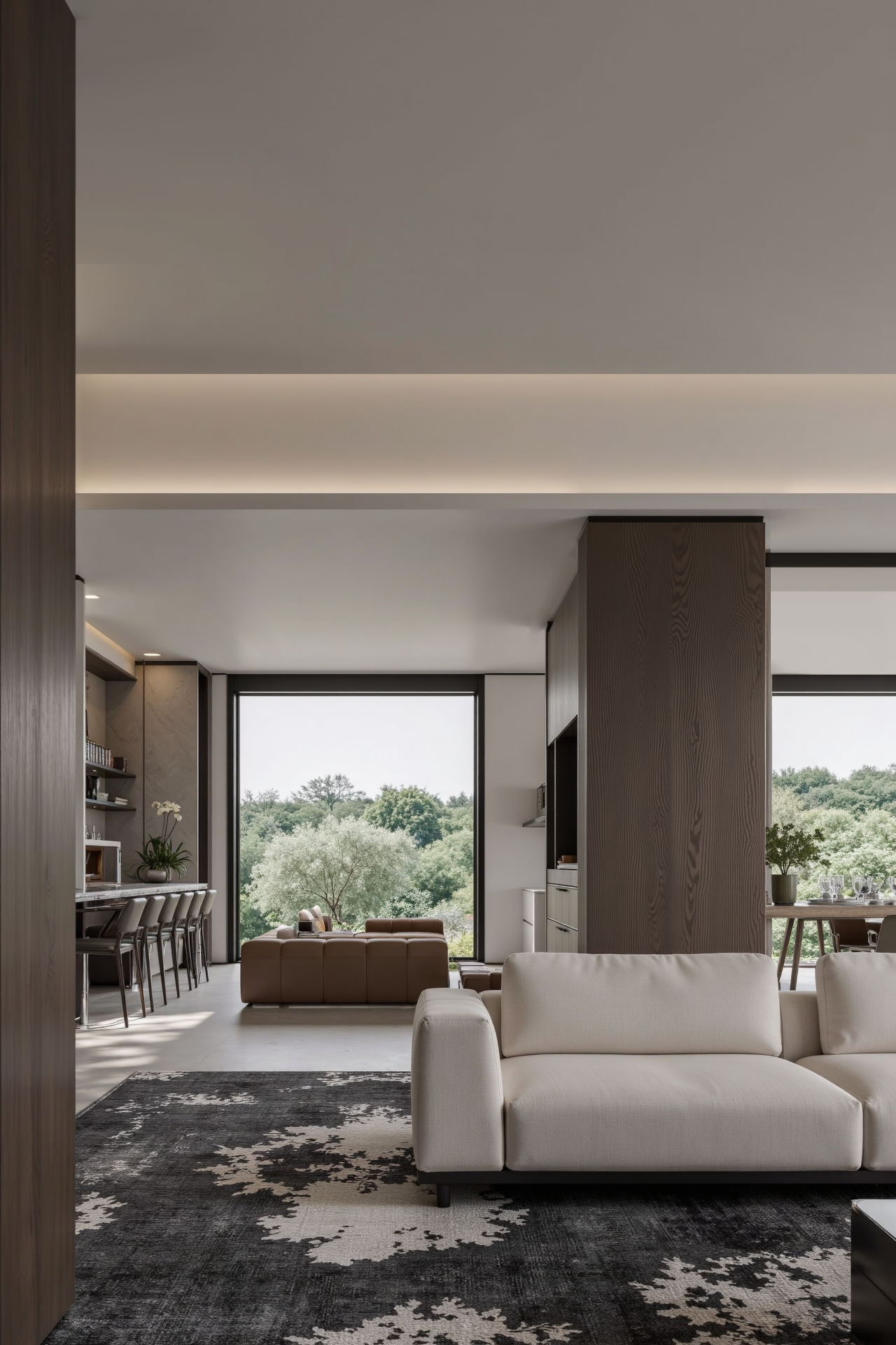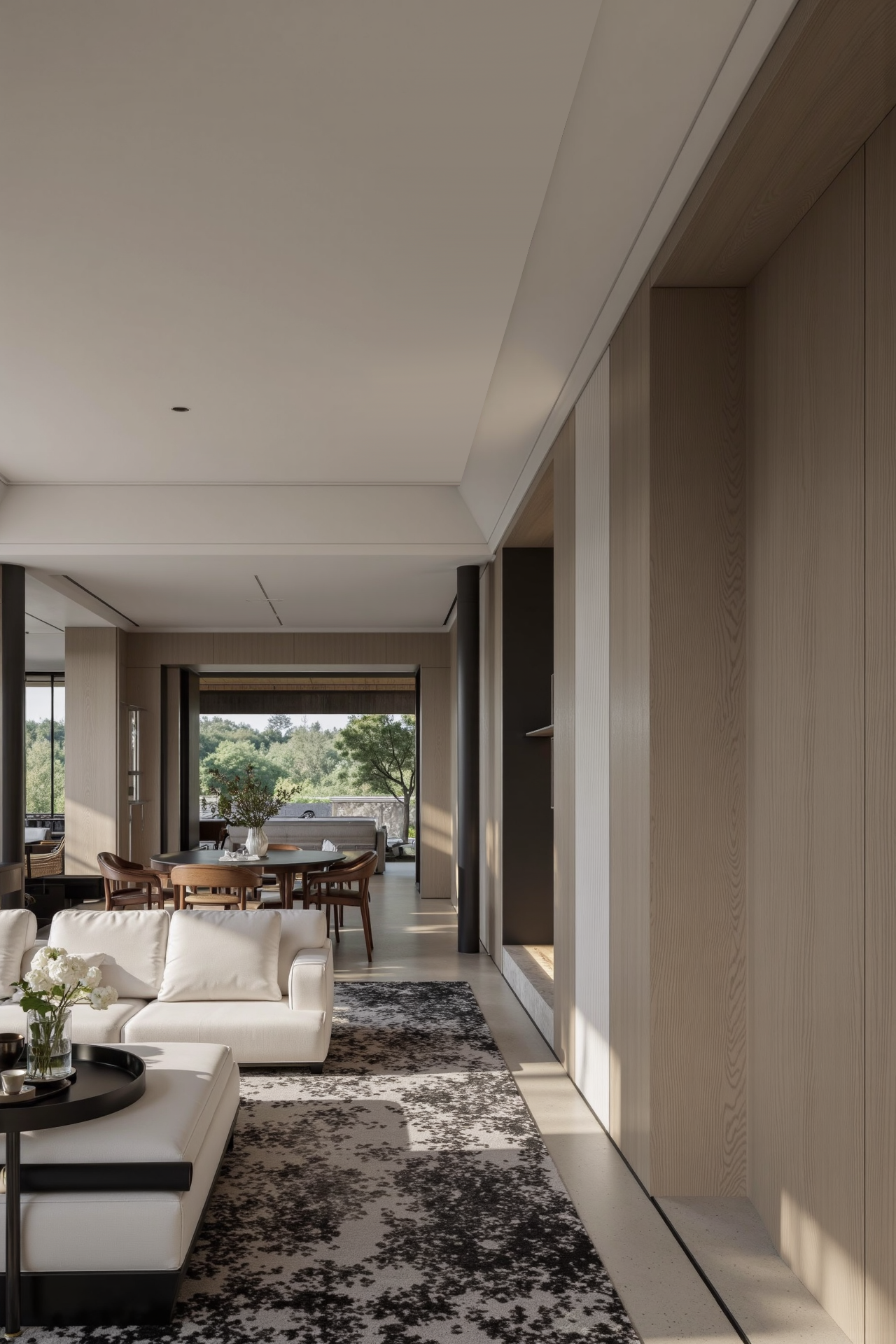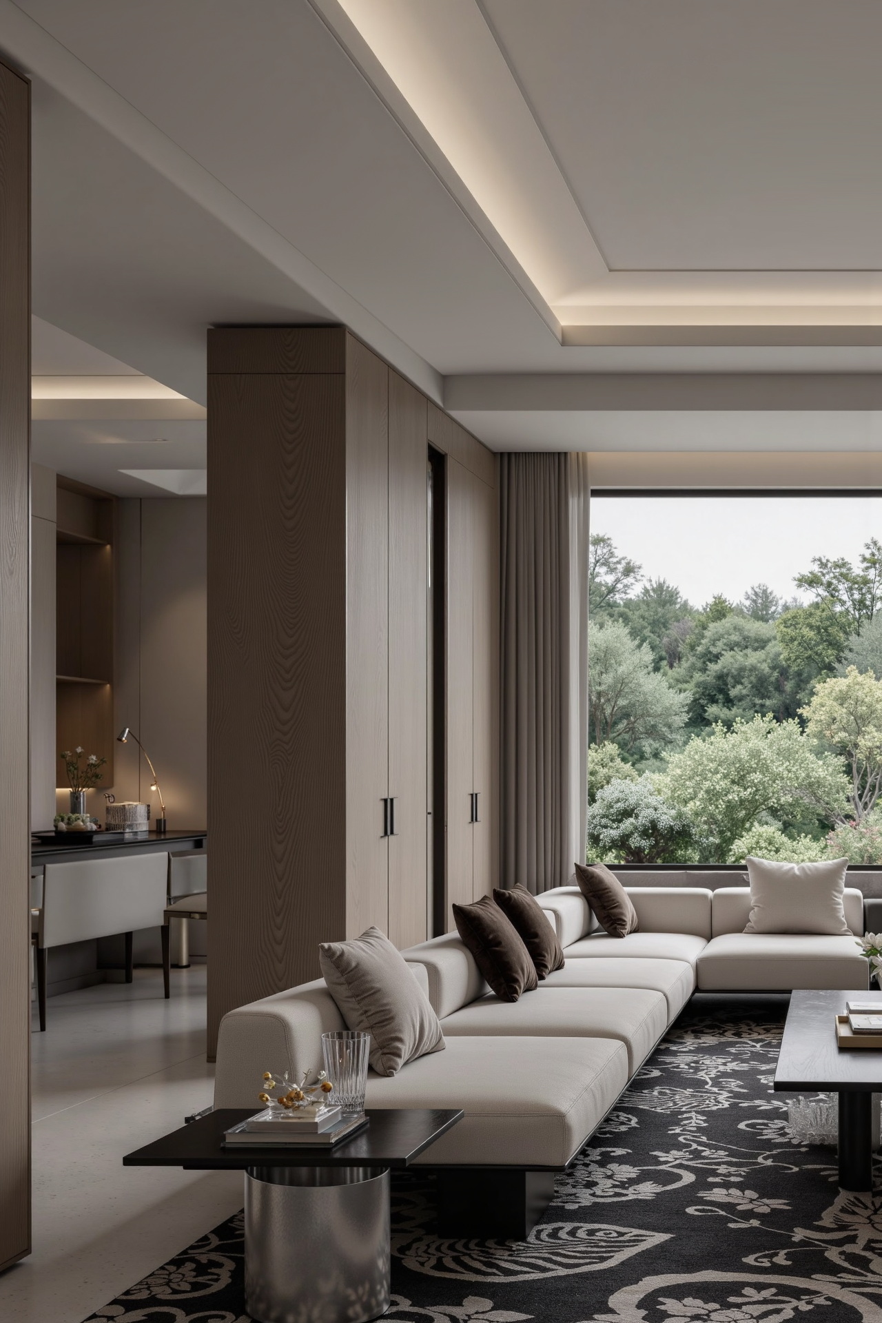 该现代风格别墅作品在环境风格上极具创新。一方面,打破室内外界限,采用大面积落地窗与可折叠玻璃门,将室外景观自然融入室内,模糊空间边界,使室内外浑然一体。另一方面,利用环保新型材料营造独特质感,如仿石纹的可再生板材,兼具美观与可持续性。再者,引入智能生态系统,精准调控温湿度与空气质量,同时搭配绿植墙,打造会 “呼吸” 的居住空间,为居住者带来自然、舒适且极具科技感的全新居住体验,彰显现代生活理念与艺术美学的完美融合。