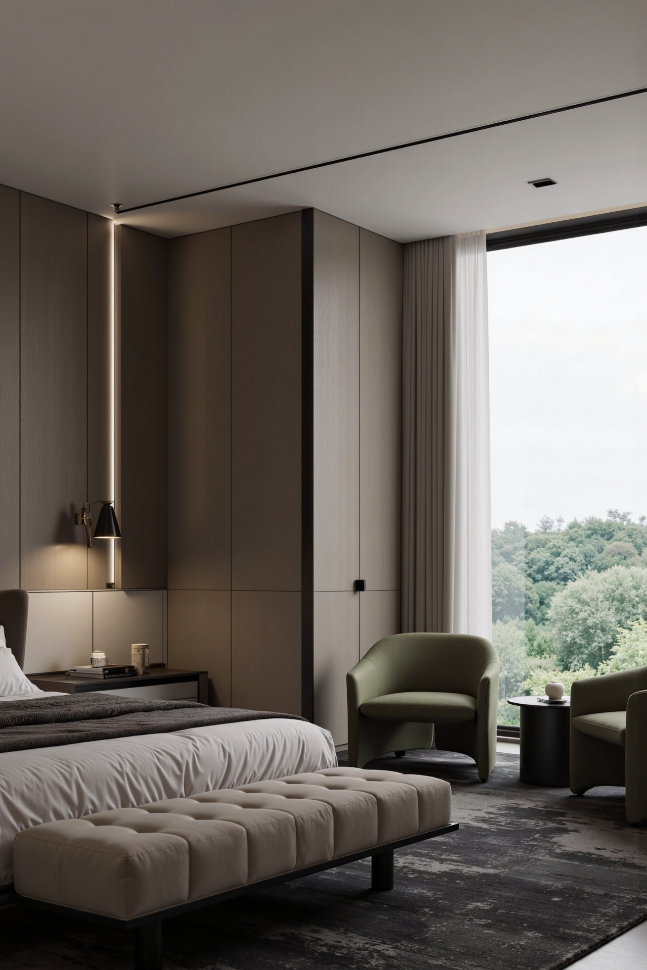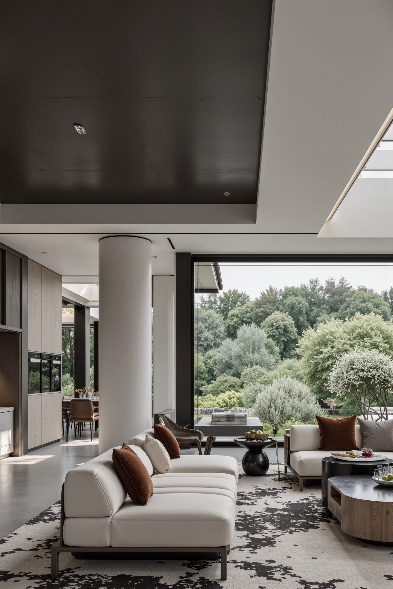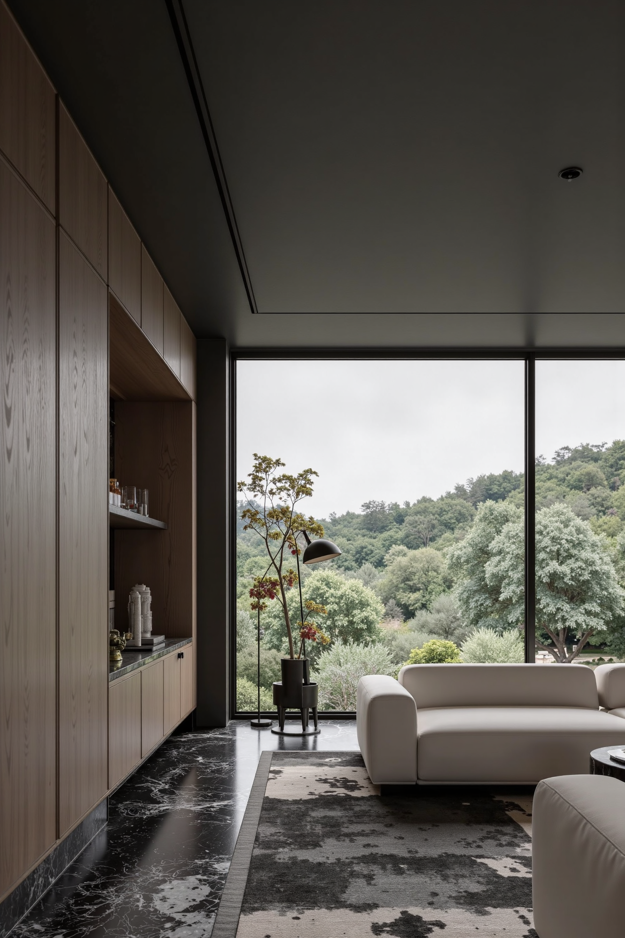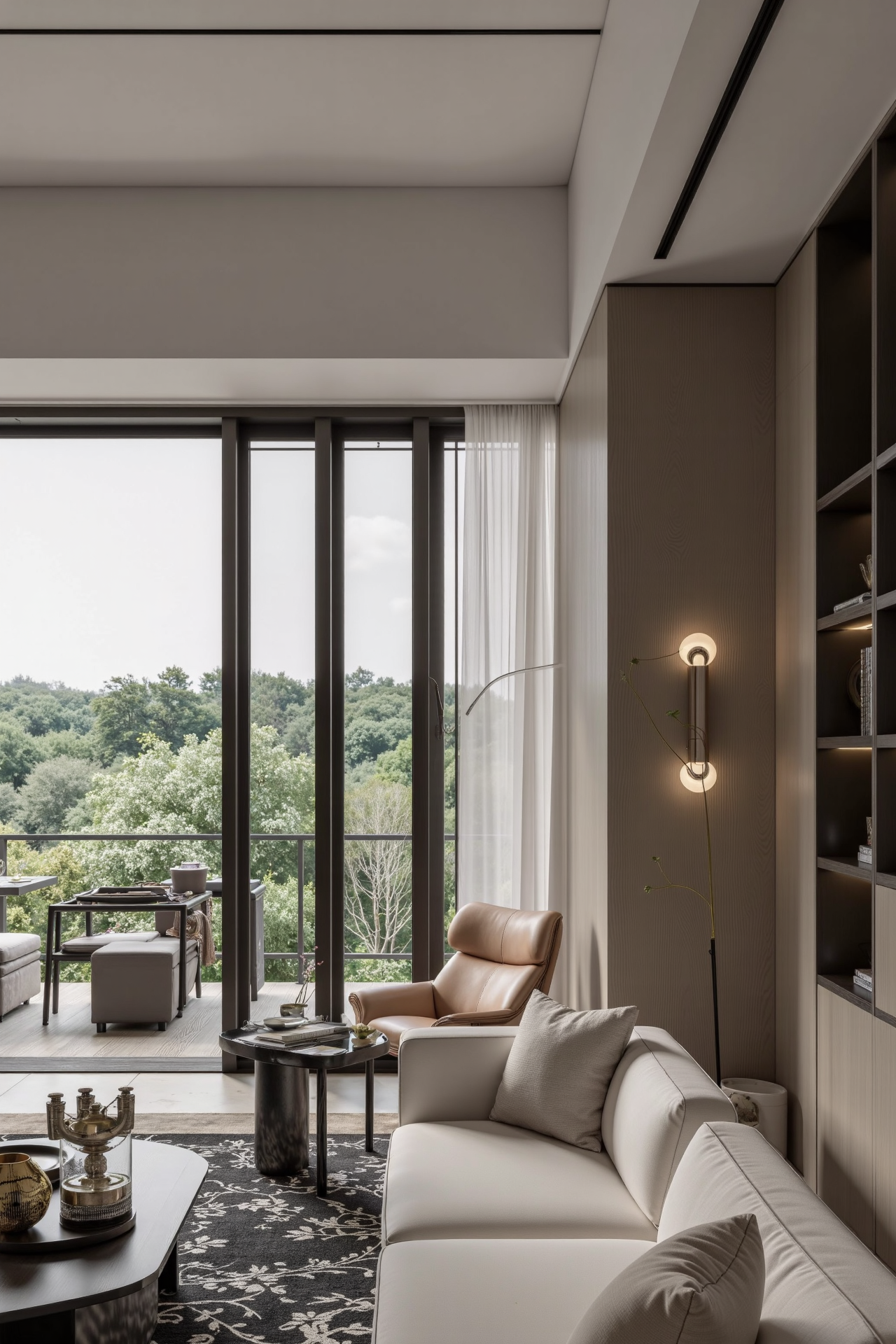 该现代风格别墅作品在环境风格上极具创新。一方面,打破室内外界限,采用大面积落地窗与可折叠玻璃门,将室外景观自然融入室内,模糊空间边界,使室内外浑然一体。另一方面,利用环保新型材料营造独特质感,如仿石纹的可再生板材,兼具美观与可持续性。再者,引入智能生态系统,精准调控温湿度与空气质量,同时搭配绿植墙,打造会 “呼吸” 的居住空间,为居住者带来自然、舒适且极具科技感的全新居住体验,彰显现代生活理念与艺术美学的完美融合。