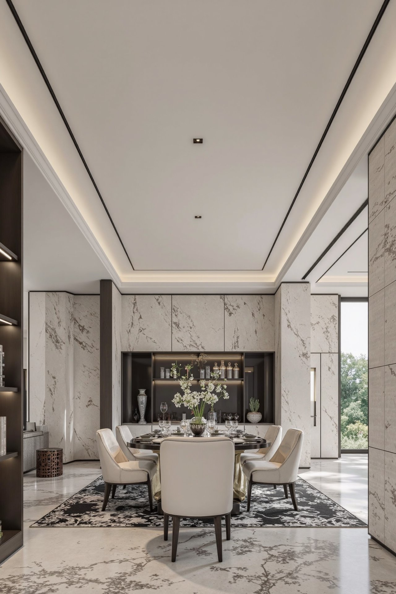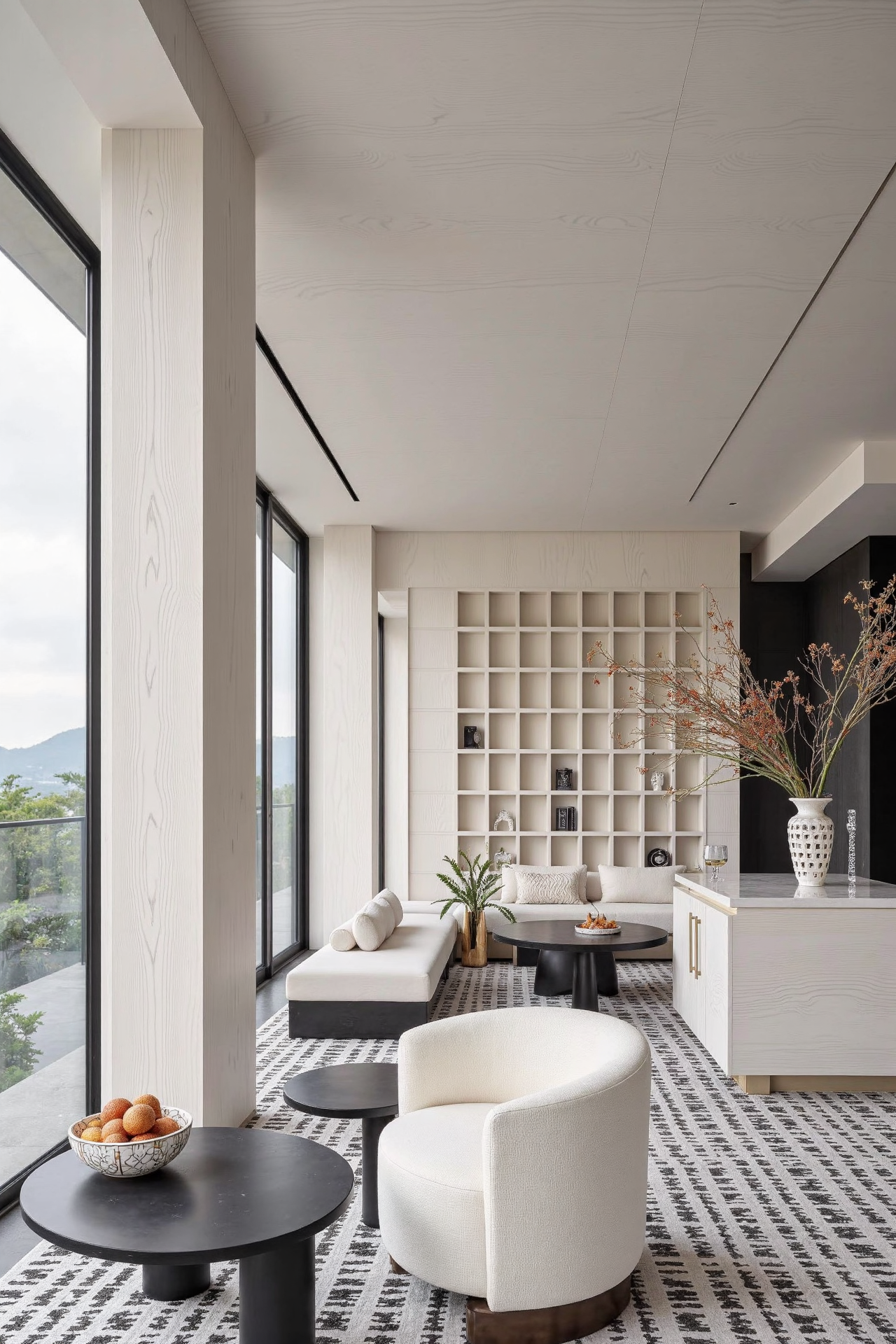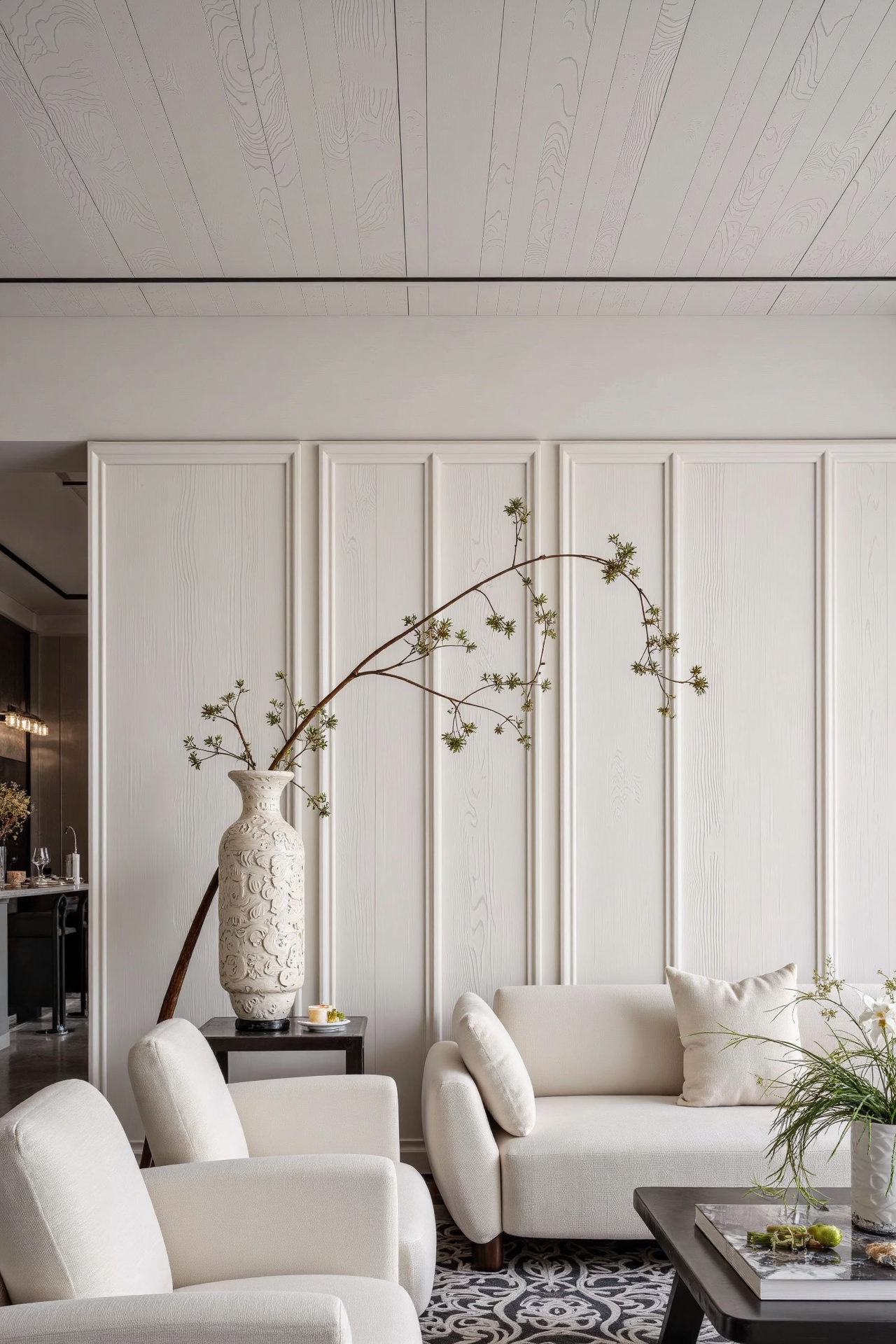 空间布局:本 200 平现代风格作品的空间布局独具创新。摒弃传统的独立房间划分,采用一体化开放式布局,客厅、餐厅、厨房通过巧妙的家具布置和地面材质的区分,形成连贯又独立功能的互动空间,增强家庭交流氛围。利用地台和玻璃隔断划分出多功能书房,既保证采光通透又独立静谧。同时,阳台被纳入室内,打造为休闲健身区,拓宽空间感。通过这些创新布局,使空间利用率大幅提升,各区域转换流畅自然,为居住者带来开阔、灵动且舒适的居住体验。