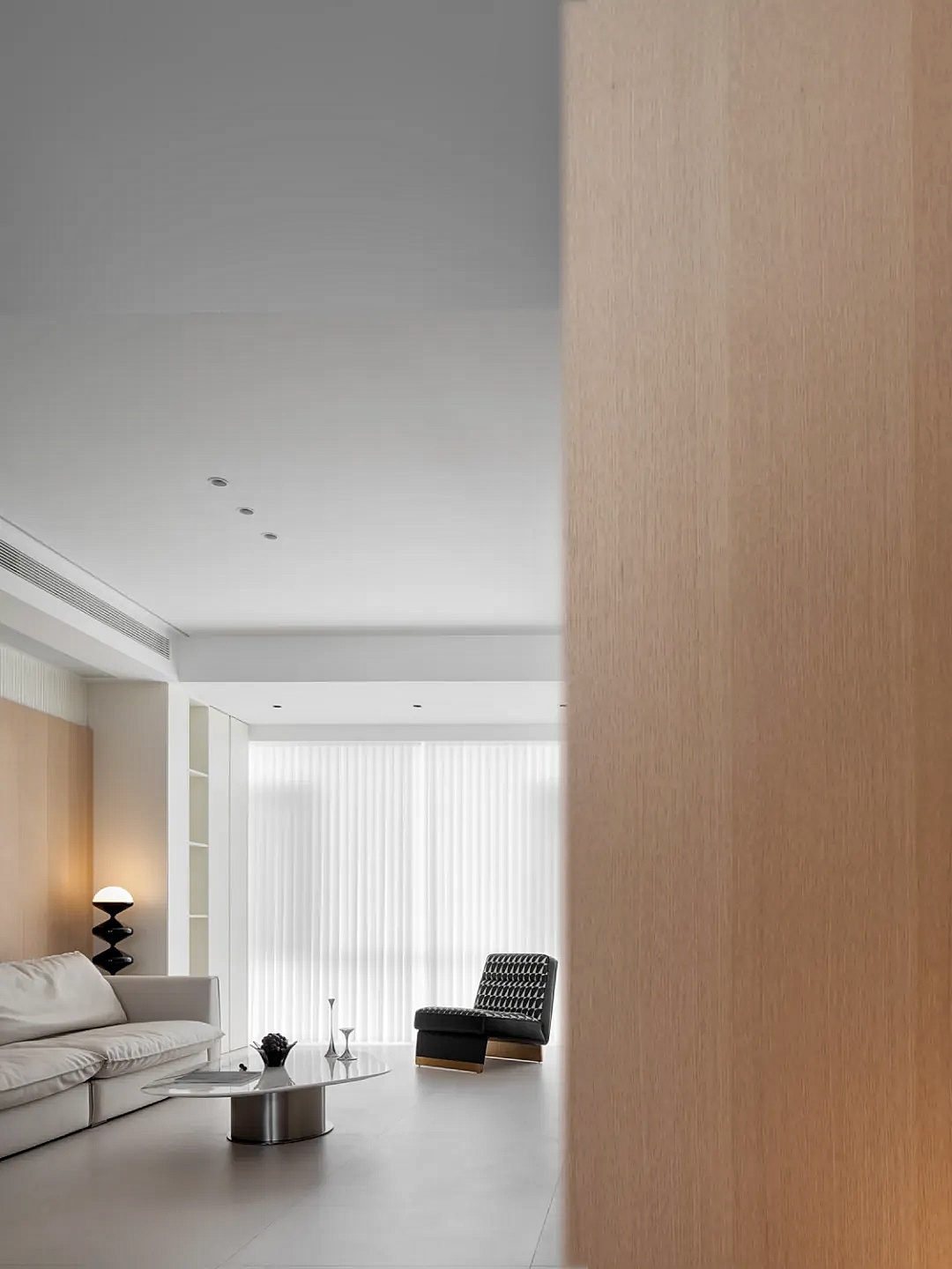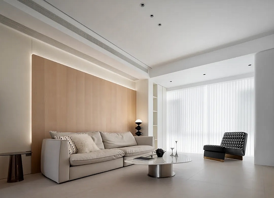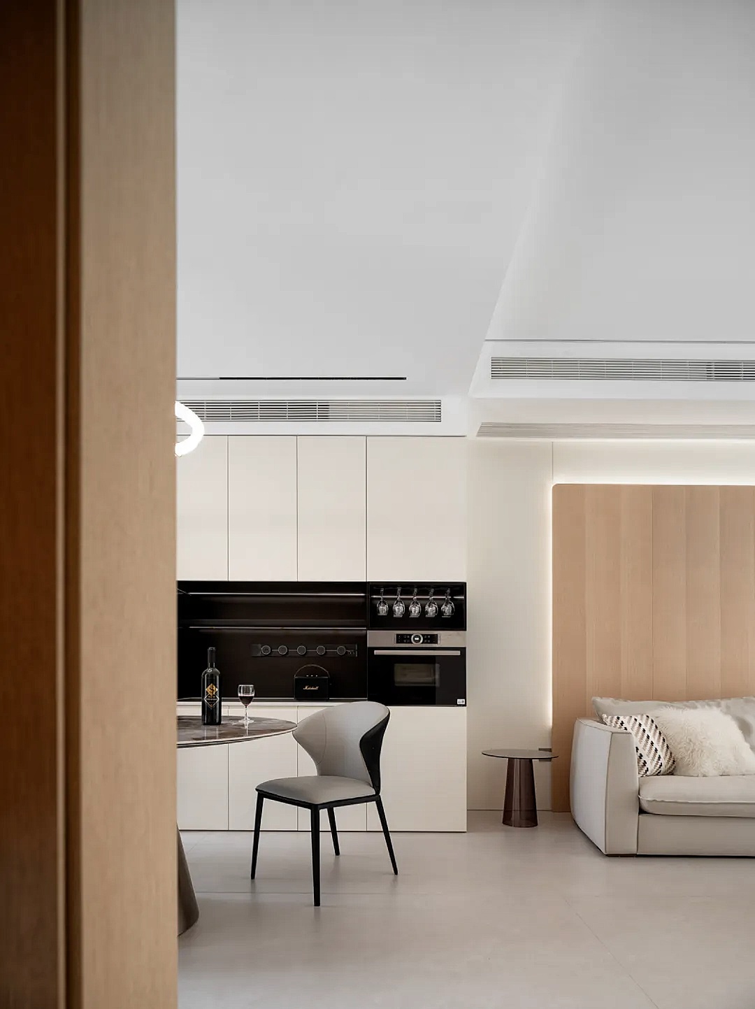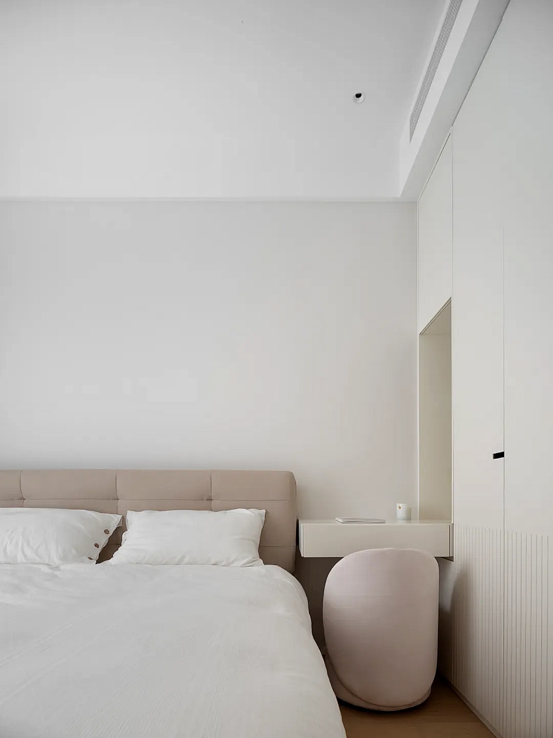 设计选材:内部采用了白色和原木色的经典配色,营造出优雅静谧的氛围。阳光透过无主灯设计的房间,让每一个角落都充满时尚元素和慵懒气息。