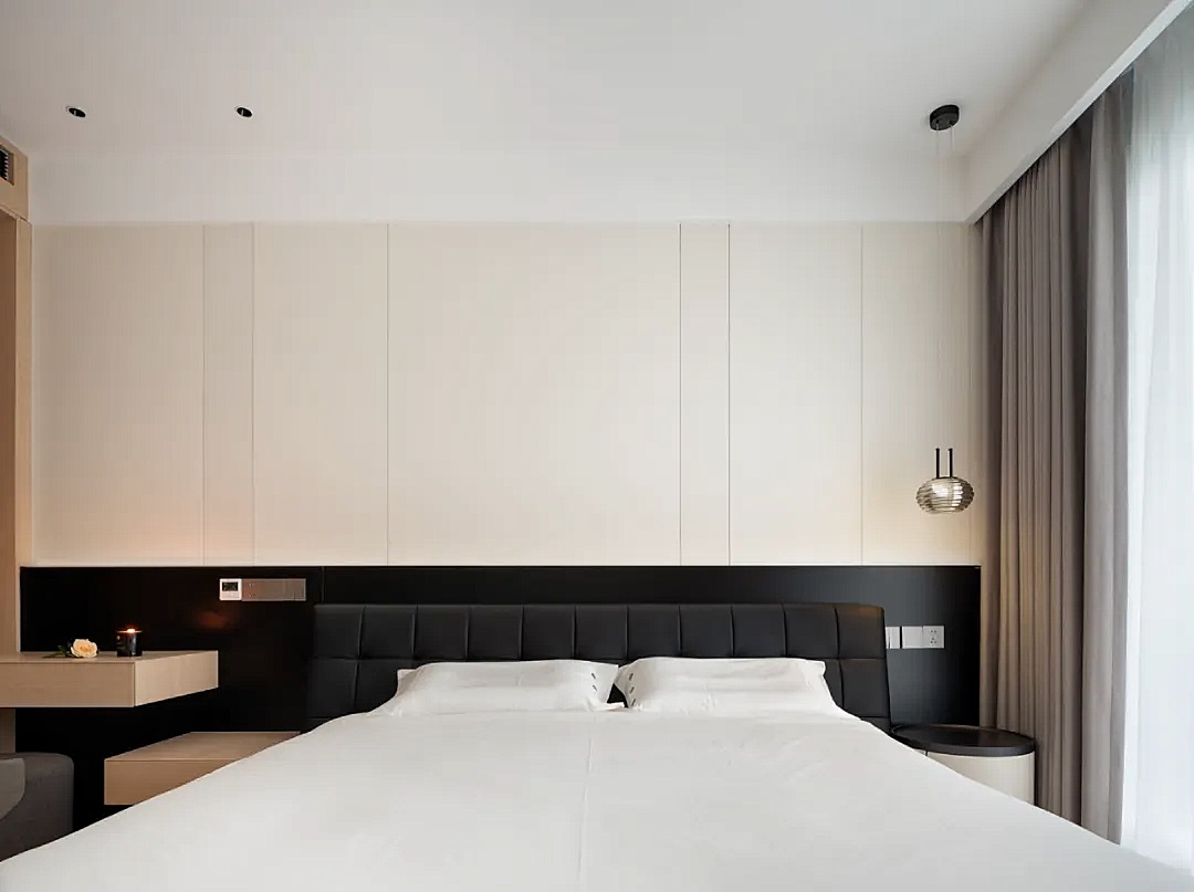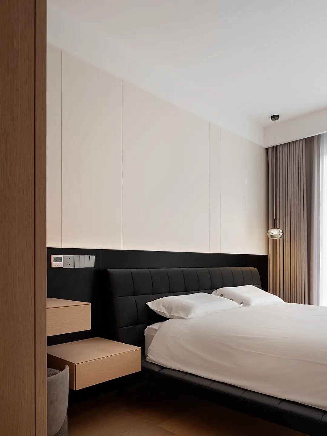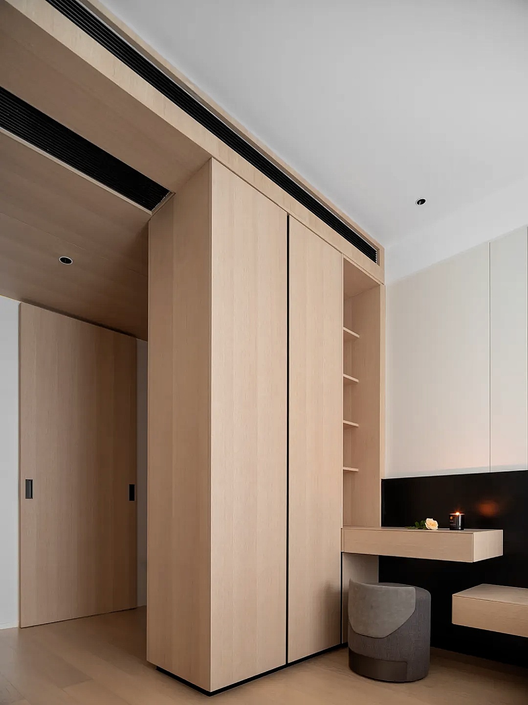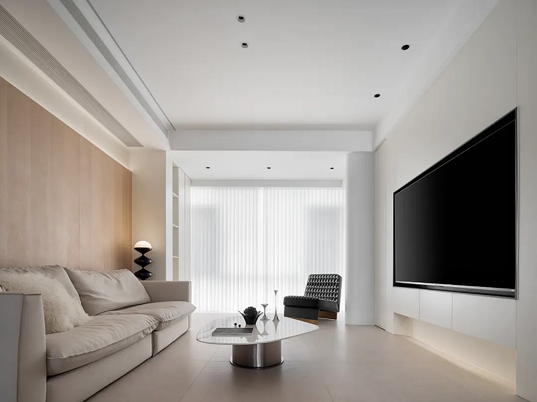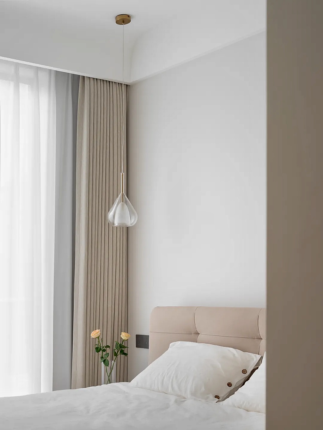 设计选材:内部采用了白色和原木色的经典配色,营造出优雅静谧的氛围。阳光透过无主灯设计的房间,让每一个角落都充满时尚元素和慵懒气息。