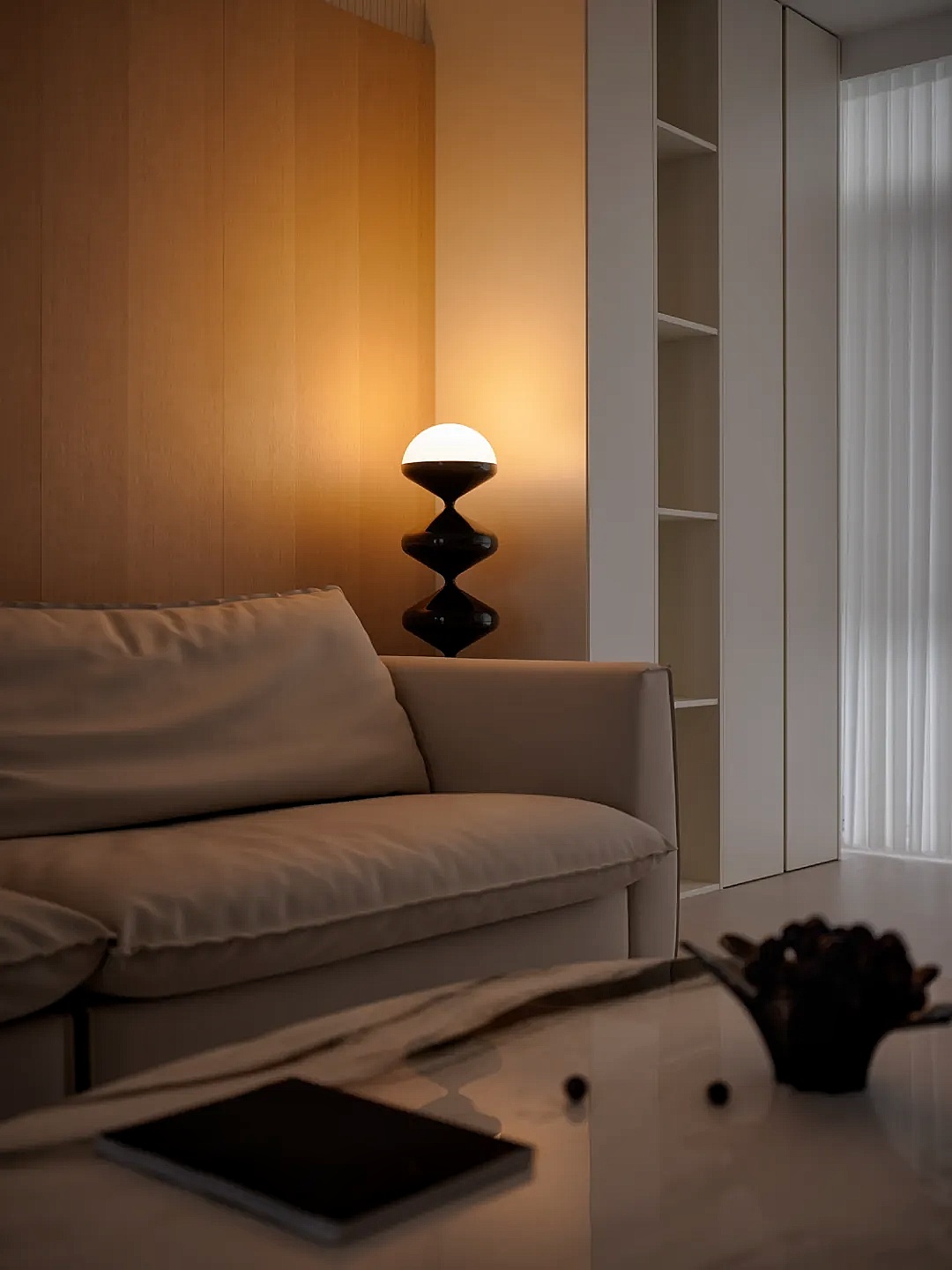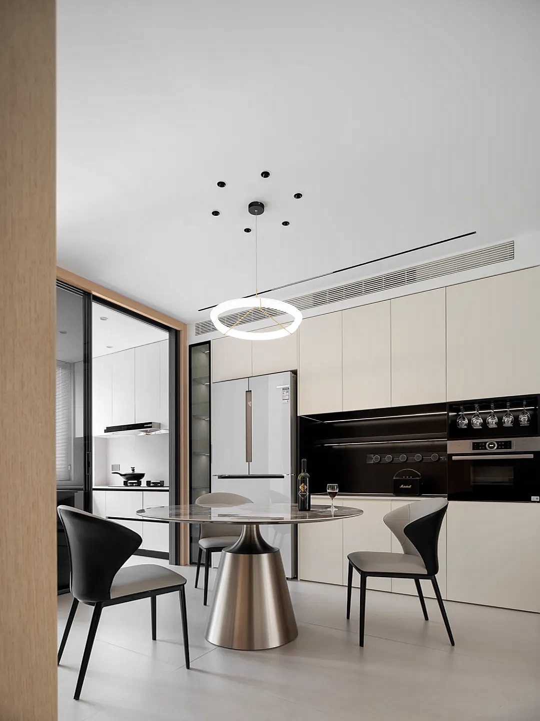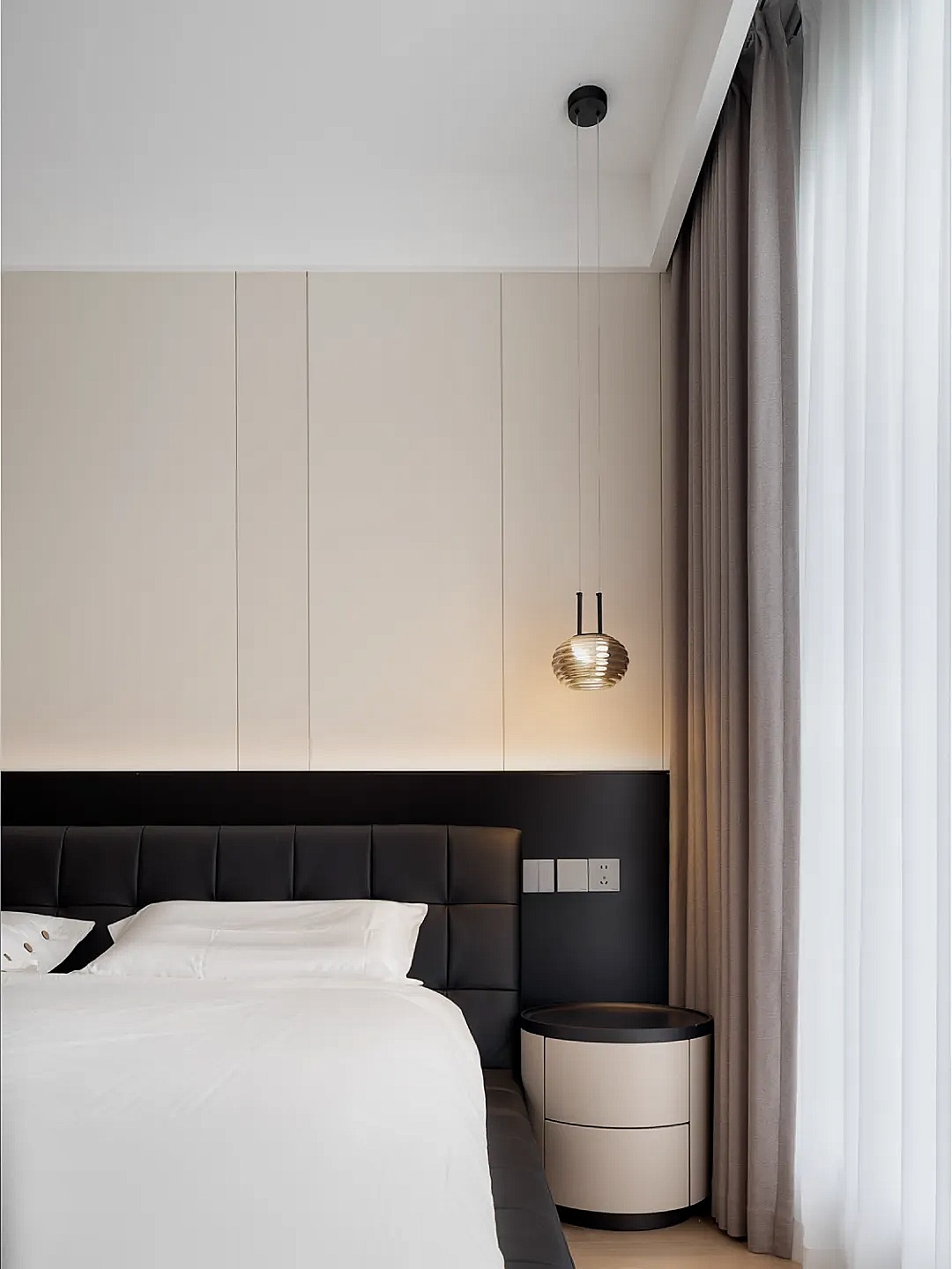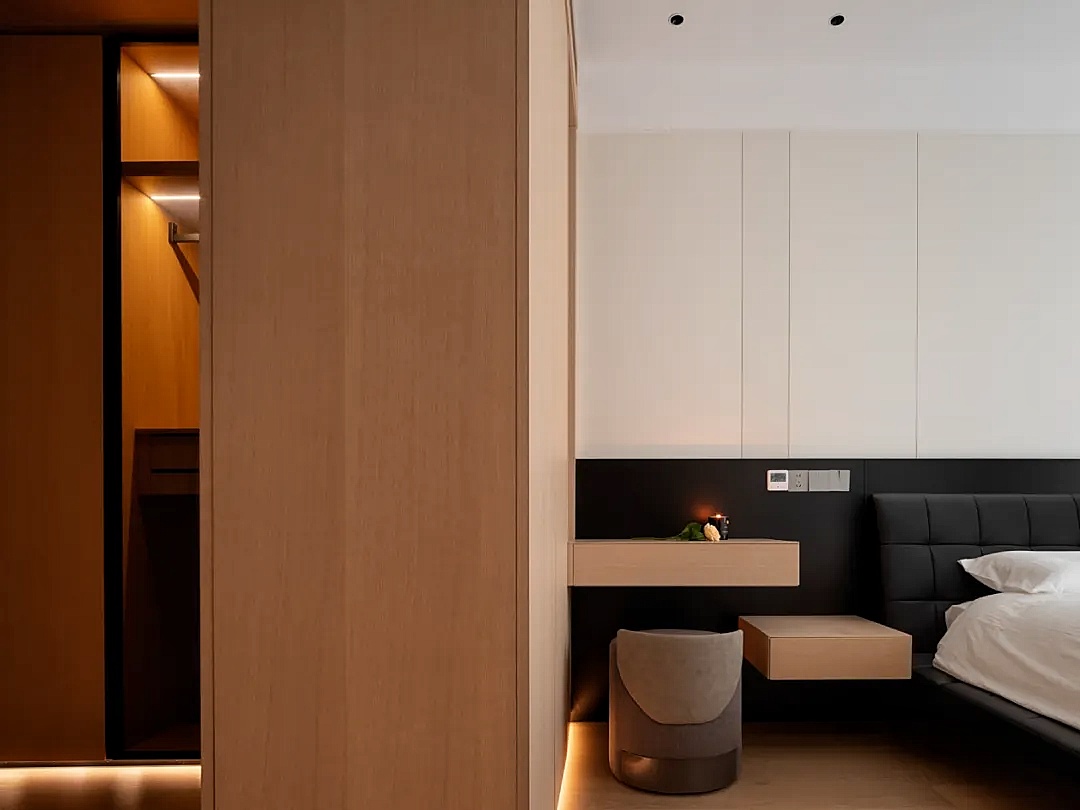 设计选材:内部采用了白色和原木色的经典配色,营造出优雅静谧的氛围。阳光透过无主灯设计的房间,让每一个角落都充满时尚元素和慵懒气息。