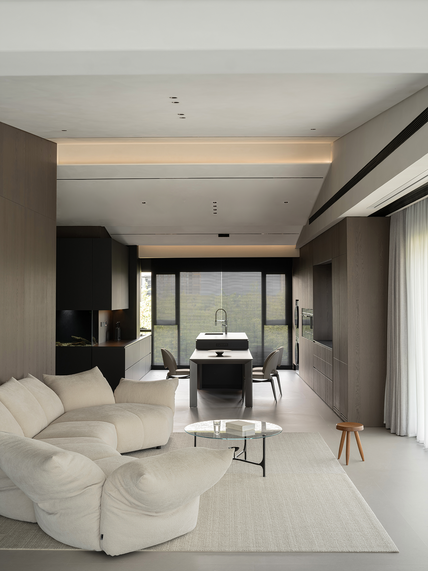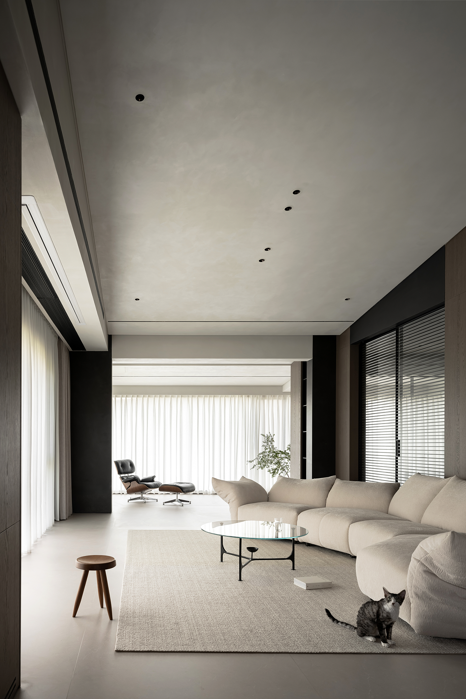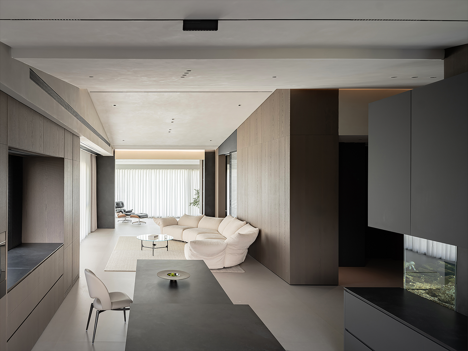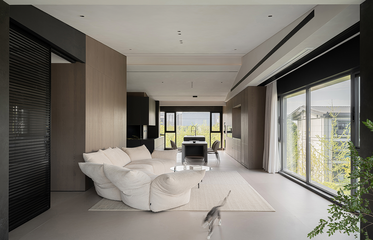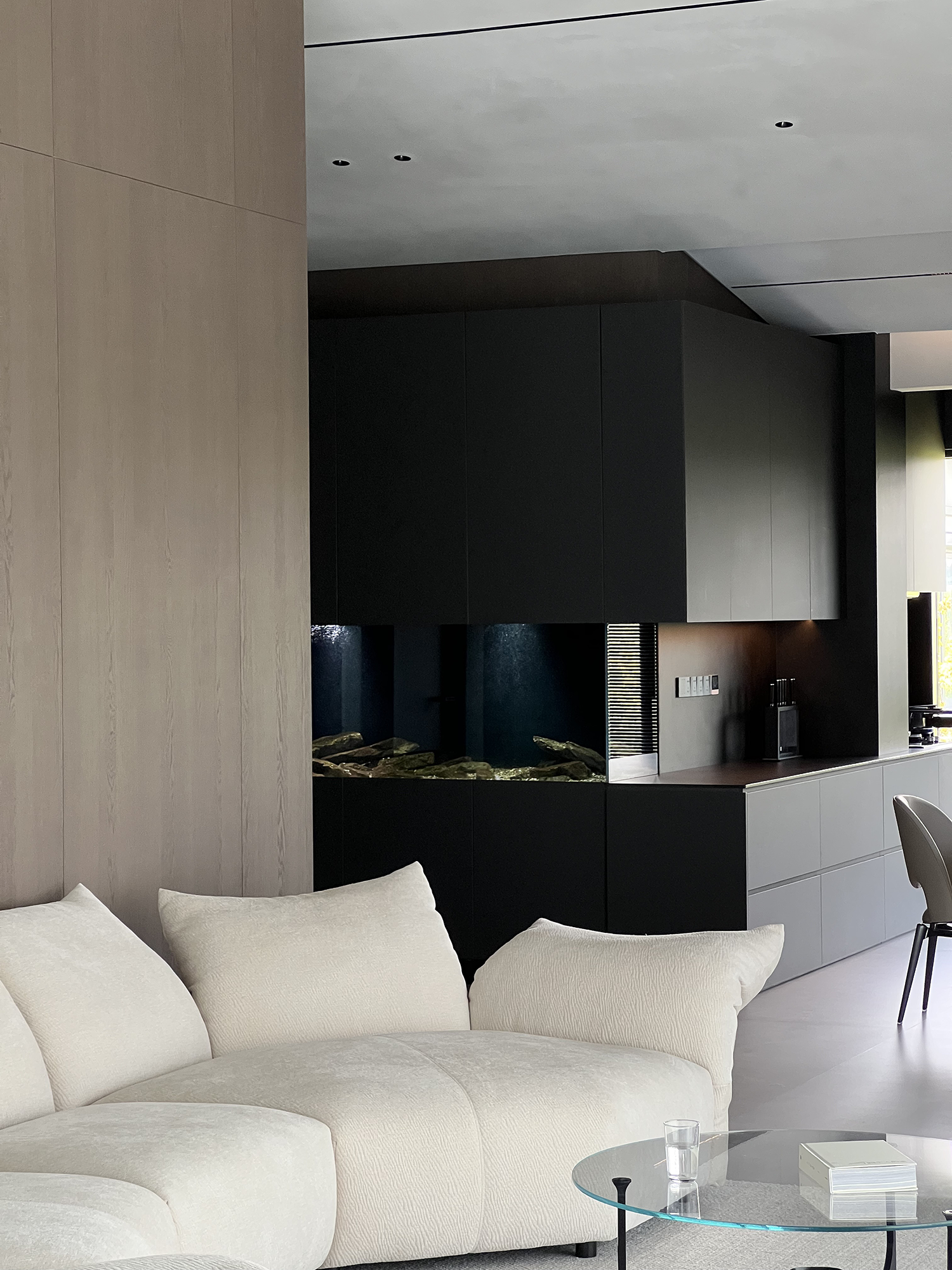 项目定位:屋主是土木工程学博士,购房时,他特意选了融创国宾雅集这套有着缓坡人字形斜屋顶的238㎡户型,他希望这次装修,不仅要发挥出建筑结构的最大优势,同时在意式极简的风格下,打造出一个能够自在养鱼逗猫,包容未来生活变化的温暖明净的家。
