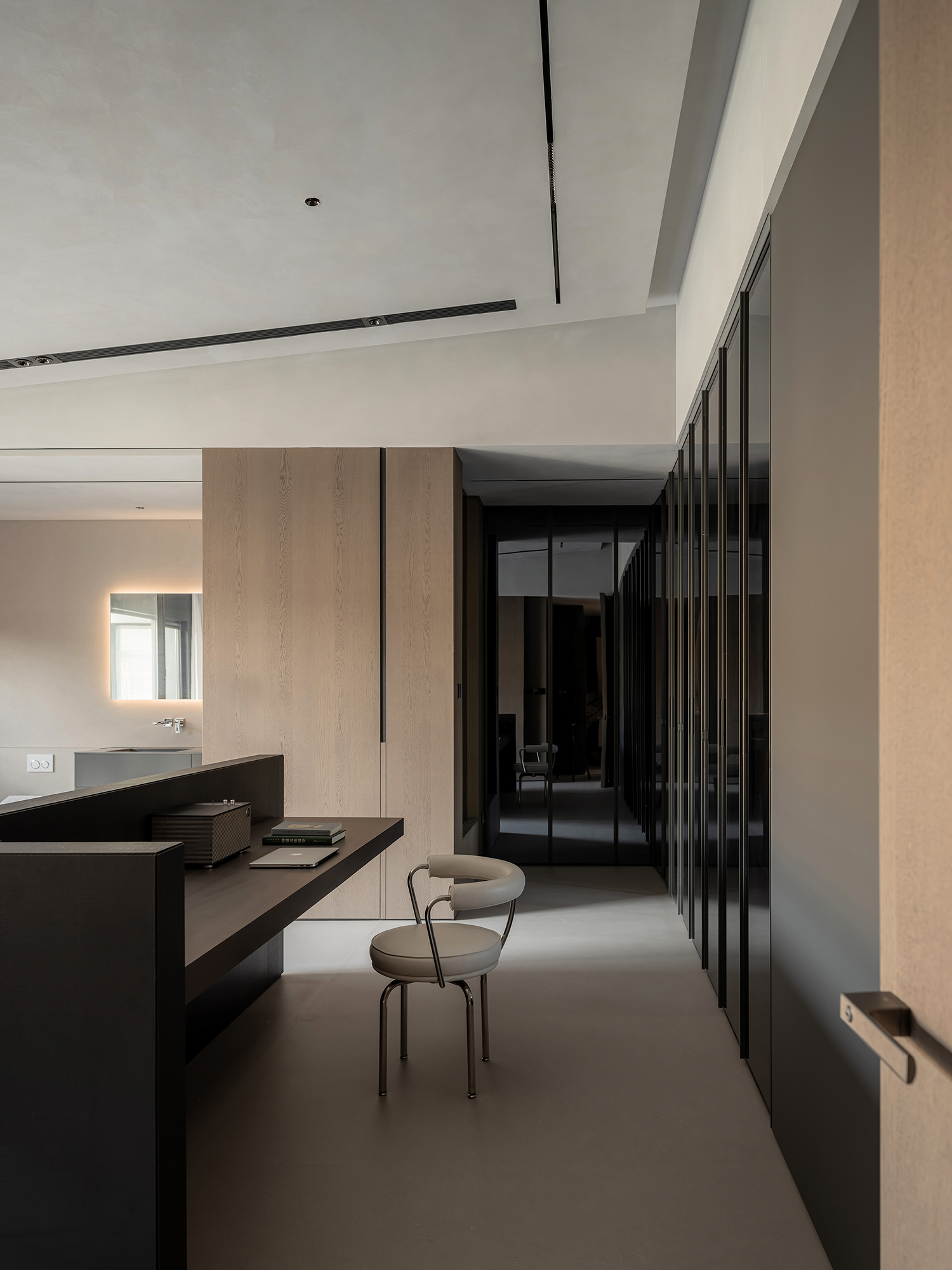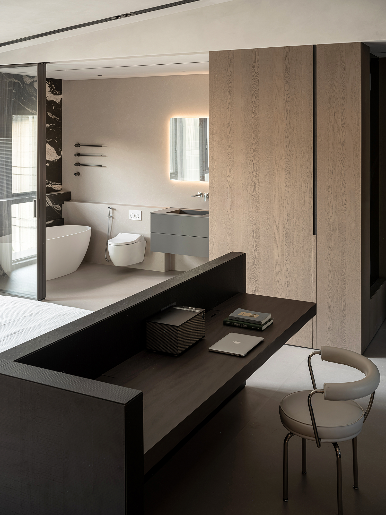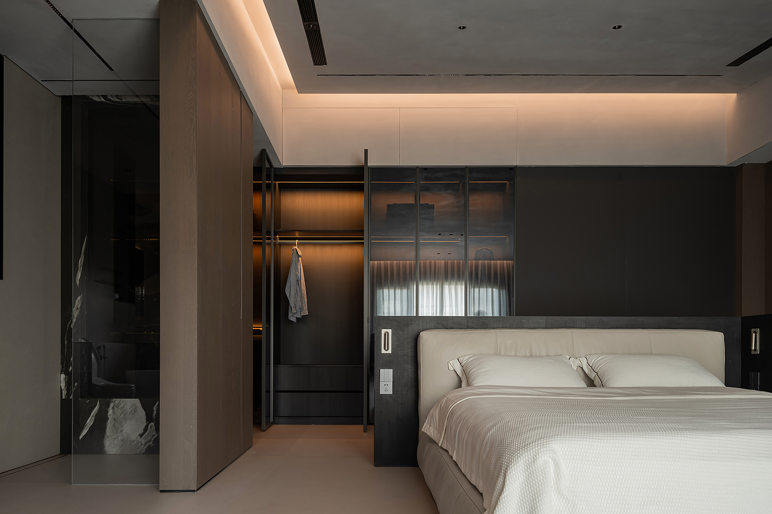 改变卫生间和衣帽间格局,设置开放式卫生间,让整体空间最大化。 -