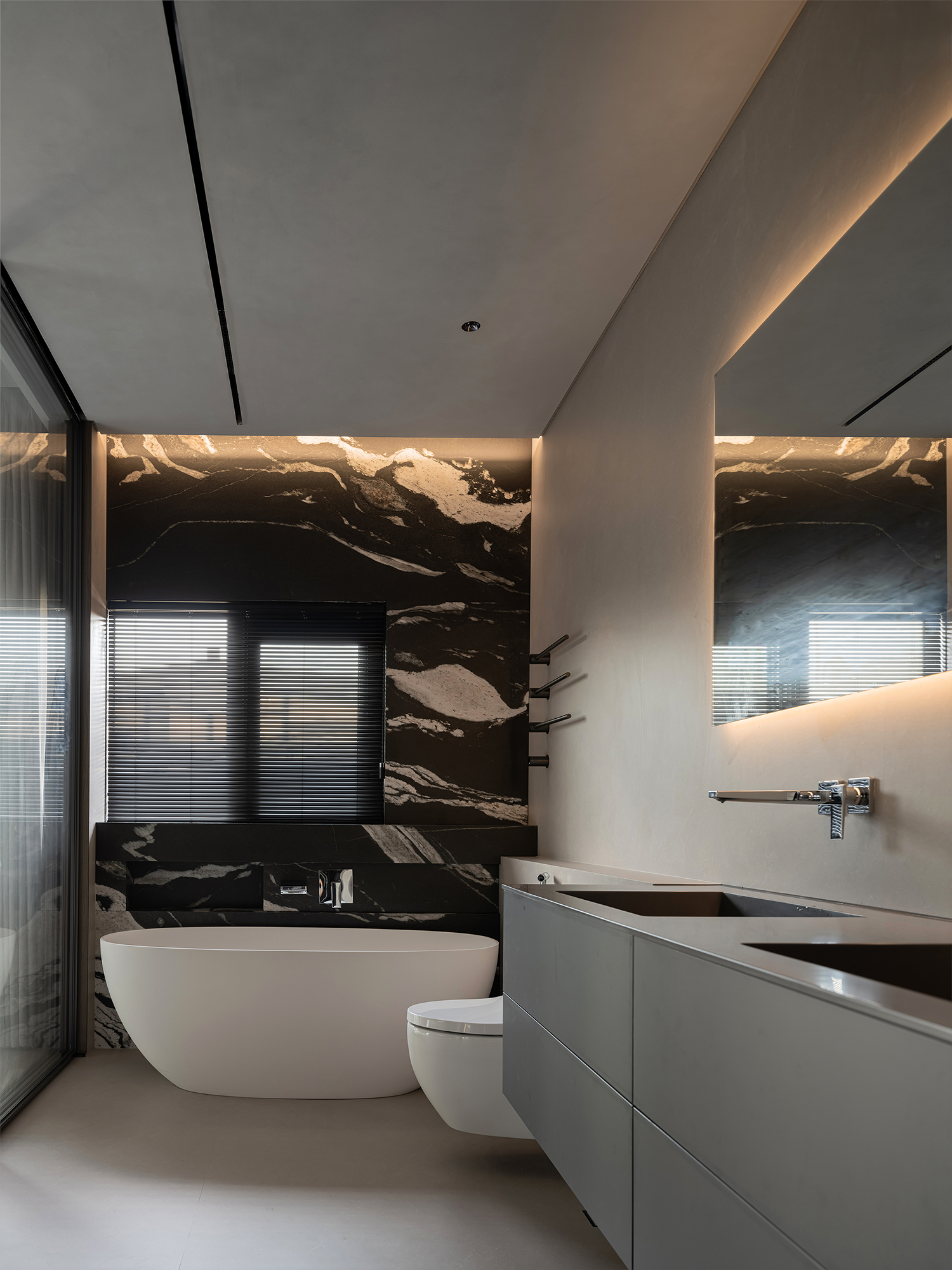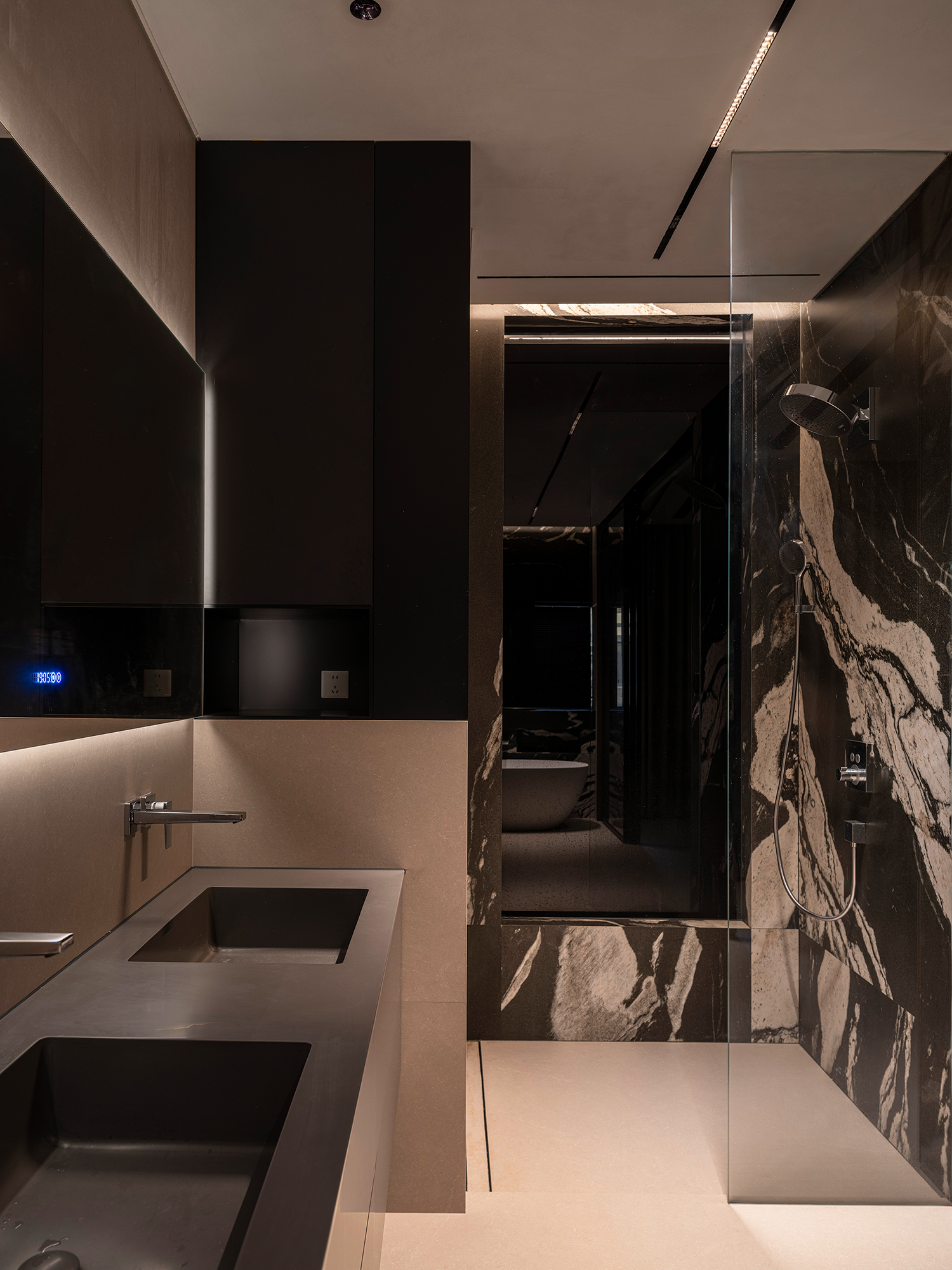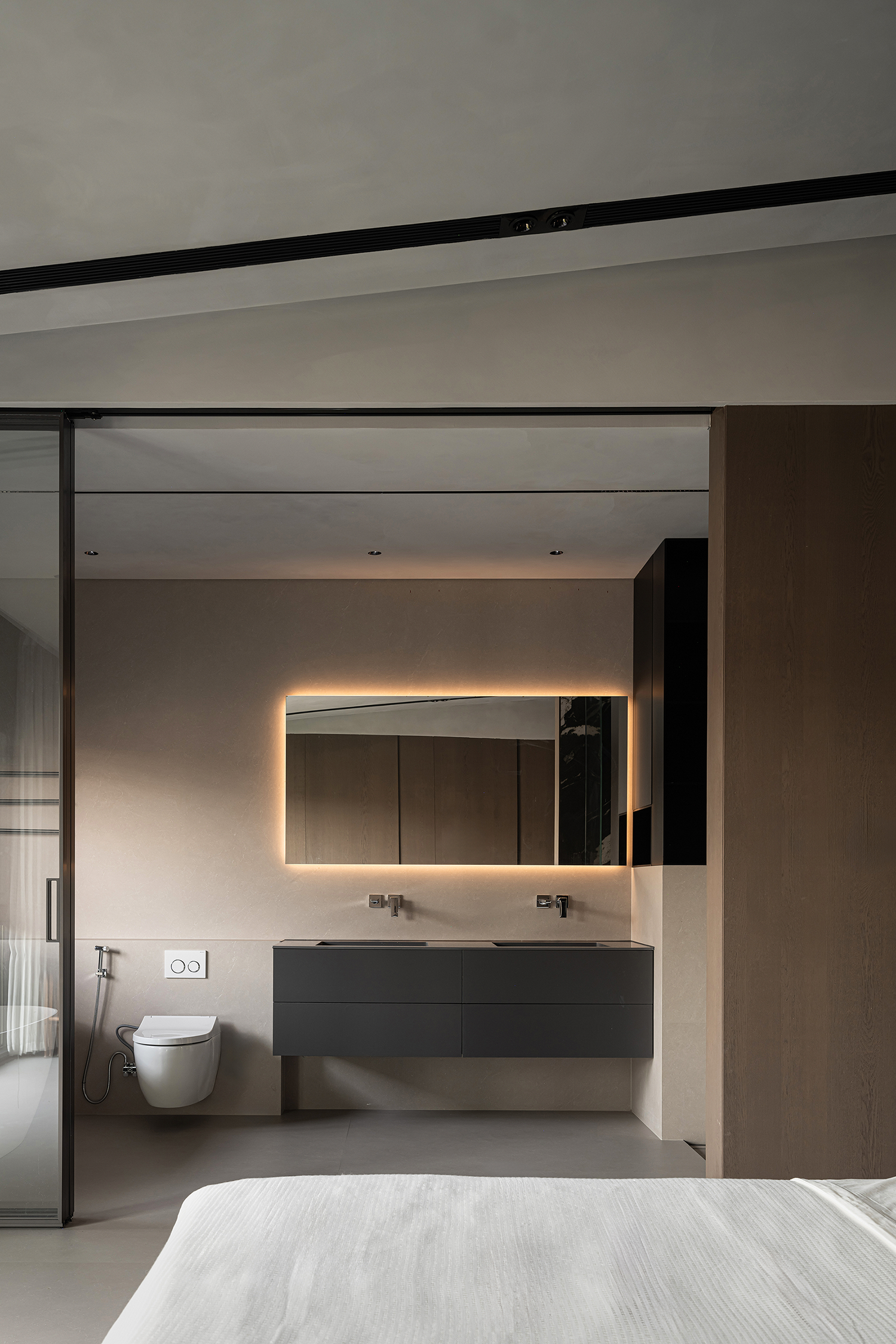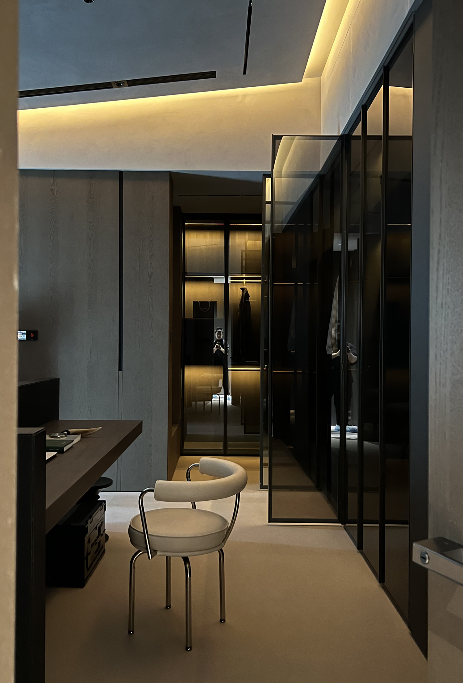改变卫生间和衣帽间格局,设置开放式卫生间,让整体空间最大化。 -
